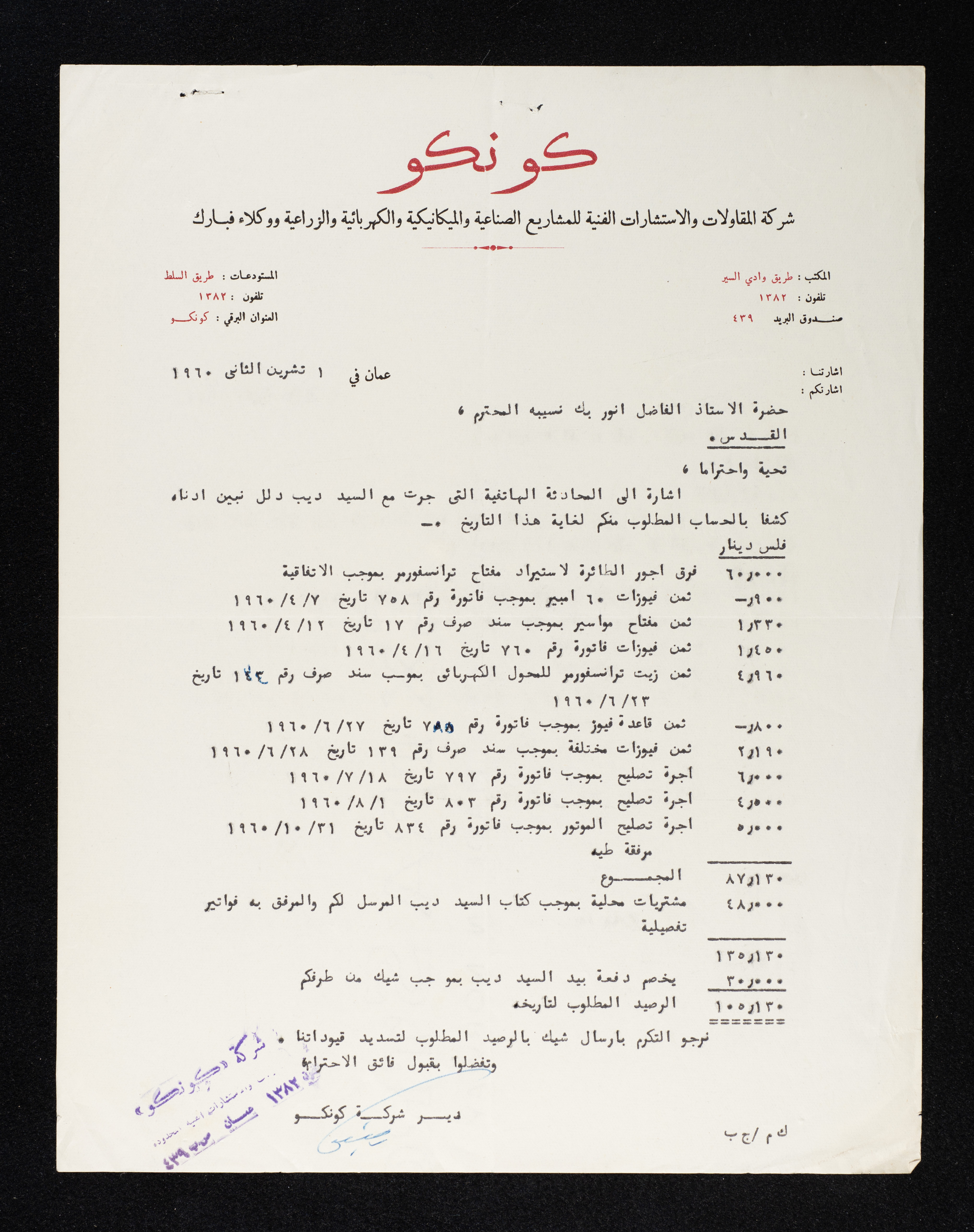 مطالبة مالية صادرة عن شركة "كونكو" وهي شركة مقاولات واستشارات فنية للمشاريع الصناعية والميكانيكية والكهربائية والزراعية ووكلاء فبارك، موجهة لأنور نسيبة وعنوانه القدس في الأول من تشرين الثاني 1960، كتب فيها جميع المشتريات والخدمات التي قدمتها الشركة لنسيبة مع تكلفتها بالدينار، ليكون مجموع المطلوب منه 105 دنانير أردنية و130 فلس، ويرجوا منه التكرم بارسال شيك بالرصيد المطلوب لتسديد قيوداتهم.