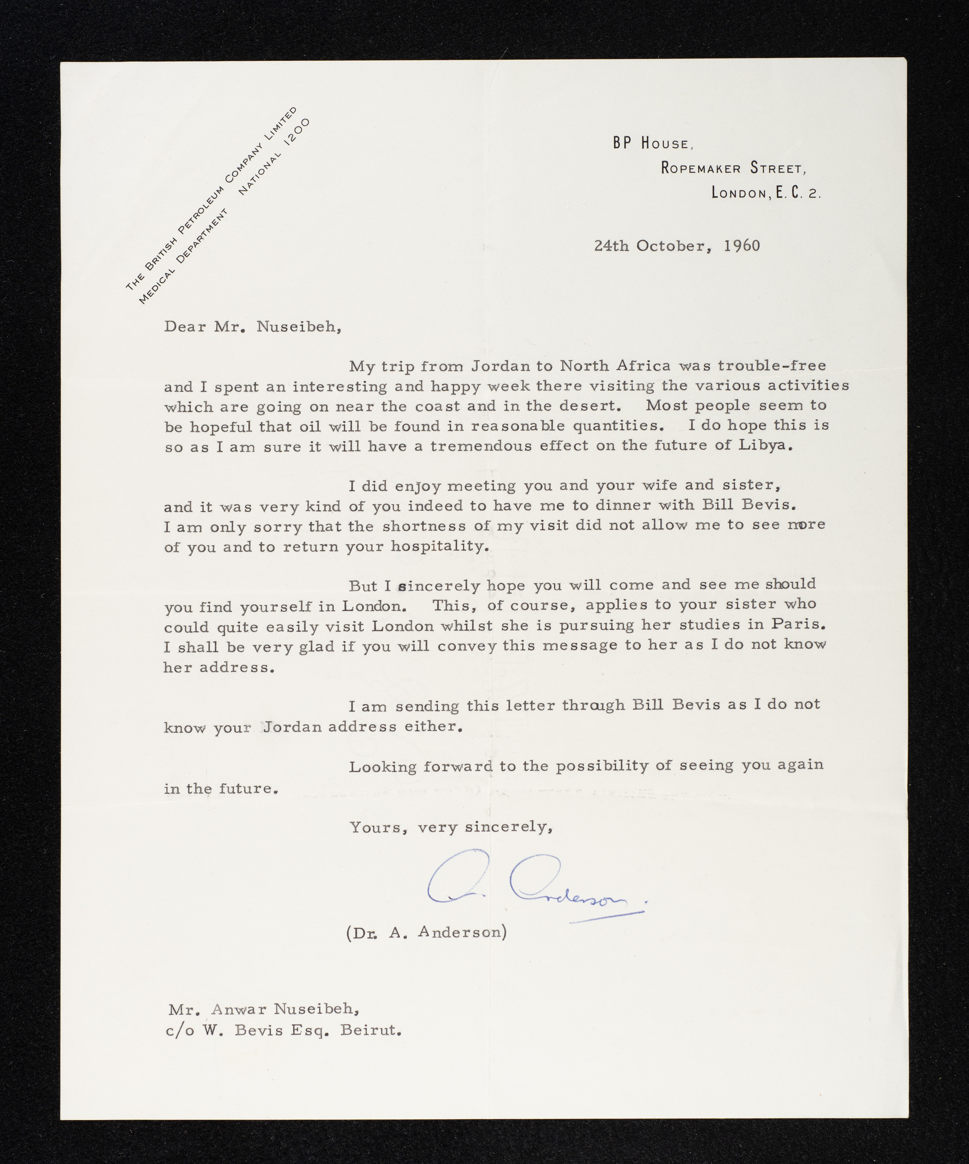 وثيقة مطبوعة باللغة الإنجليزية وجدت ضمن مجموعة سري نسيبة وتعود لوالده أنور نسيبة، تبين رسالة مؤرخة في 24 تشرين الأول 1960، من أ. آنديرسون في لندن إلى أنور نسيبة في بيروت، يحدثه فيها عن رحلته من الأردن إلى جنوب إفريقيا، حيث يقول إنها كانت حافلة بالأنشطة المختلفة، ثم يعبر عن امتنانه تجاه نسيبة وزوجته على حسن استقبالهم له على وجبة العشاء برفقة بيل بايفيس، ويأمل أن يزورانه يومًا في لندن وأن يصطحب أخته برفقته، حيث يمكنها القدوم بسهولة لأنها تكمل دراستها في العاصمة الفرنسية باريس، وينهي رسالته بالتأكيد على تمرير رسالته عبر بيل بايفيس؛ إذ إنه ليس على علم بعنوان نسيبة في الأردن ويعبر عن أشواقه للقاءٍ آخر يجمعهم.