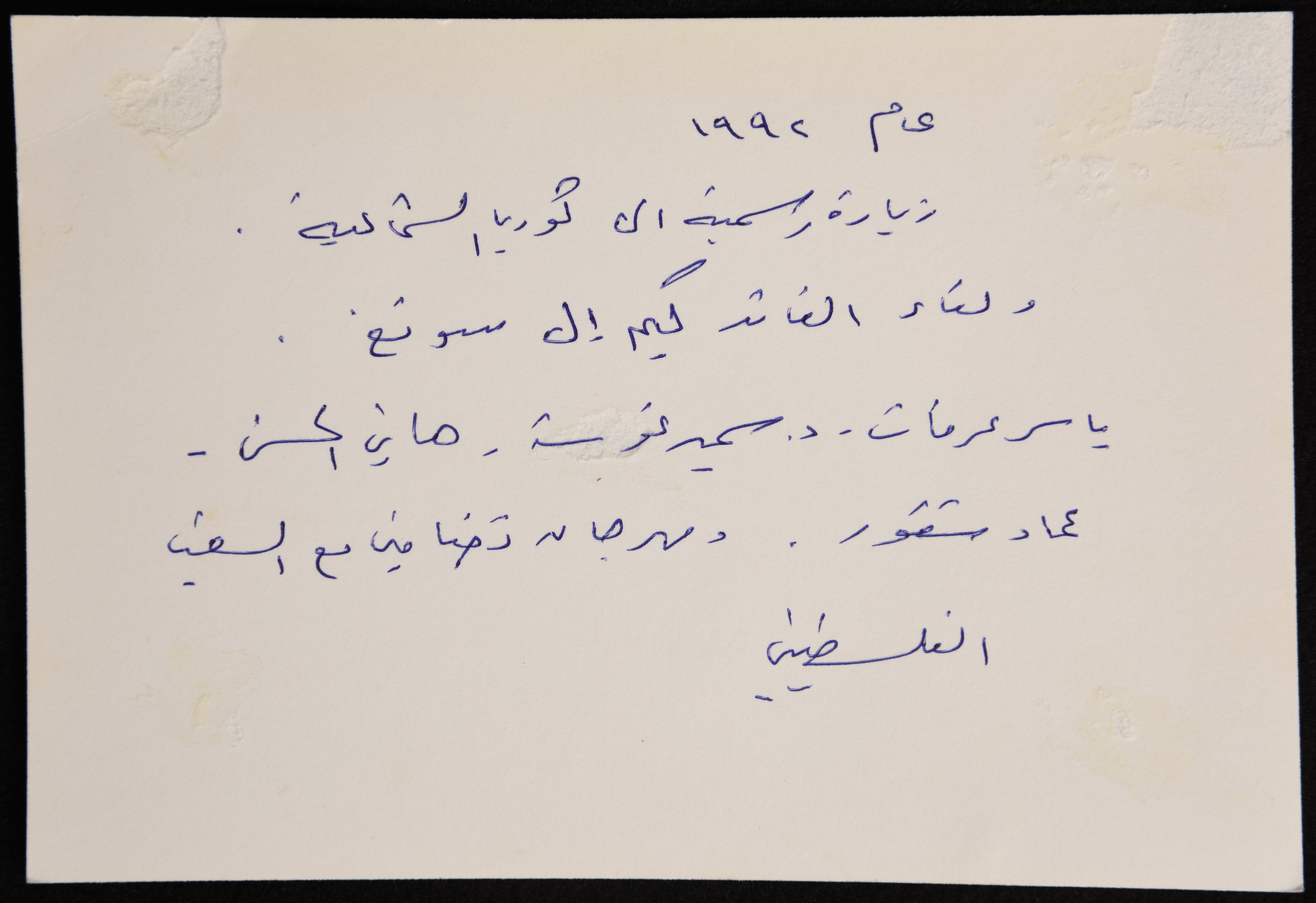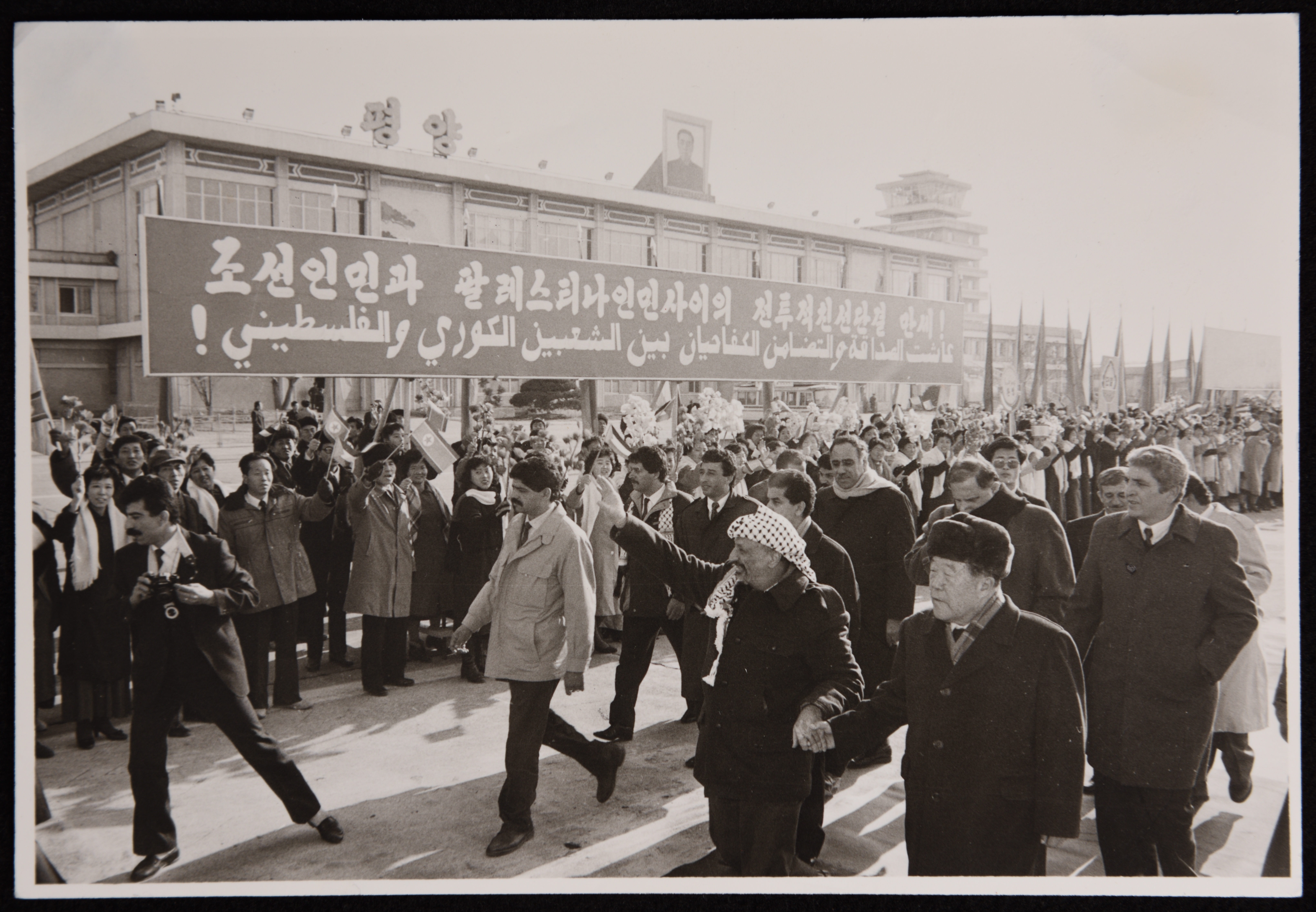 صورة ملونة يظهر فيها الدكتور سمير غوشة خلال زيارة رسمية الى كوريا الشمالية ضمن مهرجان تضامني مع الشعب الفلسطيني و برفقة ياسر عرفات وهاني الحسن وعماد شقور، عقب لقاء القائد الكوري كيم ال سونغ