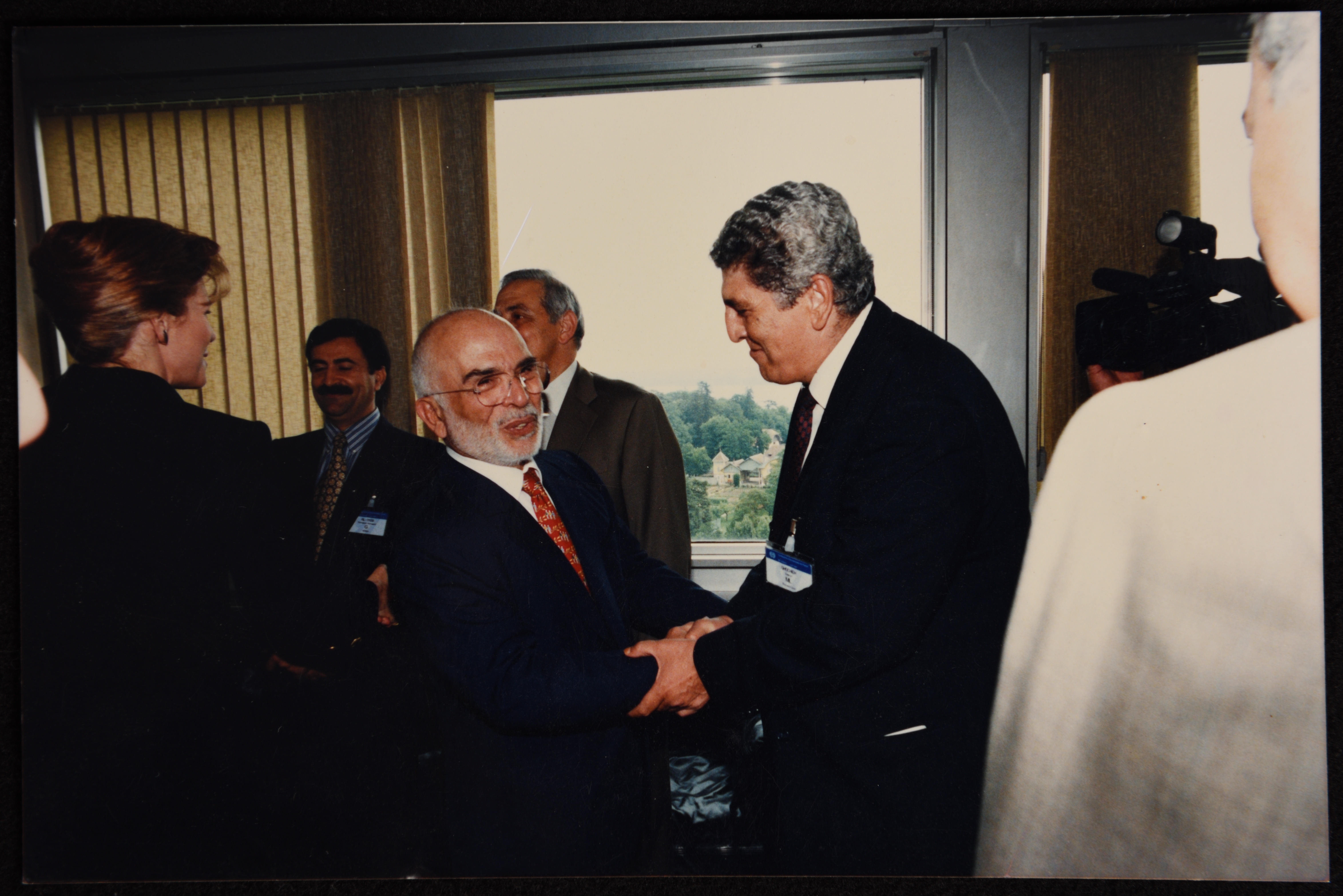 صورة ملونة يظهر فيها الدكتور سمير غوشة برفقة الملك حسين والملكة نور الحسين خلال افتتاح مؤتمر السياحة والسفر في الاردن