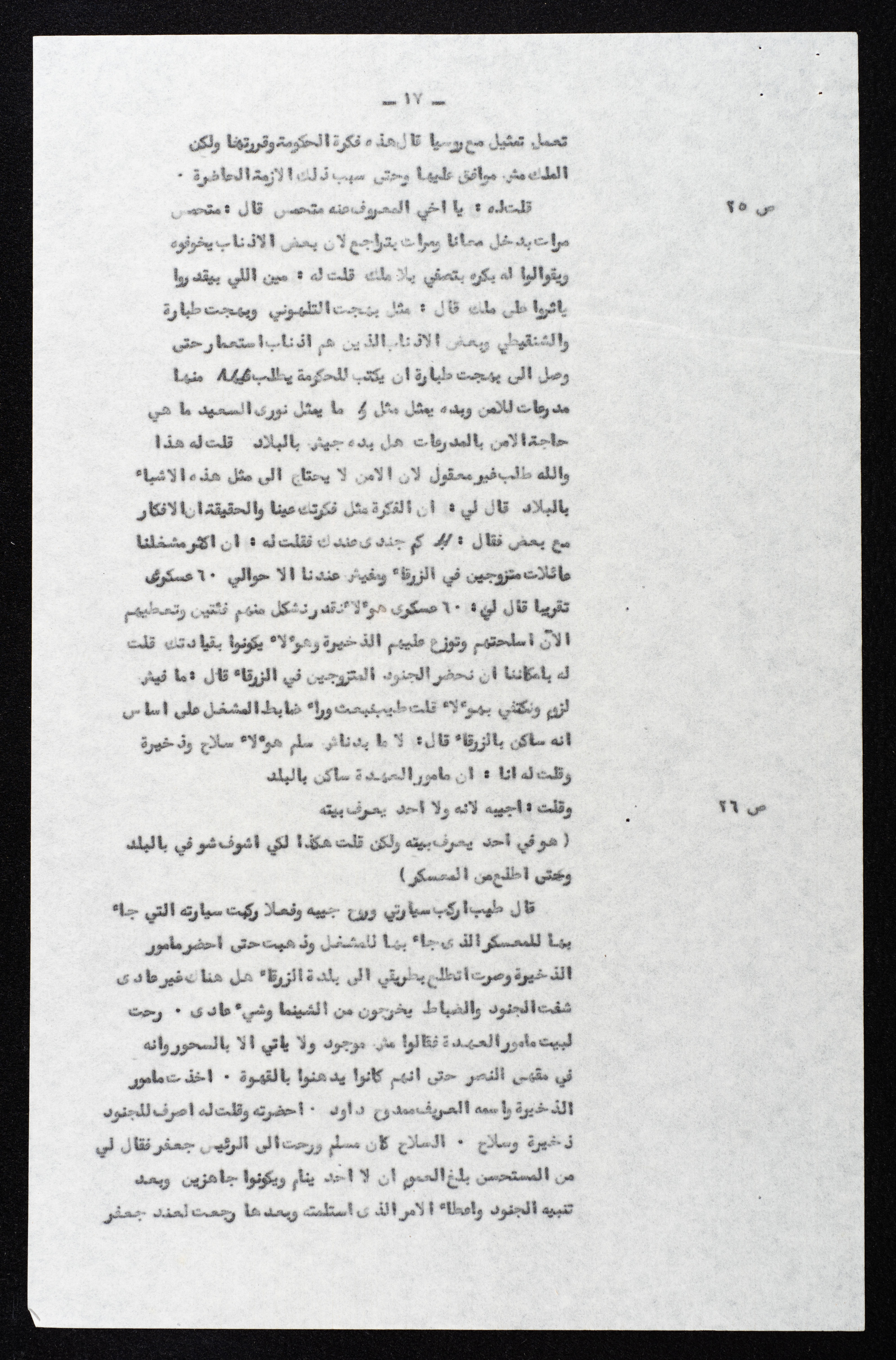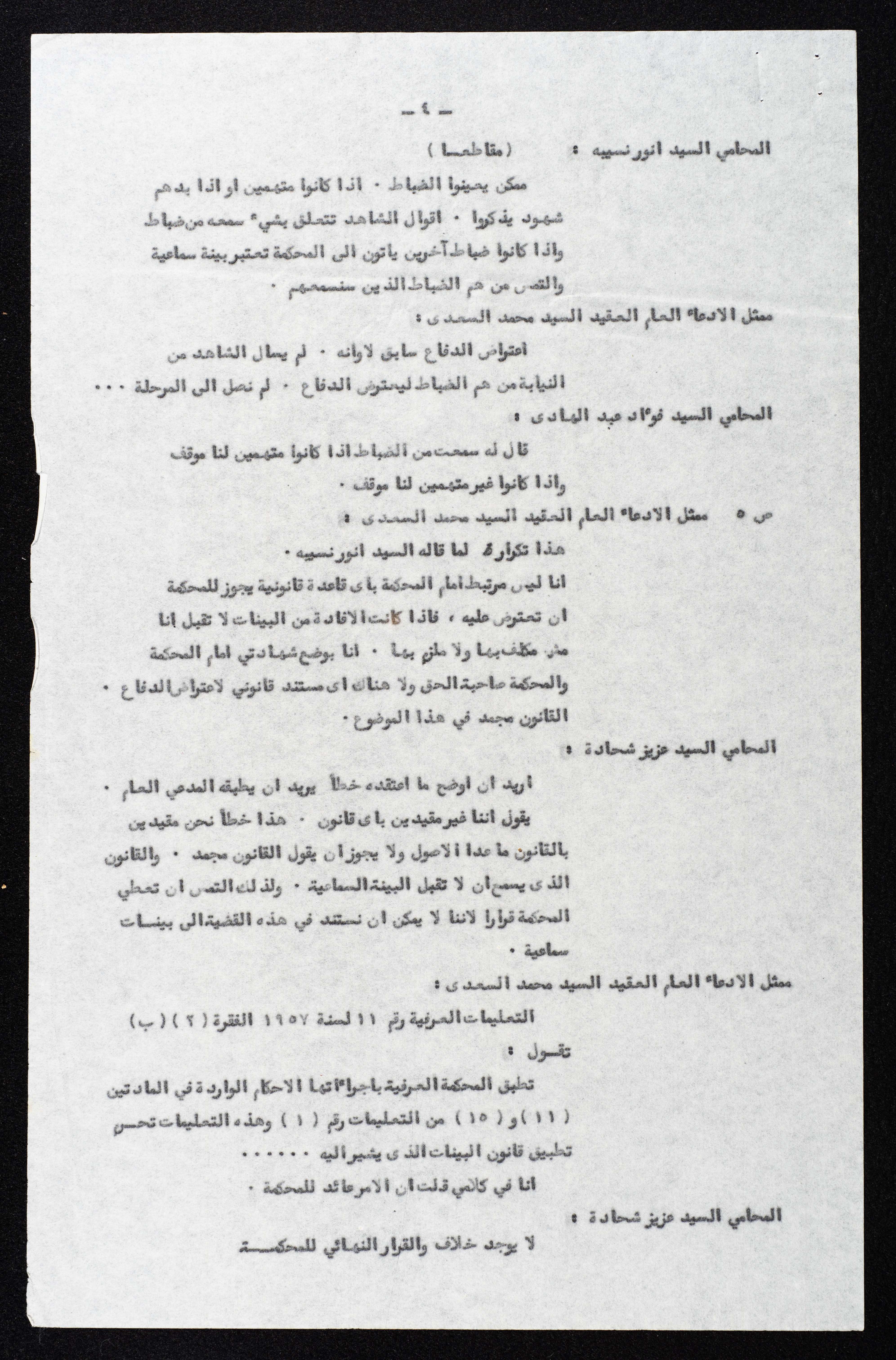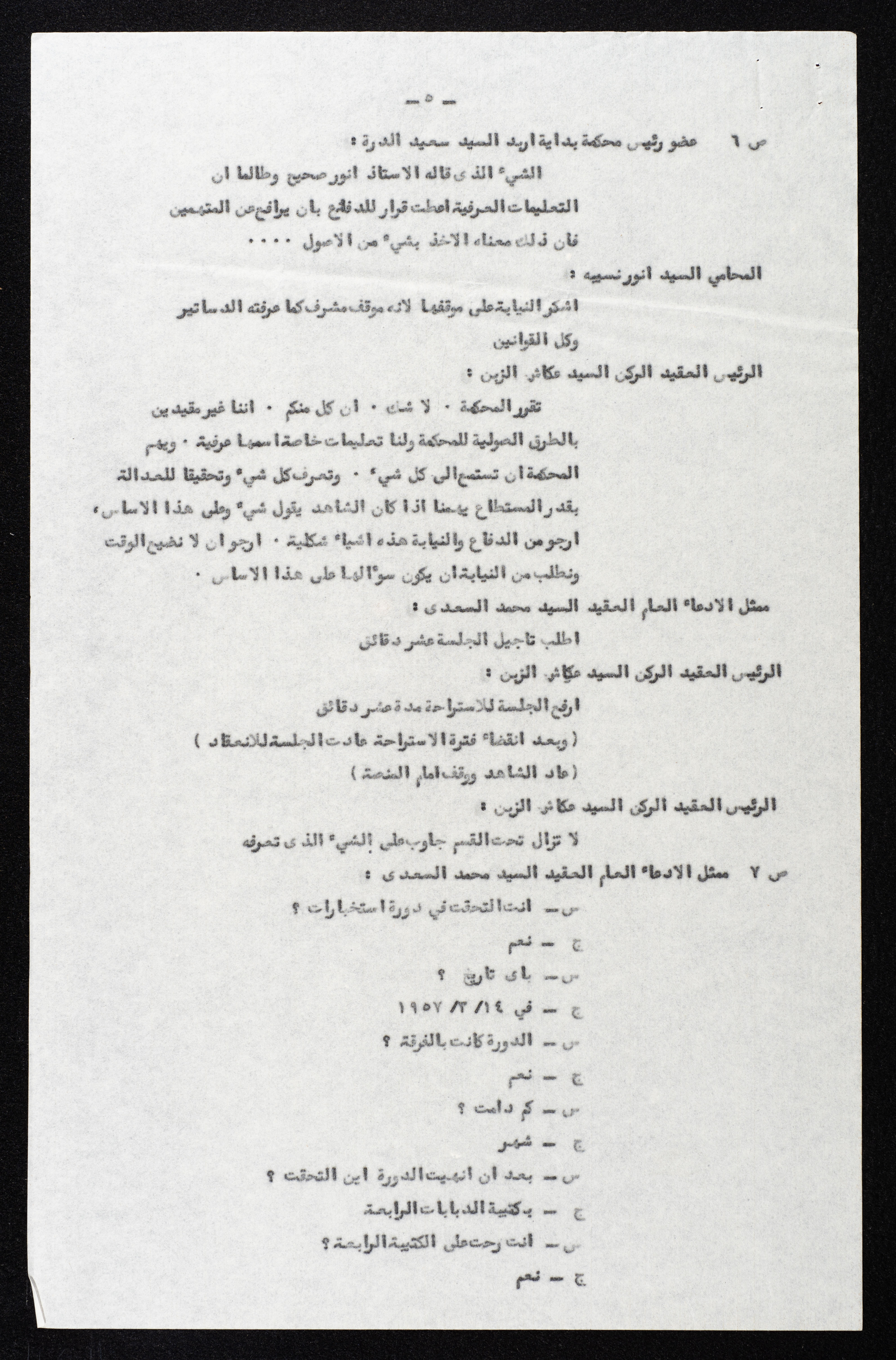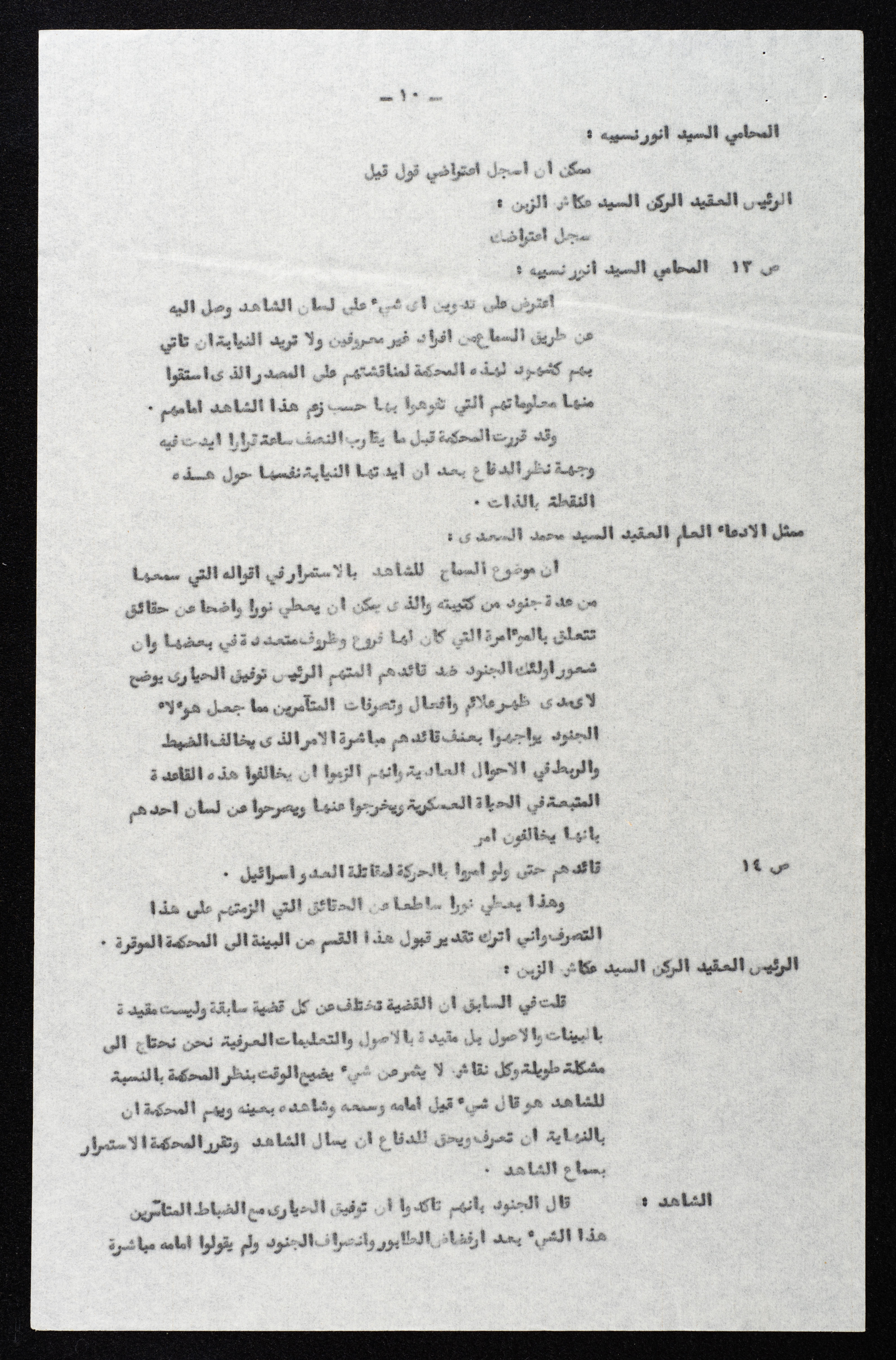 تتضمن هذه الوثيقة المطبوعة باللغة العربية وقائع الجلسة الثالثة عشر لمحكمة عرفية عسكرية خاصة لقضية محاولة الانقلاب على ملك الأردن يوم الثلاثاء الموافق 6 آب 1957 التي تمت في مطار عمان العسكري بعضوية العقيد عبد الكريم البرغوثي والعقيد أحمد بسلان، وقام بأعمال السكرتارية طاهر الشهابي وعدنان بعيون، حيث كانت هيئة الدفاع مكونة من المحاميين أنور نسيبة وفؤاد عبد الهادي وحسن حبيب حوا وعزيز شحادة، حيث افتتحت الجلسة من قبل رئيسها العقيد الركن "عكاش الزين" حيث طلب من ممثل الادعاء العام "محمد السعدي" تقديم الشاهد المرشح "عبد الحافظ السيد خليل"، ليُسأل عن اسمه ورتبته وعمره، وعن مدى معرفته بالمتهمين وفي حال نعم فمنذ متى وعن وجود أي صلة قرابة أو عداوة بينهم، ليجيب بأنه مرشح ضابط يعمل في كتيبة الدبابات الثالثة الملكية ويعرف أكثرية المتهمين ومن ضمنهم "علي أبو نوار" و"علي الحيارى" و"محمود موسى" و"قاسم ناصر" و"احسان الحلواني" ولا يوجد أي صلات قرابة أو عداوة بينه وبين أي أحد منهم، ليجيب بعدها على مجموعة أسئلة موجهة له من قبل ممثل الادعاء العام حول دورة استخبارات كان قد التحق بها بتاريخ 14 نيسان 1957، ثم عن بعض التفاصيل حول أحد الاجتماعات التي كانت قد عقدت في الحادي عشر من نيسان، وحضره المقدم "نايف الحديد" والرئيس الأول "عبد الله قاعد" والمقدم "أحمد زعرور" والرئيس "ضافي جمعاني" والرئيس "جعفر الشامي" والرئيس الأول "تركي الهنداوي" وهو قائد كتيبة الدبابات الرابعة في ذلك الوقت، ثم تحدث عن كيفية أمره بالالتحاق بكتيبة الدبابات الثالثة بأمر هاتفي من قائد الكتيبة الرئيس "توفيق الحياري" لأنه أنهى دورته، تلقى الأمر في الحادي عشر من نيسان ونفذه في الثالث عشر أي يوم محاولة الانقلاب، وذكر أنه علم أن القصر زود الاخوان المسلمين ب 300 مسدس ليلة 12-13 نيسان، ثم تحدث عن تفاصيل أخرى تخص ليلة الانقلاب وعن فرار "علي الحيارى". ;Printed in Arabic, this archival item documents the proceedings of the 13th session of the Court Martial on the coup attempt against the King of Jordan held on Monday, 6 August 1957 at the King Abdullah II Air Base, in the presence of Colonel “Abed el-Karim al-Barghouti” and Colonel “Ahmad Baslan” along with “Taher Ashihabi” and “Adnan Biyoun”, together, they did the secretary related work. The Defense Committee included the following attorneys; Anwar Nusseibeh, Fuad Abd el-Hadi, Hasan Habib Hawwa and Azziz Shihadeh; whereas the session was inaugurated by the Chief Colonel Major “Aukash Azzain” who requested from the Representative of the Prosecution General "Muhammad Assadi" to present the witness; Officer Candidate “Abed el-Hafeth al-Sayed Khalil” who was asked to deliver his name, military rank and age in addition to what extent does he know the suspects? since when? and if there is any relationship between them or enmity, meanwhile, he confirmed working as an Officer Candidate at the 3rd Royal Tanks Brigade and knows most of the defendants including “Ali Abu Nuwwar”, “Ali al-Hiyyari”, “Mammoud Mousa”, “Qasem Nasser” and “Ihsan al-Halawani” and there is no relationships between them nor hostility, afterwards, he answered a collection of questions by the Representative of the Prosecution General "Muhammad Assadi" on the inelegance course he participated in on 14 April 1957 and some details concerning one of the meetings held on 11 April 1957 which was attended by Lieutenant-Colonel “Nayif al-Hadid”, Sergeant “Abdullah Qaed”, Lieutenant “Ahmad Zarour”, Chief “Dafi Jamani”, Chief “Jafar Ashami” and Sergeant “Turki al-Hindawi” who was the Leader of the 4th Tanks Brigade back in the day, then, he spoke in depth about how he managed to take part among the 3rd Tanks Brigade through an order by Chief “Tawfique al-Hiyyari” after finishing his round; as he received the order on 11 April and was put to action on 13 April 1957 which is the day of the attempted coup saying that he knew that the palace provided the Muslim Brotherhood with 300 weapons on the night of 12-13 April and other additional details concerning the night of the coup and the escape of “Ali al-Hiyyari”.