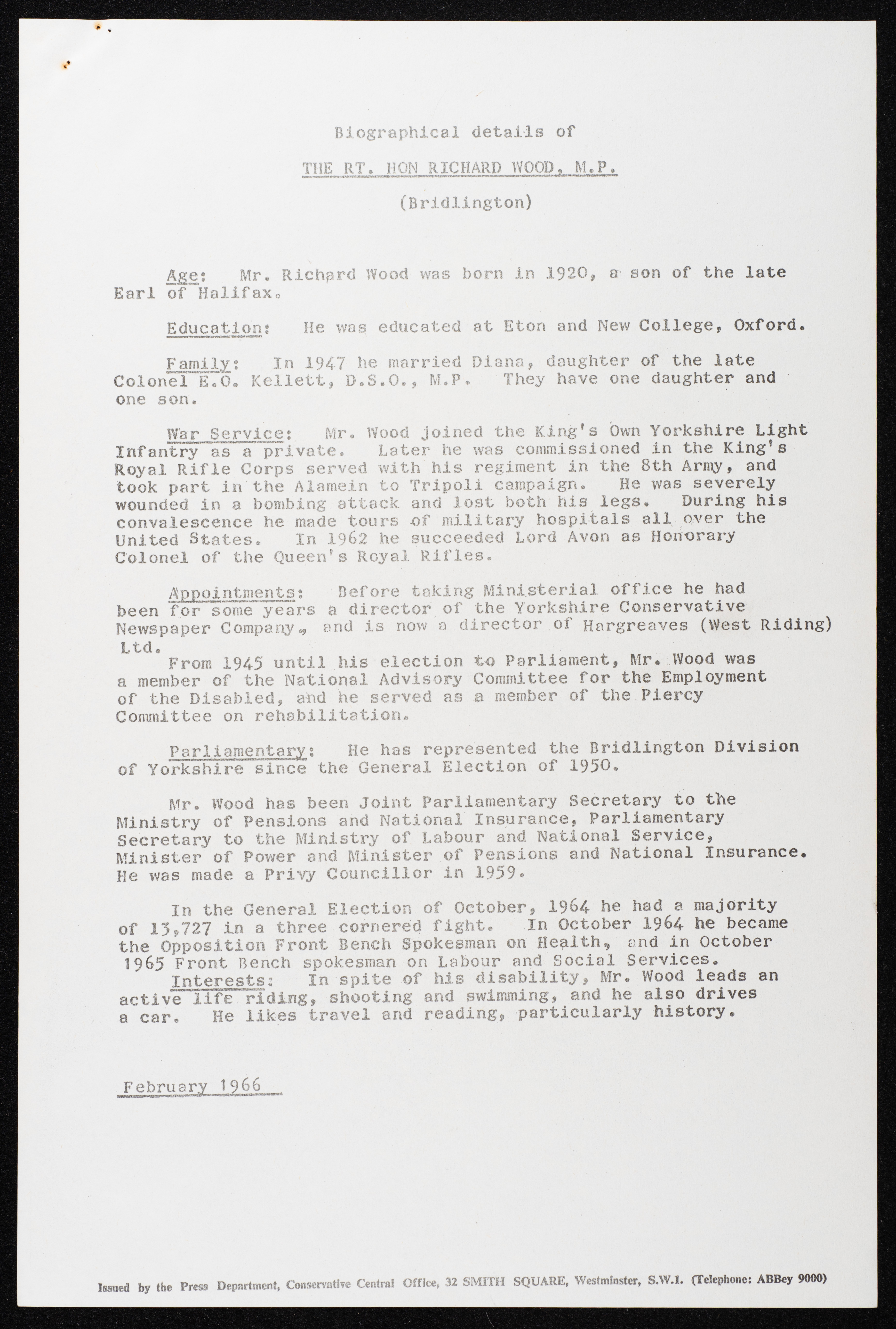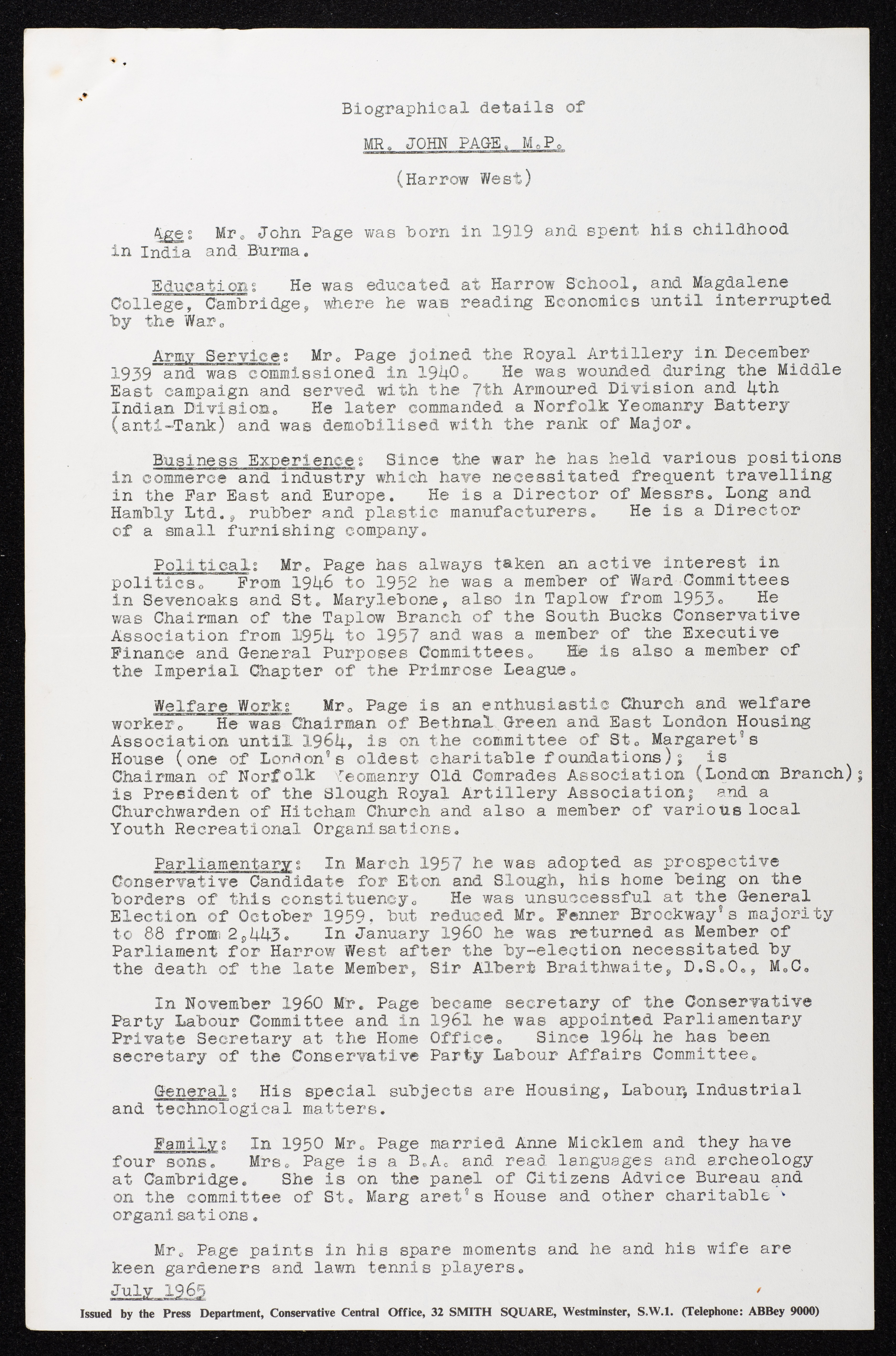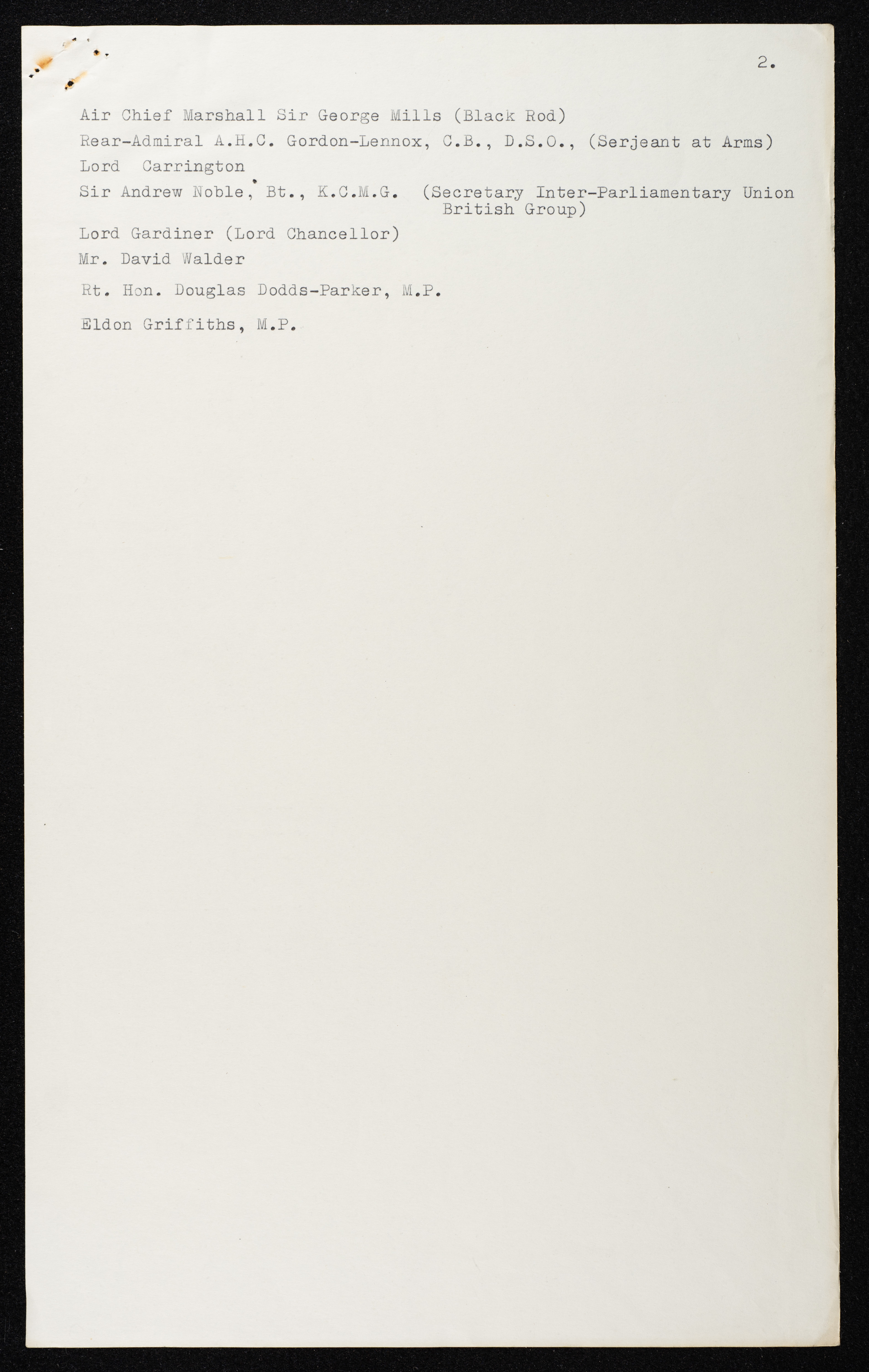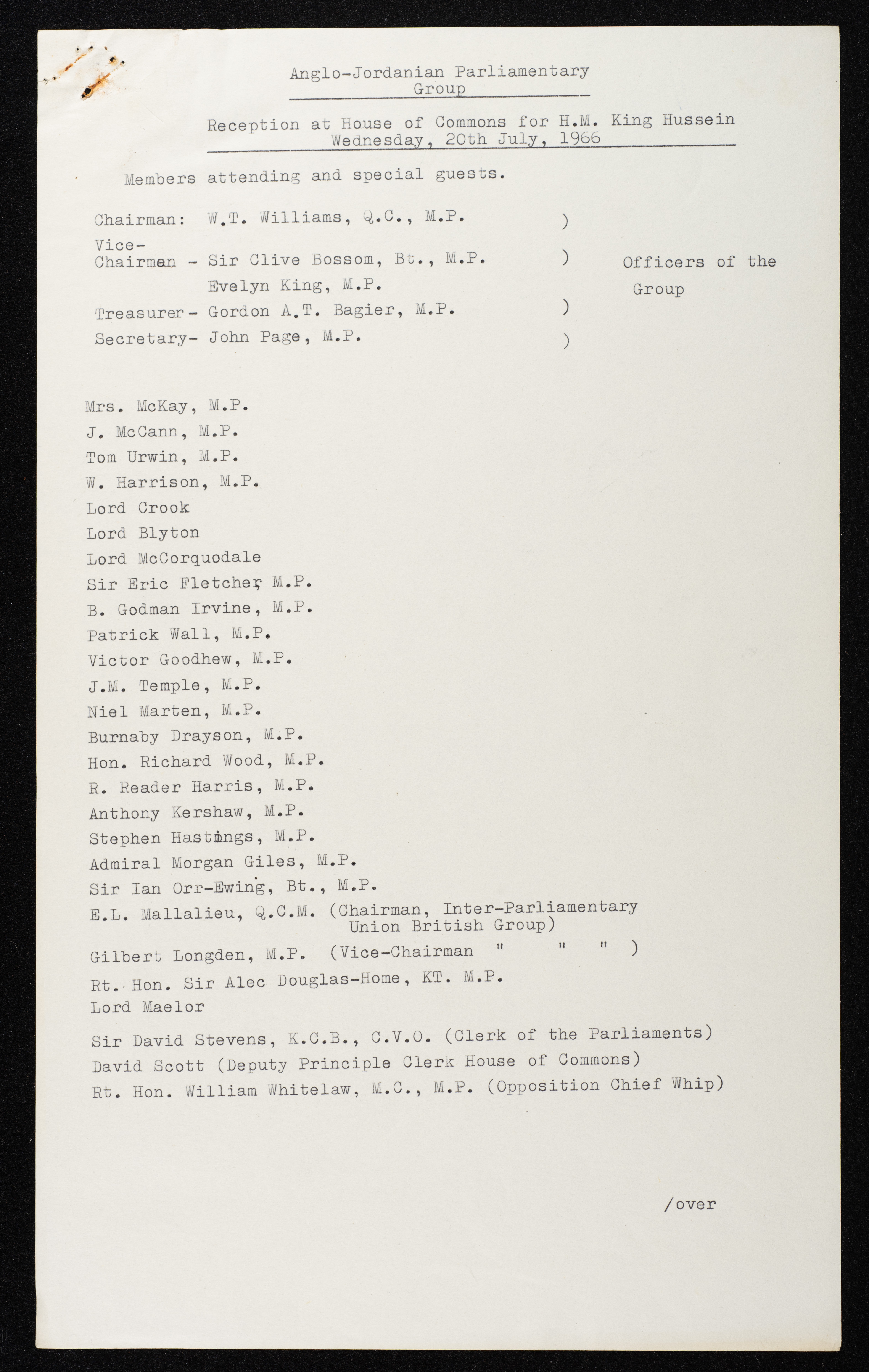 Printed in English, this document shows a list of the names of the participants in the reception of Jordan's King Hussein bin Talal at the House of Commons of the United Kingdom (UK) on 20 July 1966.