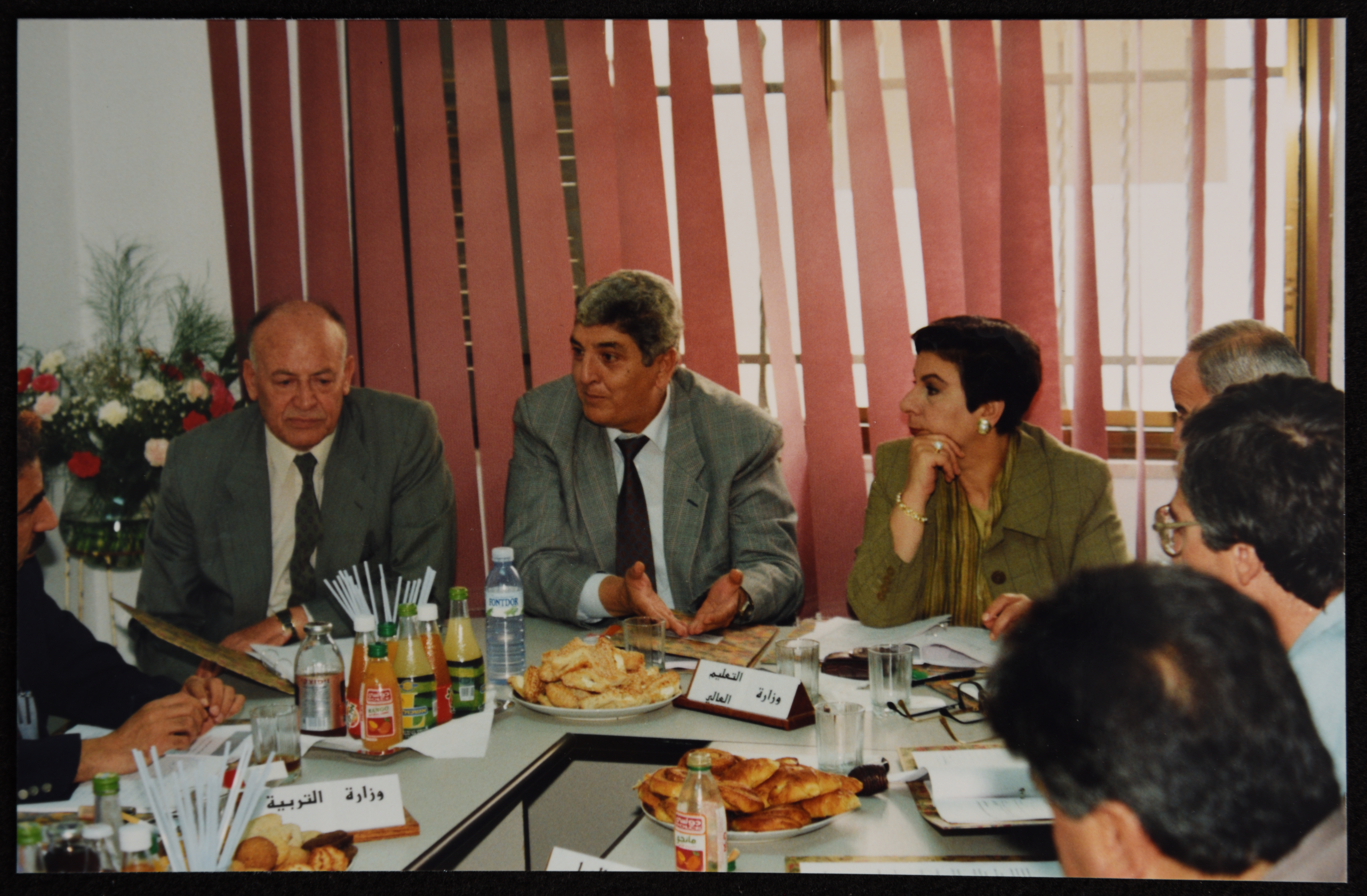 صورة ملونة يظهر فيها الدكتور سمير غوشة برفقة حنان عشراوي خلال لقاء تشاوري بين وزارة التربية ووزارة التعليم العالي ووزارة العمل من أجل تنسيق برامج التدريب المهني والتقني