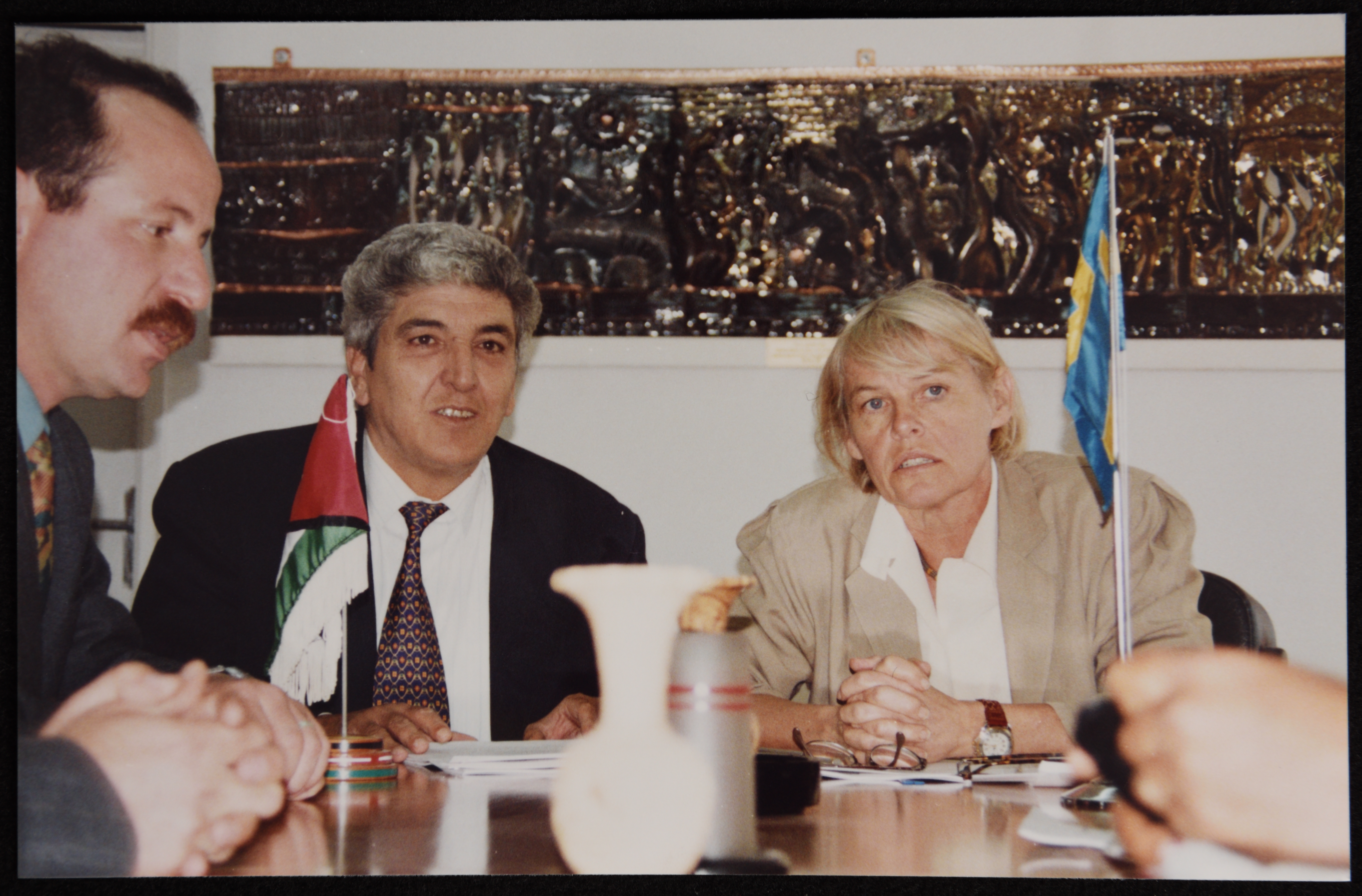 صورة ملونة يظهر فيها الدكتور سمير غوشة خلال مناقشة اتفاقية تعاون للتدريب المهني ممولة من حكومة السويد عام 1995