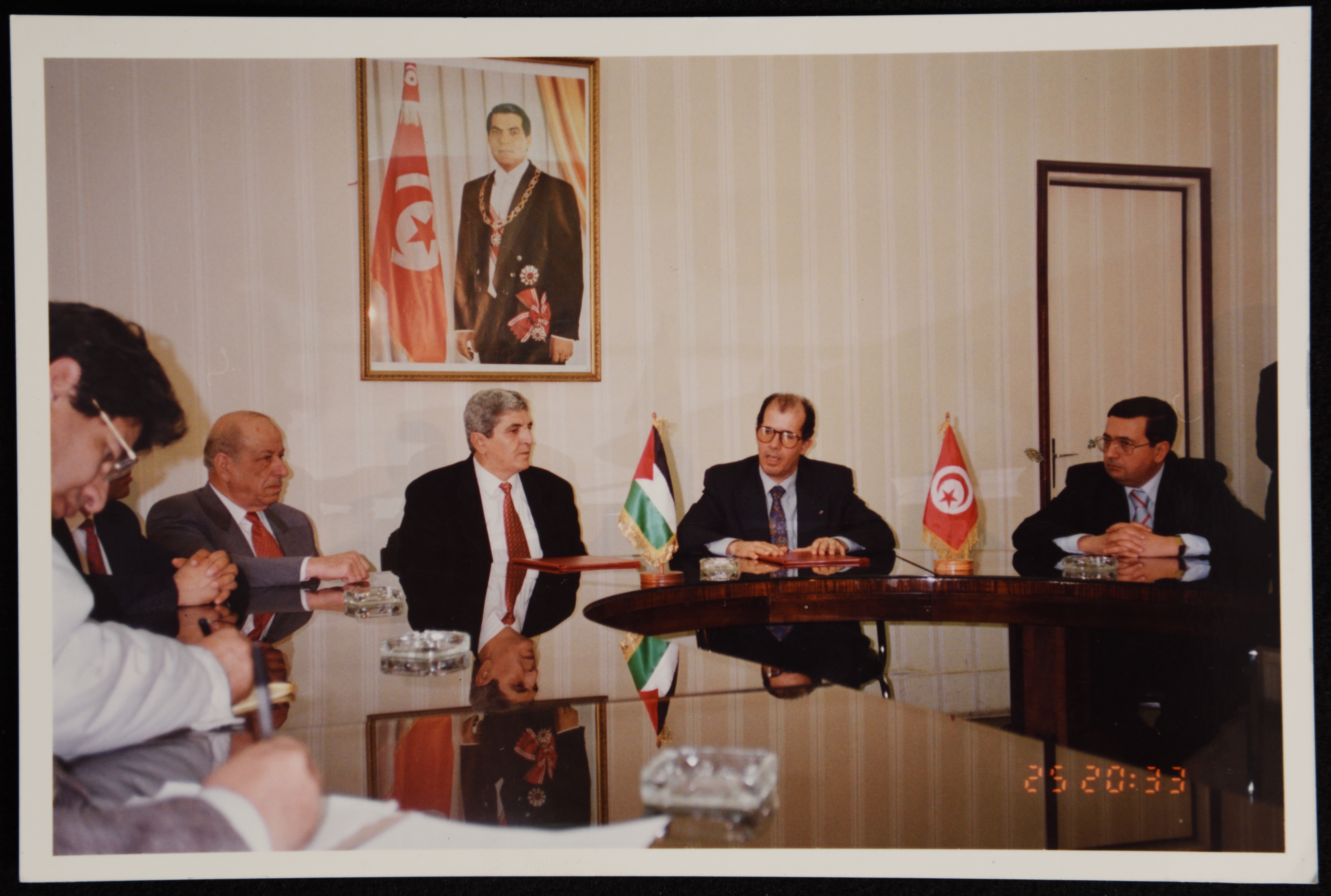 صورة ملونة يظهر فيها الدكتور سمير غوشة خلال توقيع اتفاقية مع وزير الشؤون الاجتماعية والعمل في تونس