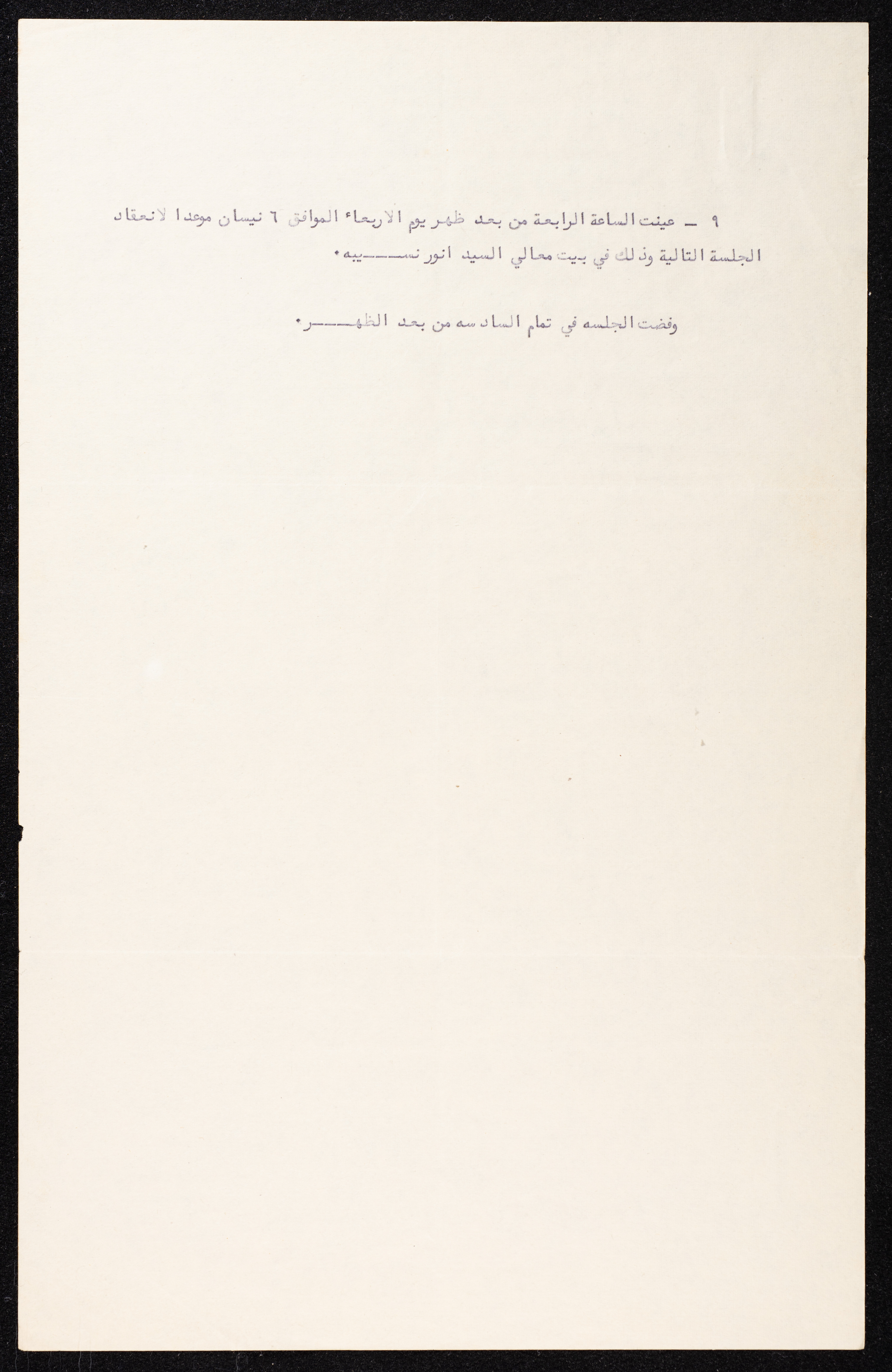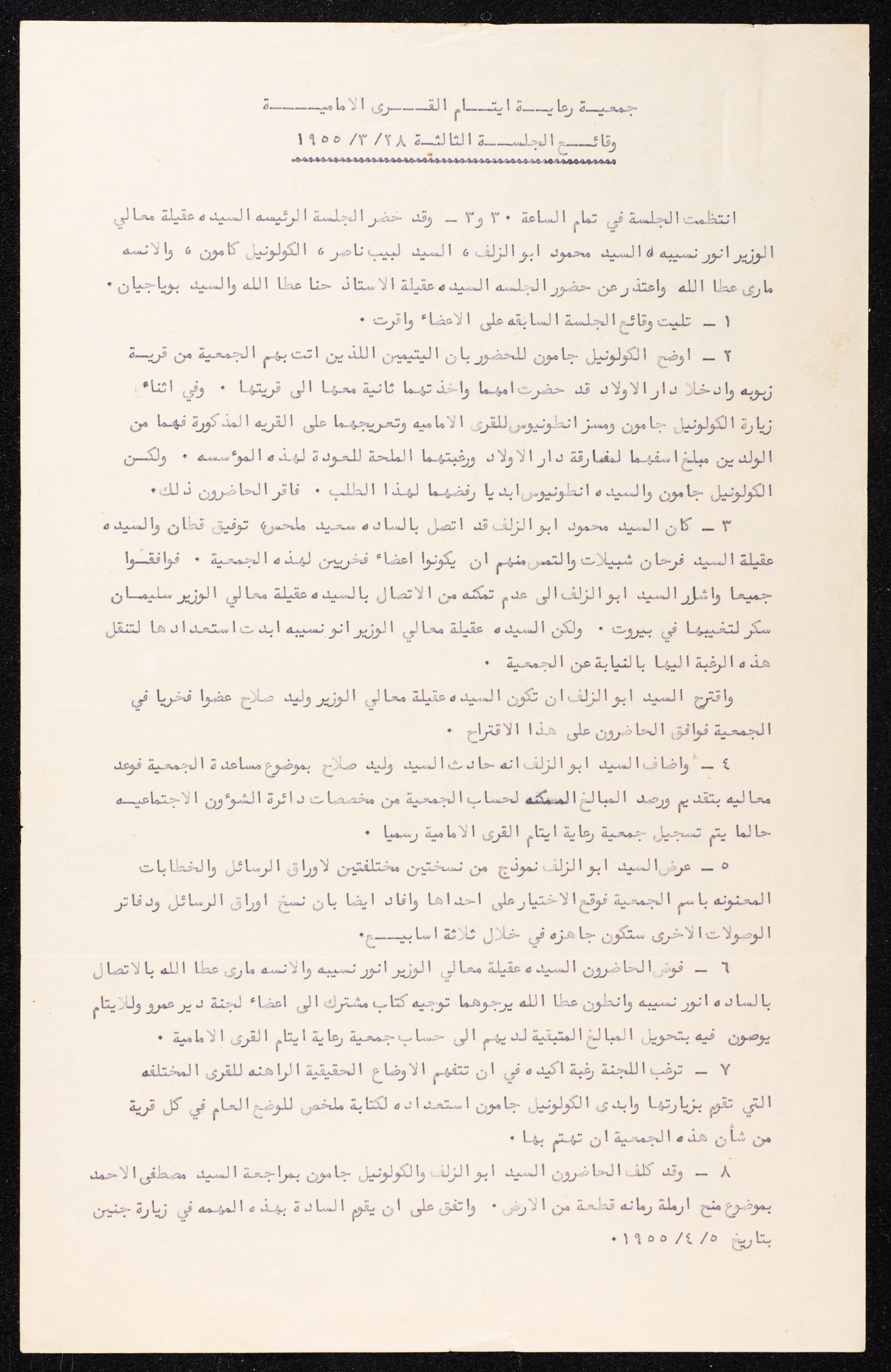 This archival item documents the records of the 3rd session of the Guardian Society of Border Villages Orphan Children held on 28 March 1955 in the presence of Nuzha Nusseibeh; the wife of Minister Anwar Nusseibeh, Mahmmoud Abu Azzoulf, Labib Naser, Colonel Camoun and Mrs Marri Attallah, while the wife of Hanna Attallah and Boiajian apologised for not being able to attend.