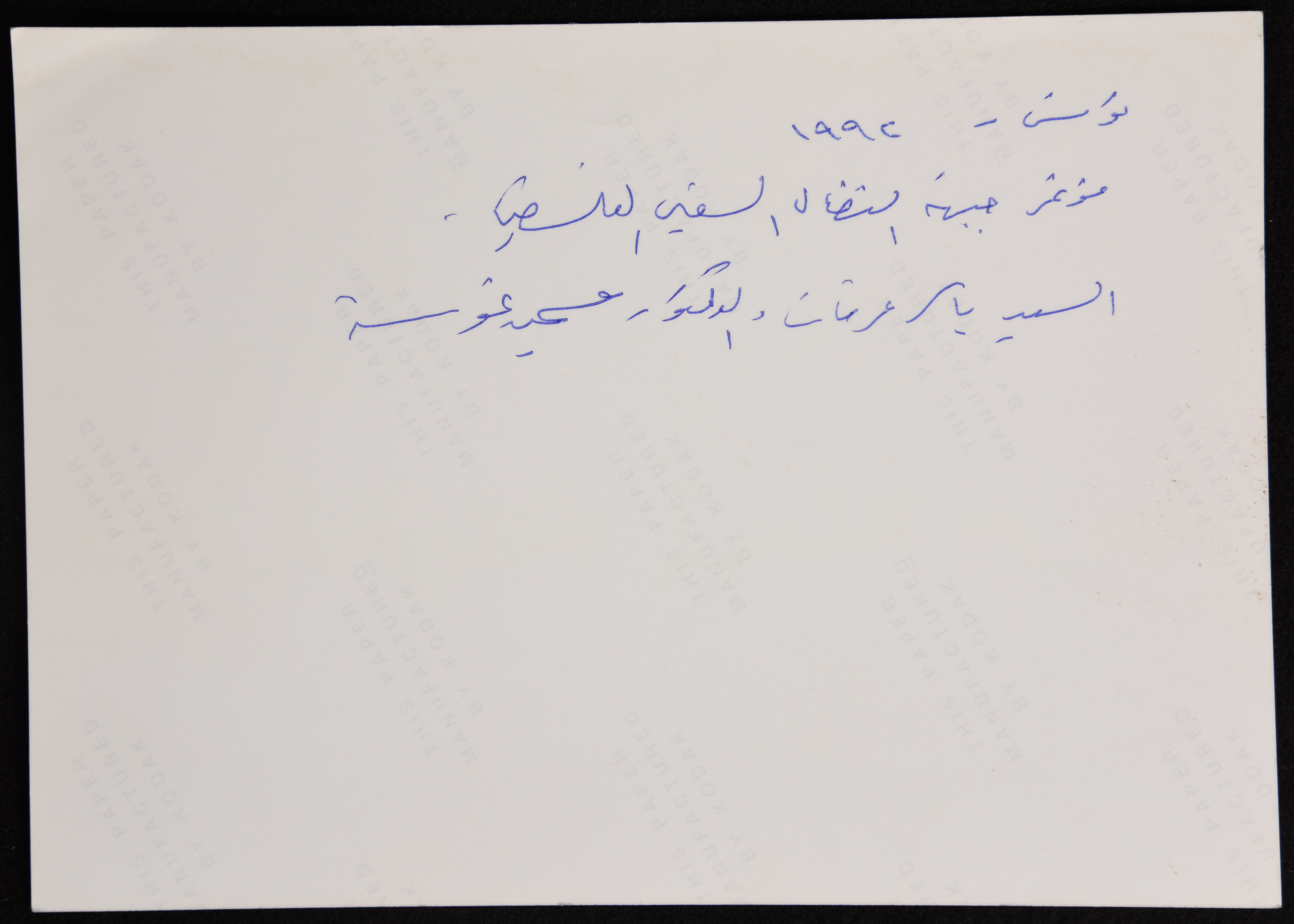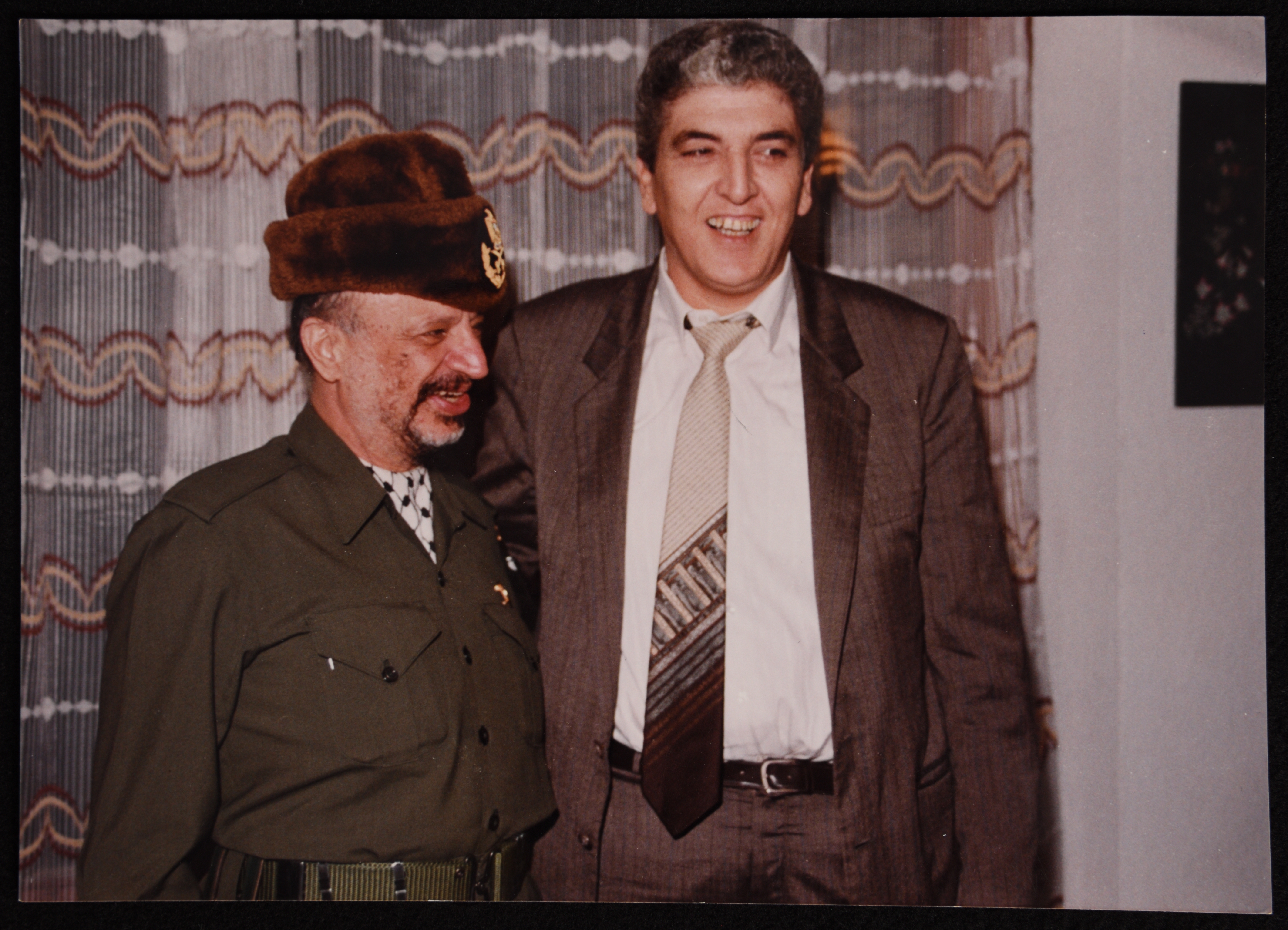 صورة ملونة يظهر فيها الدكتور سمير غوشة برفقة ياسر عرفات في مؤتمر جبهة النضال الشعبي الفلسطيني في تونس عام 1992