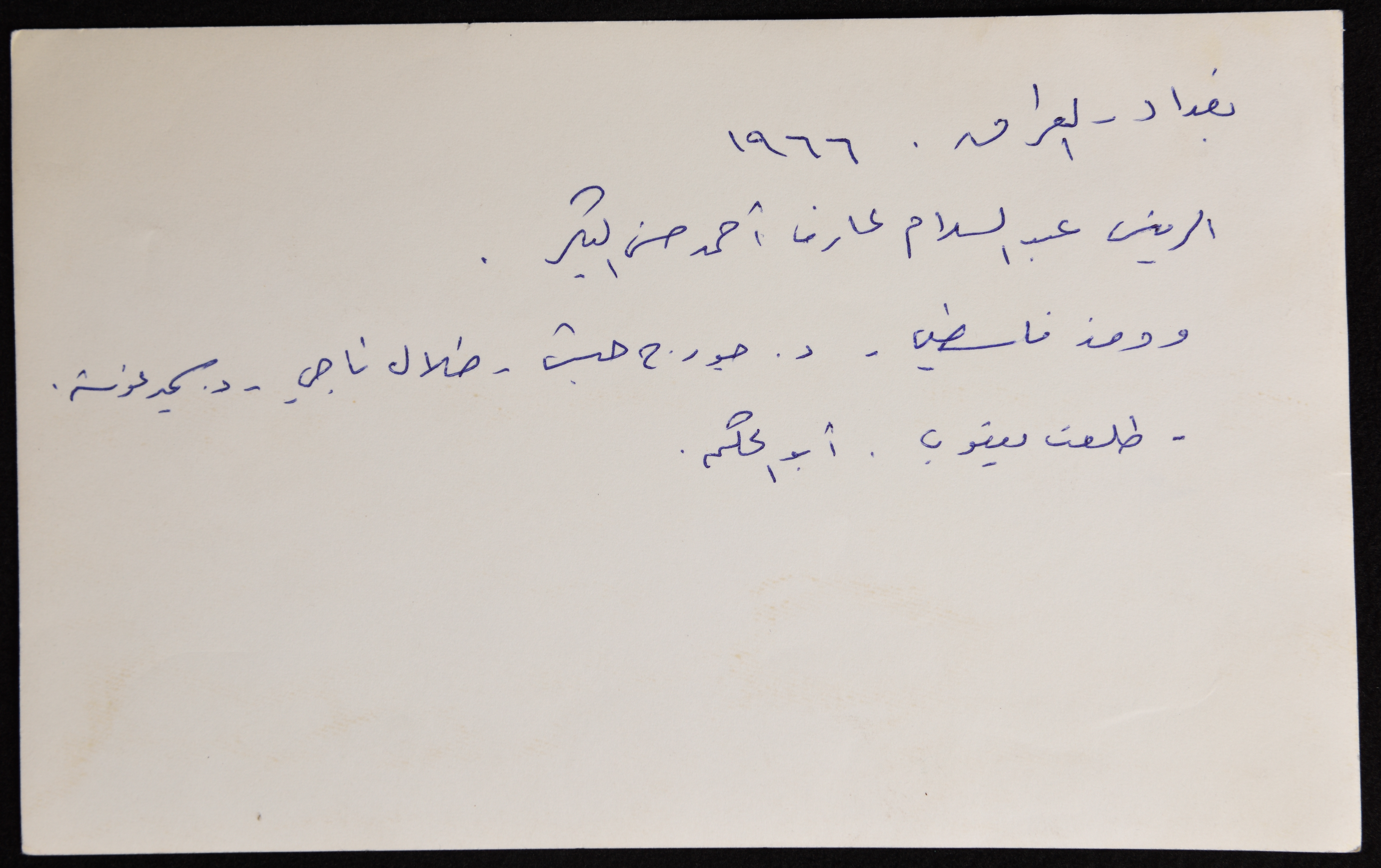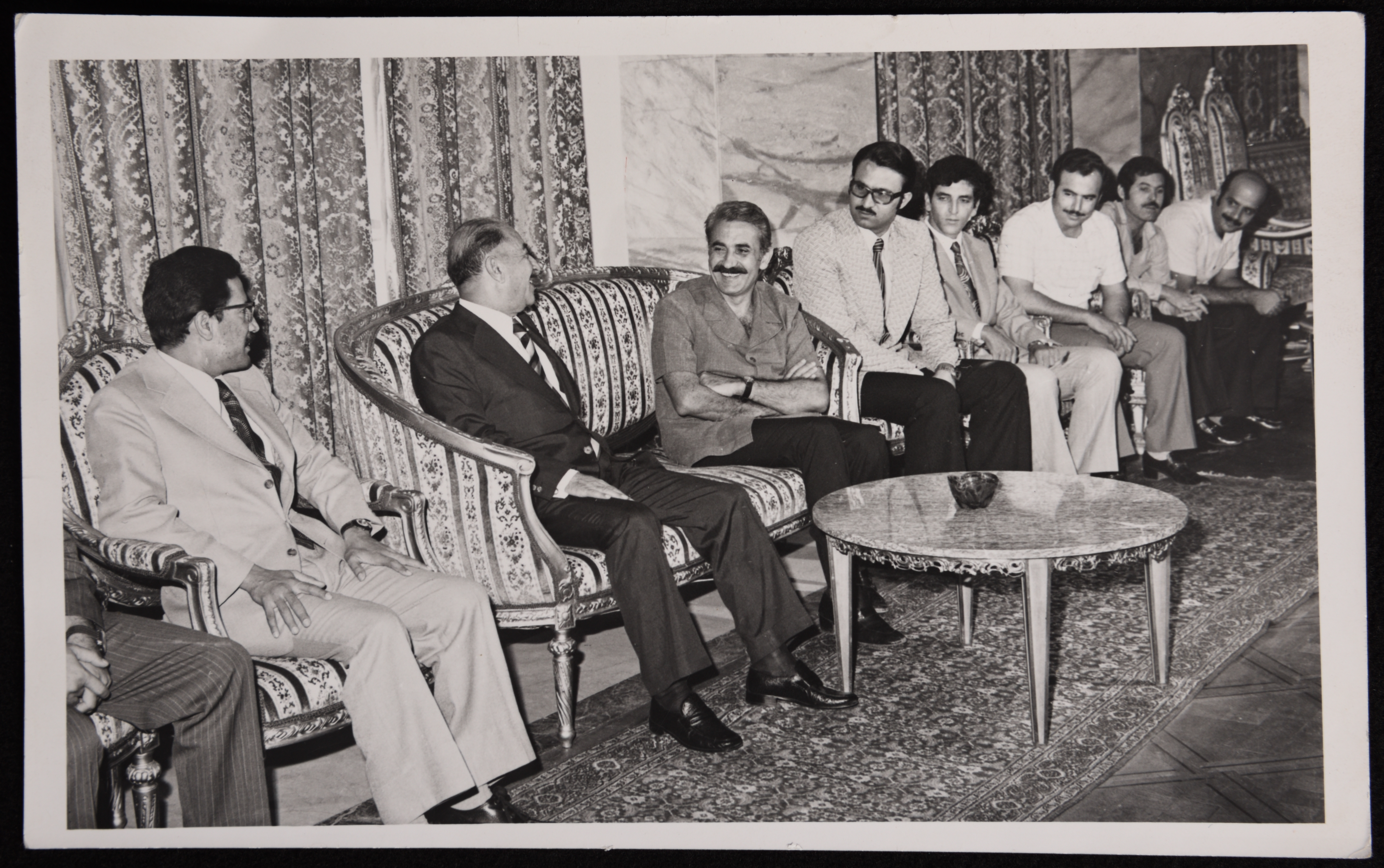 صورة ملونة يظهر فيها الدكتور سمير غوشة برفقة الوفد الفلسطيني الذي يضم جورج حبش،طلال ناجي،طلعت يعقوب وأبو الحكم بزيارة رسمية للرئيس عبد السلام عارف وأحمد حسن البكر في بغداد