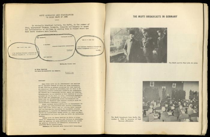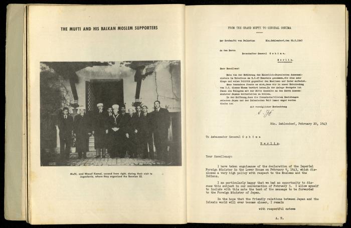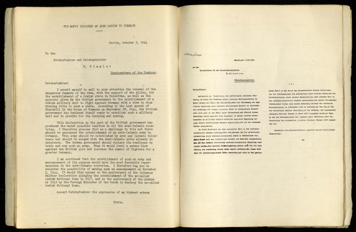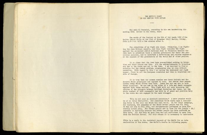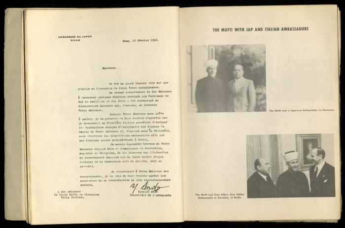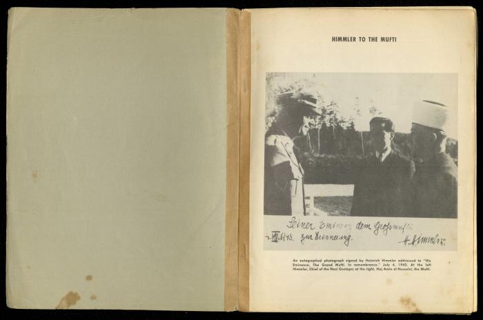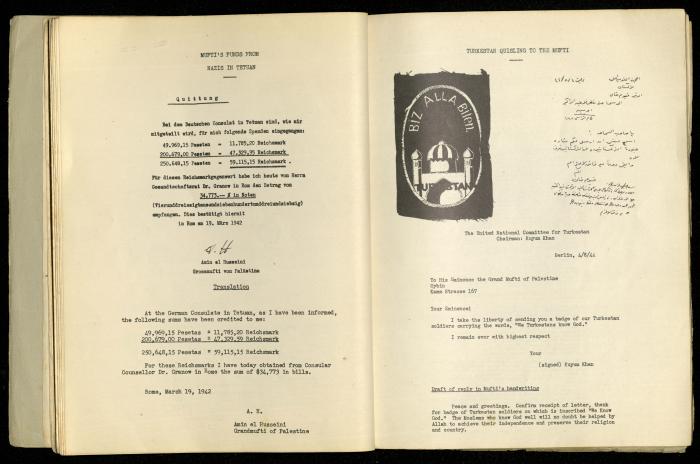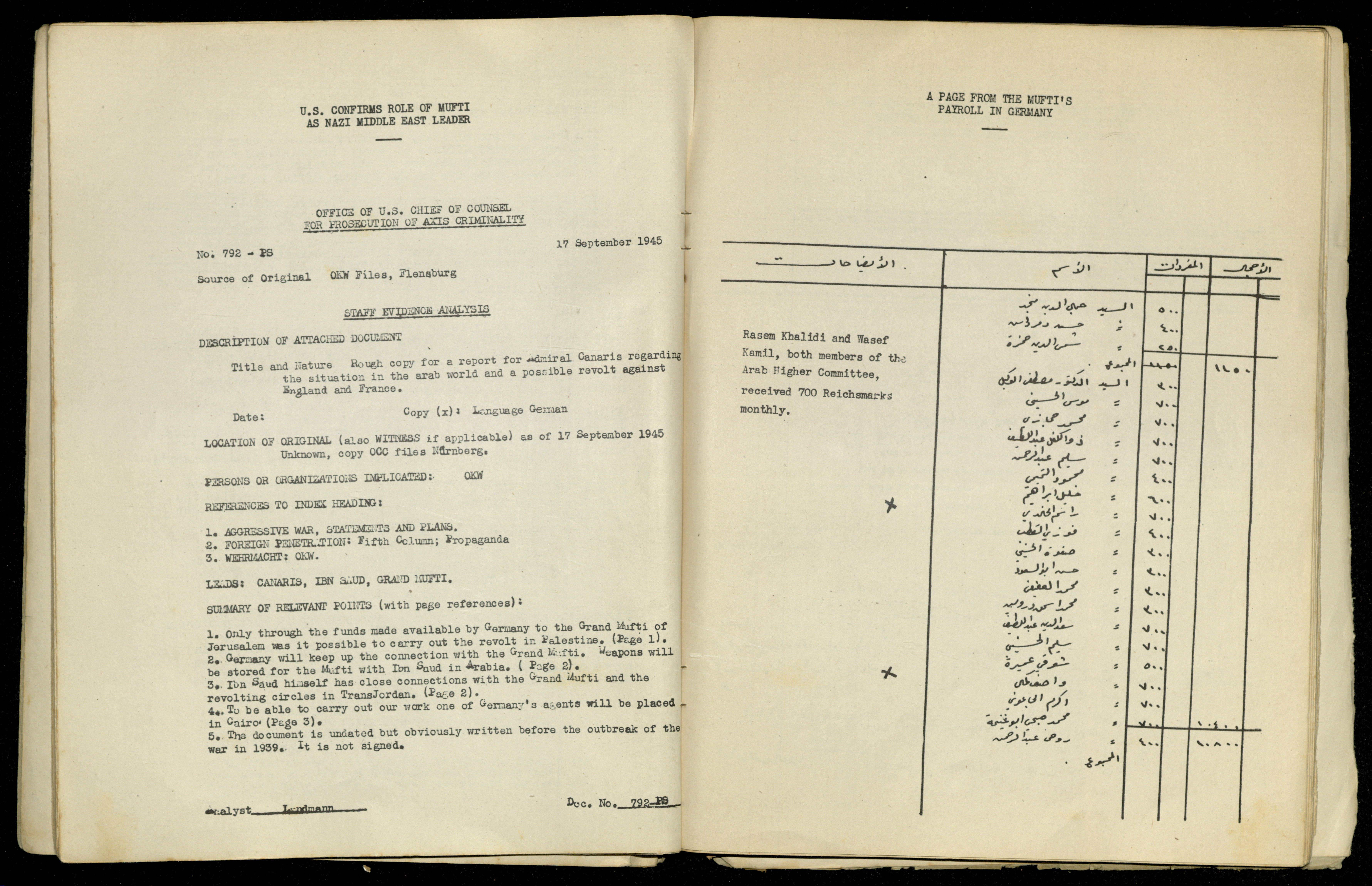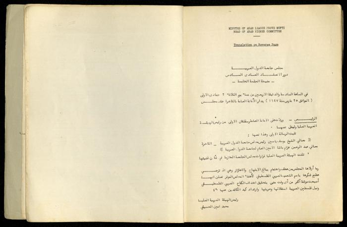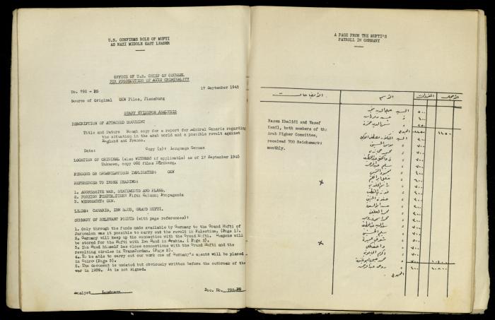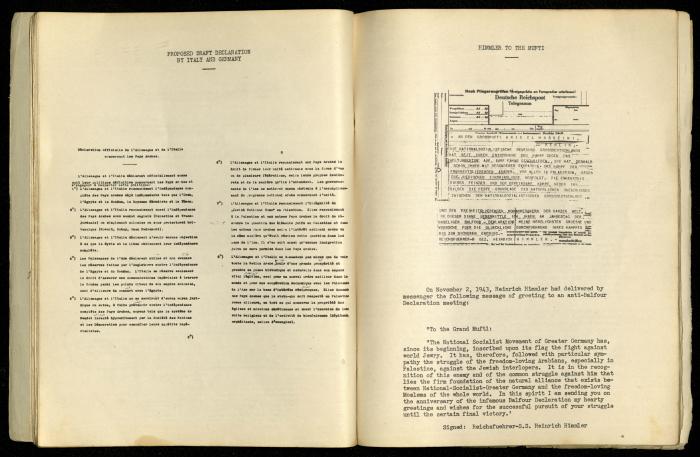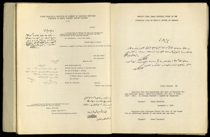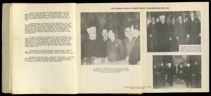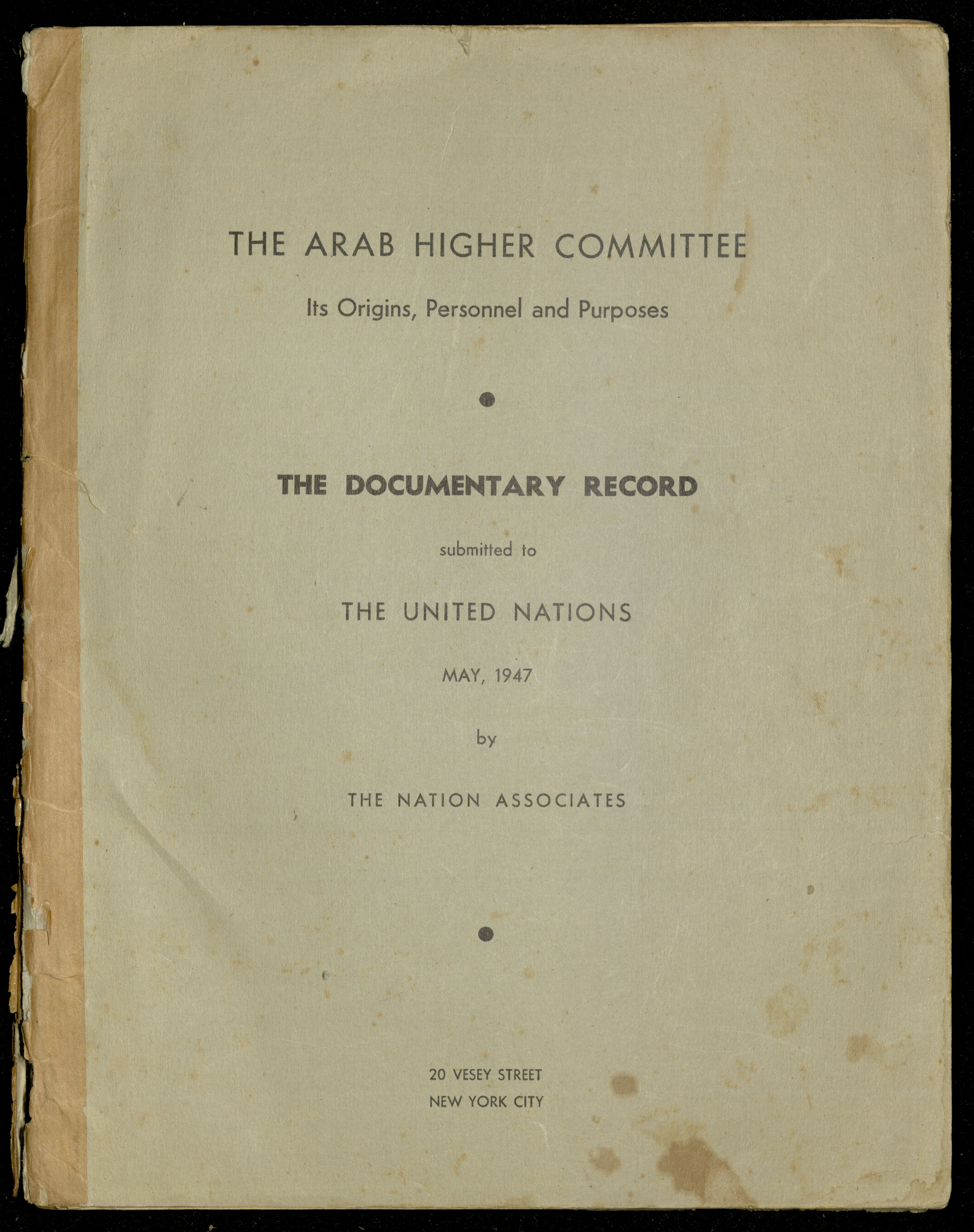 Printed in English and attached with documents in German and Italian, this archival item is a documentary record putting together written and visionary material of the Arab Higher Committee, prepared by the Nations Magazine and delivered to the United Nations in May 1947, in this record, the magazine attaches a brief on the committee between (1936-June 1946) inaugurated by recalling one of the official testimonials addressed by the committee for the benefit of the Palestinian Question when the Political Committee of the General Assembly of the United Nations invited it on 7 May 1947 without a dissenting vote at that time, in addition to a timeframe tracing its pollical origins by the Arab League and the committee’s president, the Grand Mufti of Jerusalem, Haj Amin Husseini and the founding members whom were in close ties with the Mufti and they are Wasef Kamal, Rasem al-Khalidi, Emil Ghouri and Jamal al-Husseini and this was after it was limited to Jamal al-Husseini as the Vice President, Hasan al-Khalidi as the General Secretary with the membership of Emil Ghouri and Ahmad Helmi and their motives behind such membership, afterwards it tracks the history of the Arab League’s relationship with Palestine including member states all the way down to copies of scattered documents which varies between photographs, paper clippings, minutes of meetings; both official and non-official, handwritten financial records of the committee’s expenses, letters between the Mufti and his allies in Germany and Italy and copies of his diaries in which he recorded his talks with the German Leader Adolf Hitler on the Question of Palestine. It is worth to mention that the “Nations” is America’s oldest magazine producing a weekly press production on progressive politics and cultural issues in addition to providing political analysis since July 1865.