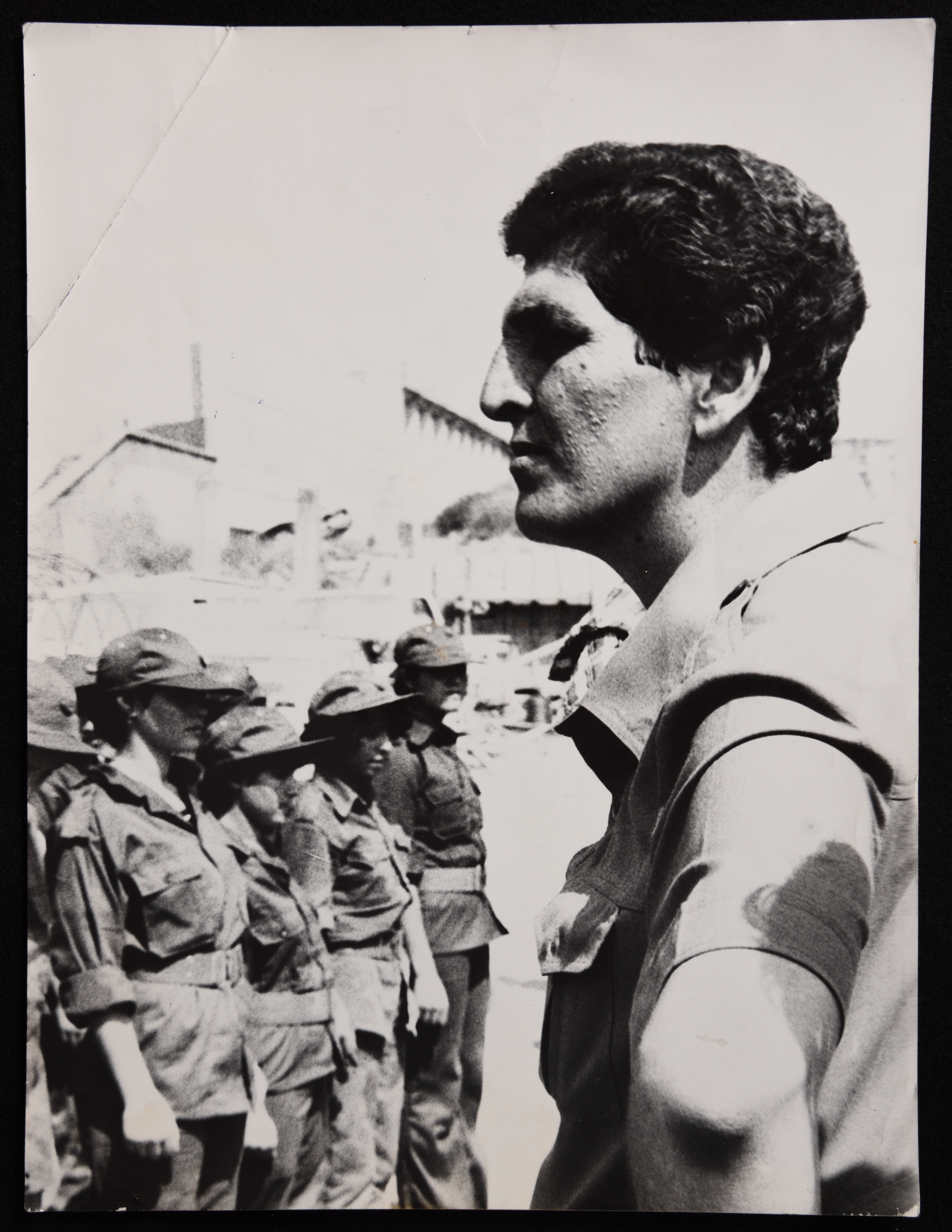 صورة بالأبيض والأسود يظهر فيها الدكتور سمير غوشة وهو يشرف على تخريج دورة عسكرية للفتيات في لبنان