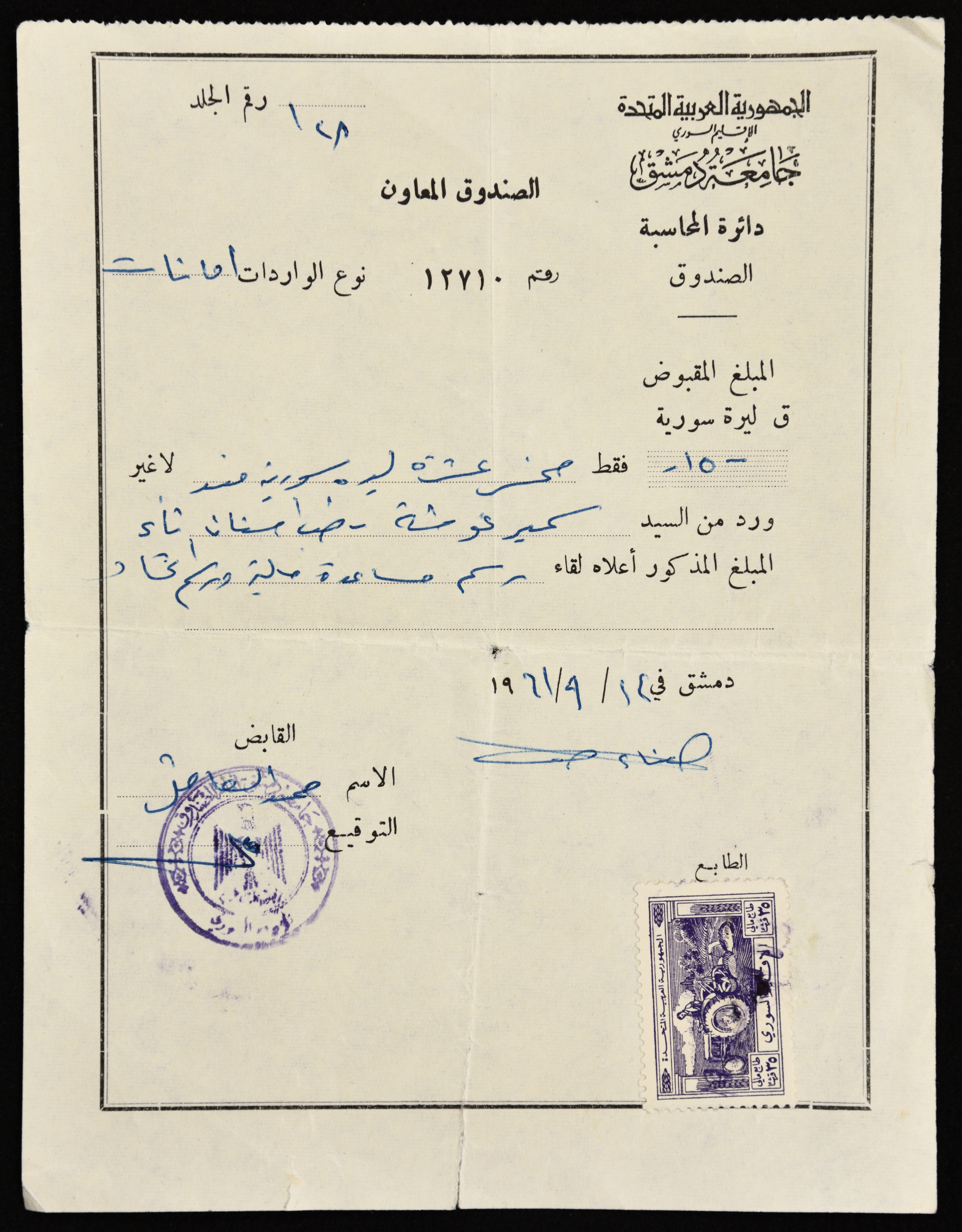 وصل رسوم خاص بسمير غوشة وهو طالب في كلية طب الأسنان في السنة الثانية في جامعة دمشق بتاريخ 14-9-1961 . قيمة الوصل تبلغ خمس عشرة ليرة سورية قام بدفعها سمير غوشة لقاء رسم مساعدة مالية ورسم اتحاد وهو صادر عن دائرة المحاسبة في جامعة دمشق