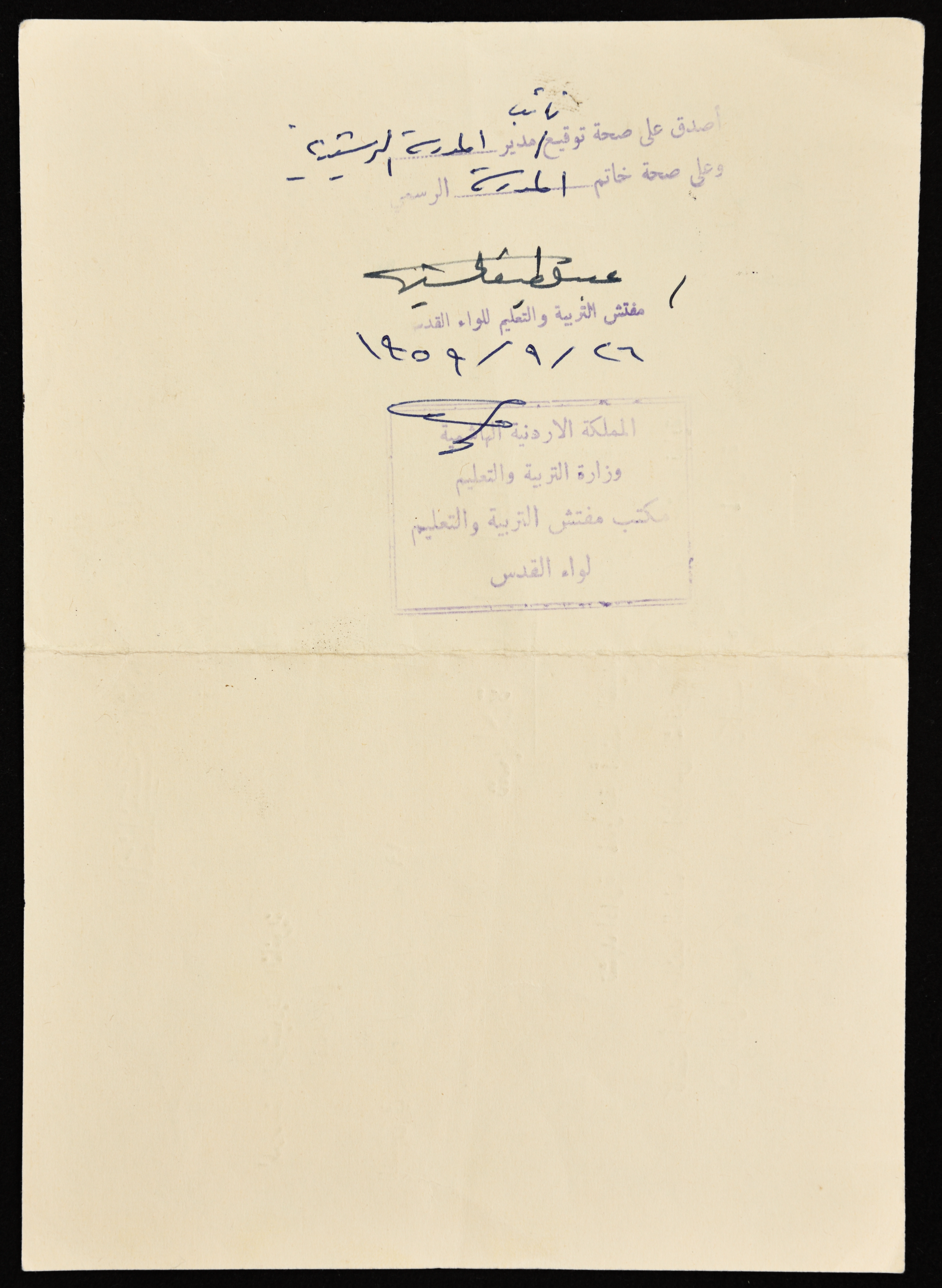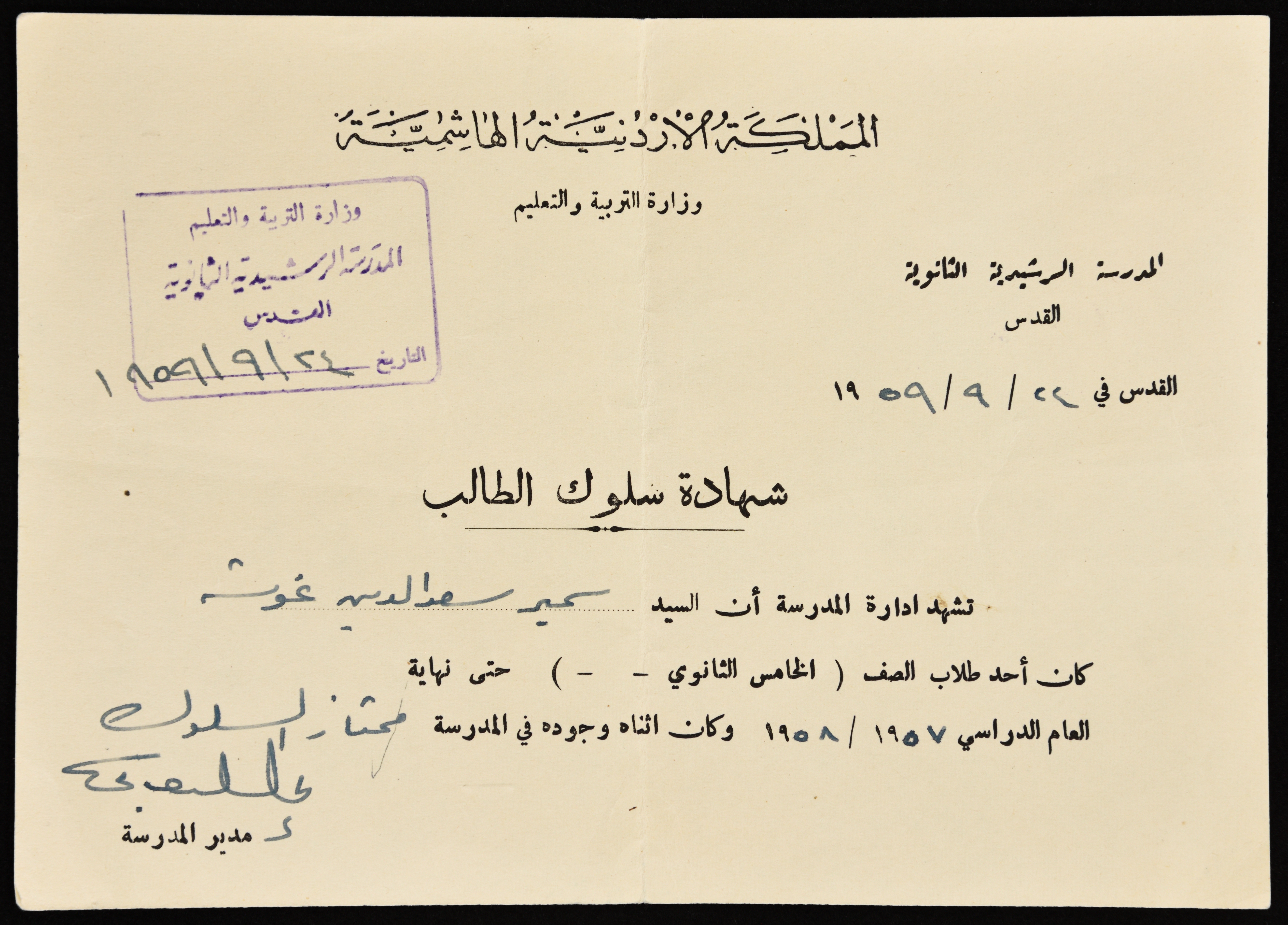 وثيقة شهادة سلوك خاصة بسمير غوشة الطالب في مدرسة الرشيدية الثانوية الكائنة في مدينة القدس الواقعة تحت سيطرة المملكة الأردنية الهاشمية الوثيقة صادرة عن وزارة التربية والتعليم بتاريخ 24-9-1959