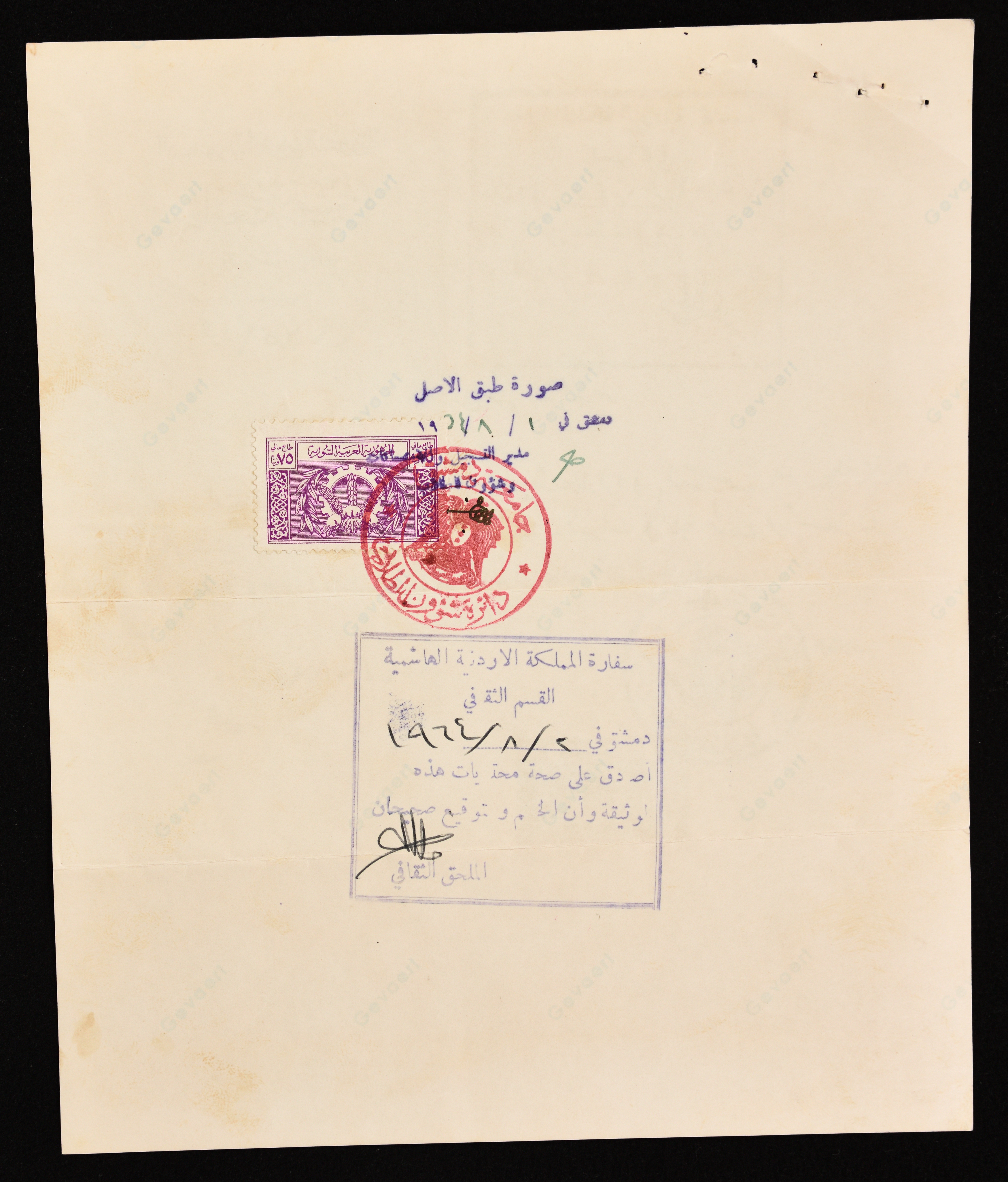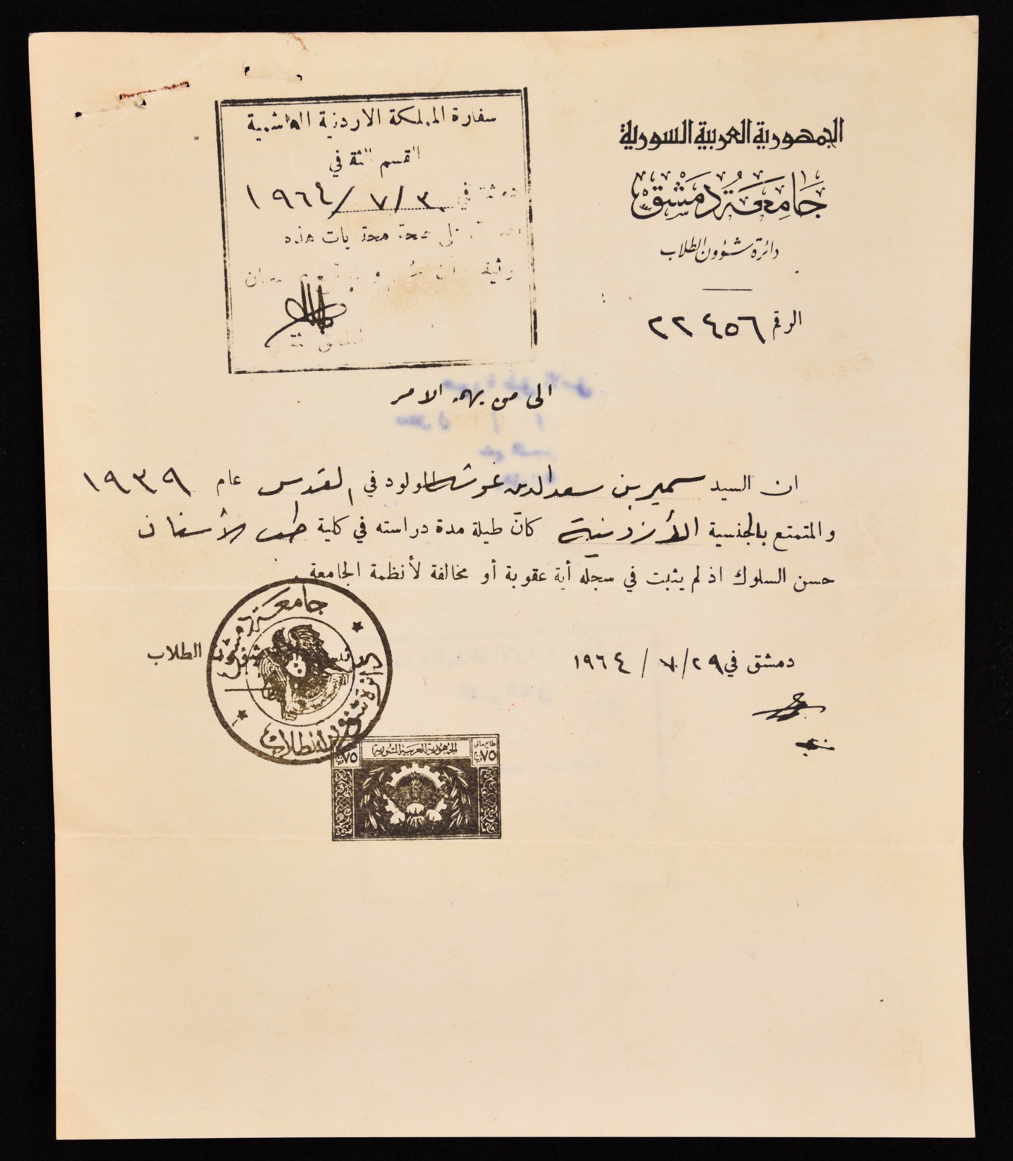 وثيقة حسن سلوك بتاريخ 29-7-1964مرفقة بطوابع حكومية منحتها دائرة شؤون الطلبة في جامعة دمشق لخريج كلية طب الأسنان الطالب سمير غوشة اذ أنه لم يثبت في سجلهأية عقوبة أو مخالفة لأنظمة الجامعة