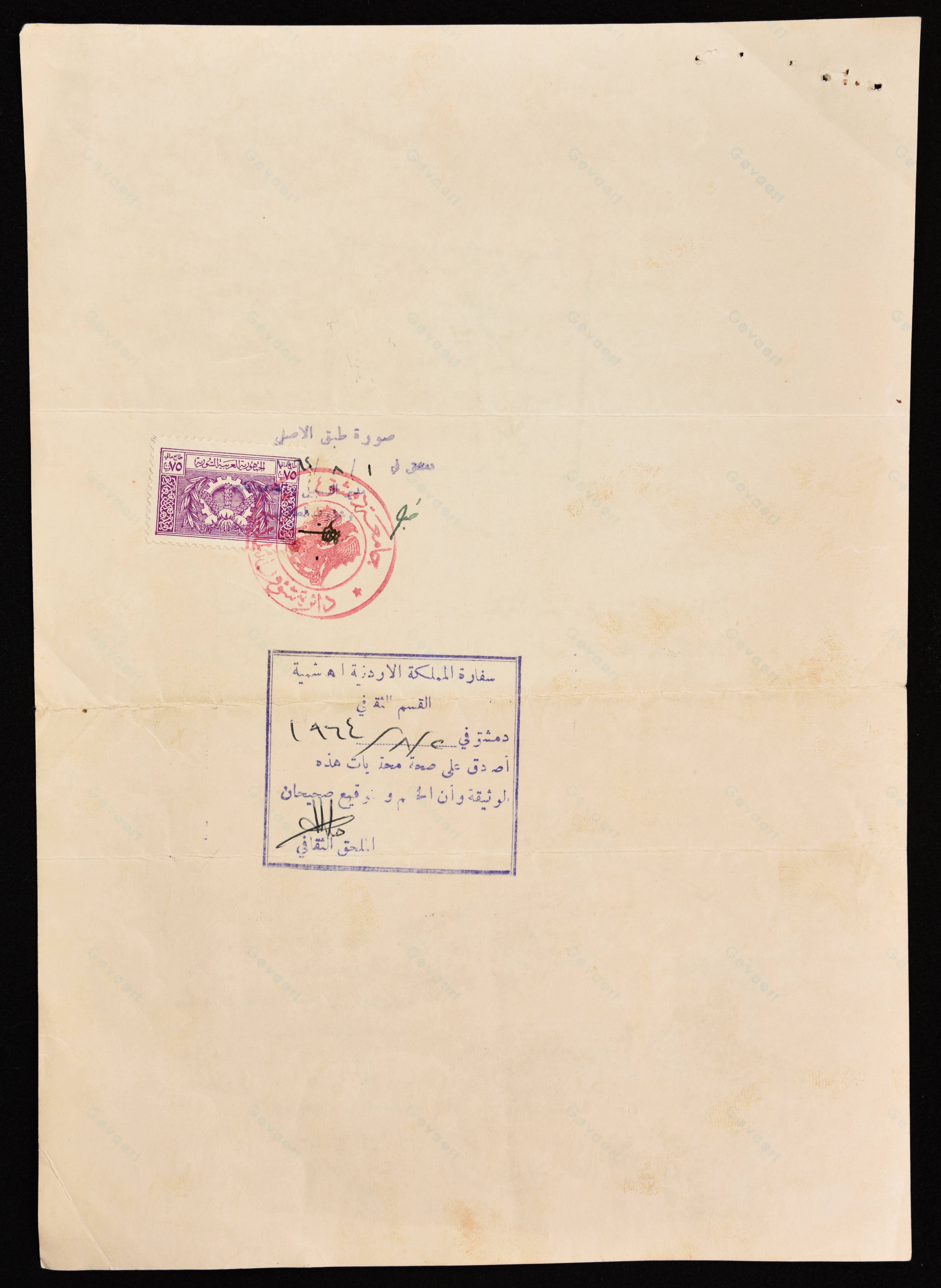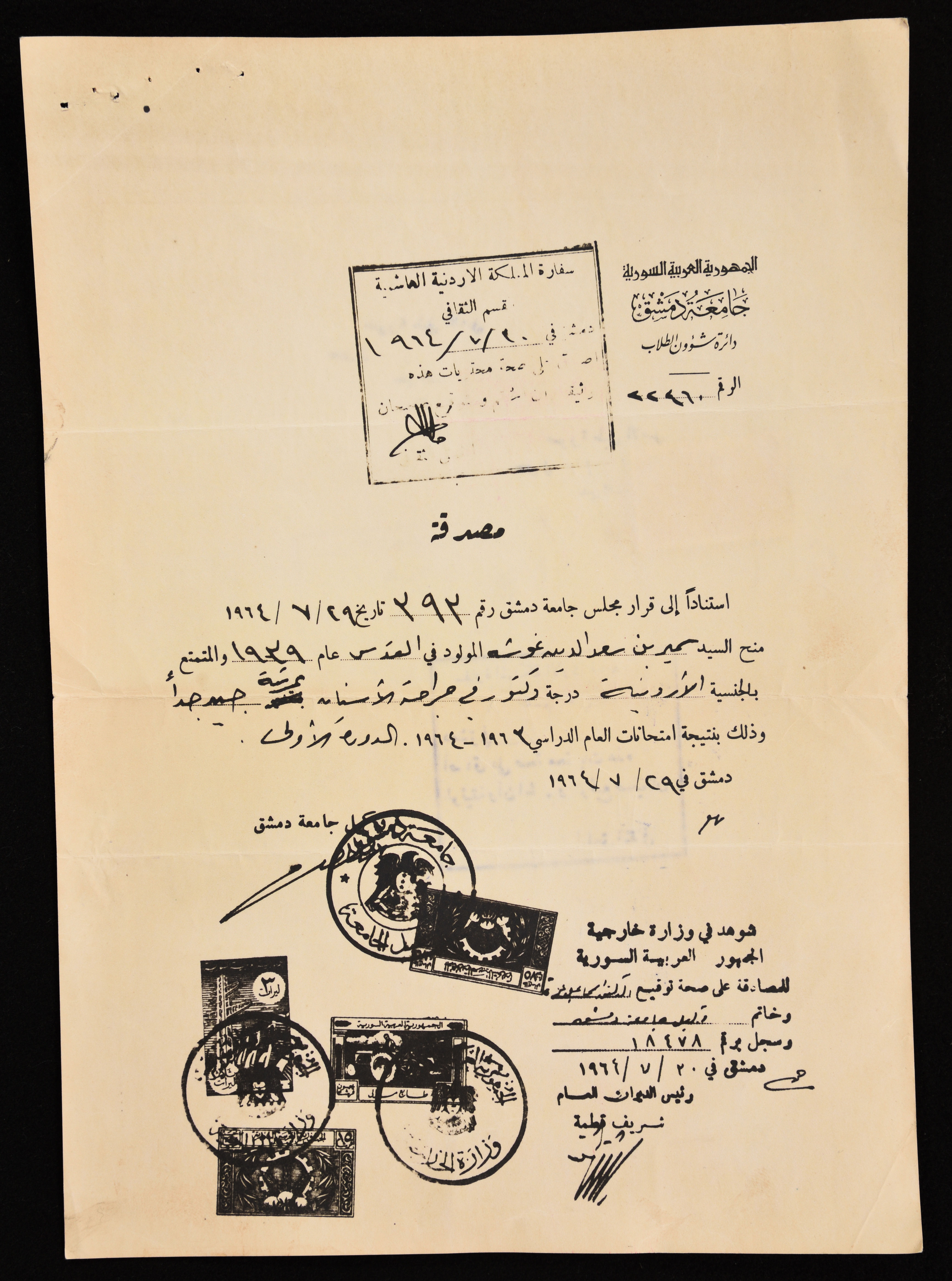 وثيقة شهادة الدكتوراة في جراحة الاسنان مرفقة بطوابع حكومية ،خاصة بالدكتور سمير غوشة استنادا الى قرار مجلس جامعة دمشق رقم 393 تاريخ 2964 بتقدير جيد جدا وذلك بنتيجة امتحانات العام الدراسي 1963-1964 الدورة الأولى