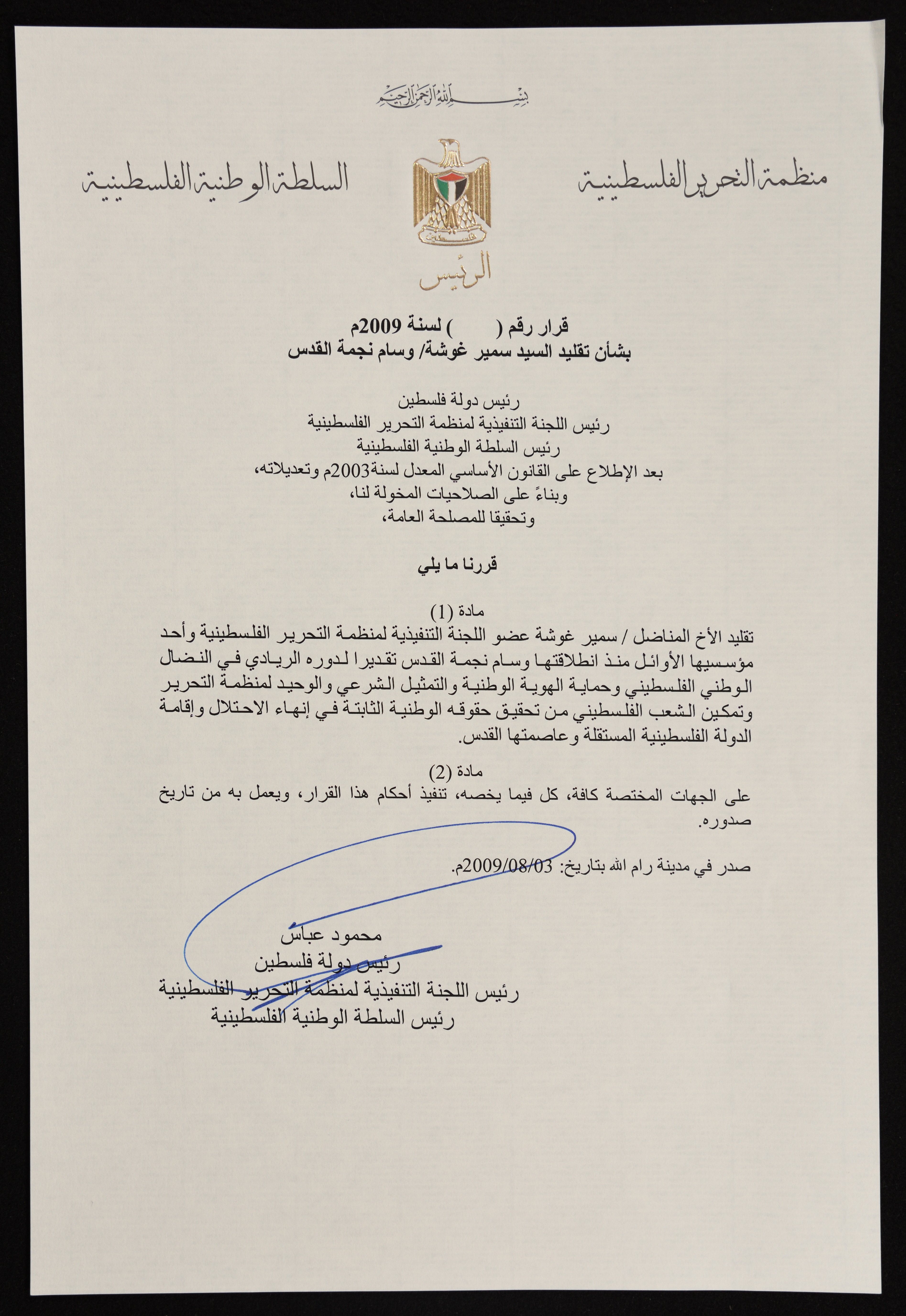 وثيقة قرار رئاسي بشأن تقليد السيد سمير غوشة وسام نجمة القدس لعام 2009 وذلك بعد الإطلاع على القانون الأساسي المعدل لعام 2003 وتعديلاته وبناء على الصلاحيات المخولة لرئيس اللجنة التنفيذية لمنظمة التحرير الفلسطينية ورئيس السلطة الفلسطينية وتحقيقا للمصلحة العامة وذلك لدور الدكتور سمير غوشة الريادي في النضال الوطني وحماية الهوية الوطنية والتمثيل الشرعي والوحيد لمنظمة التحرير