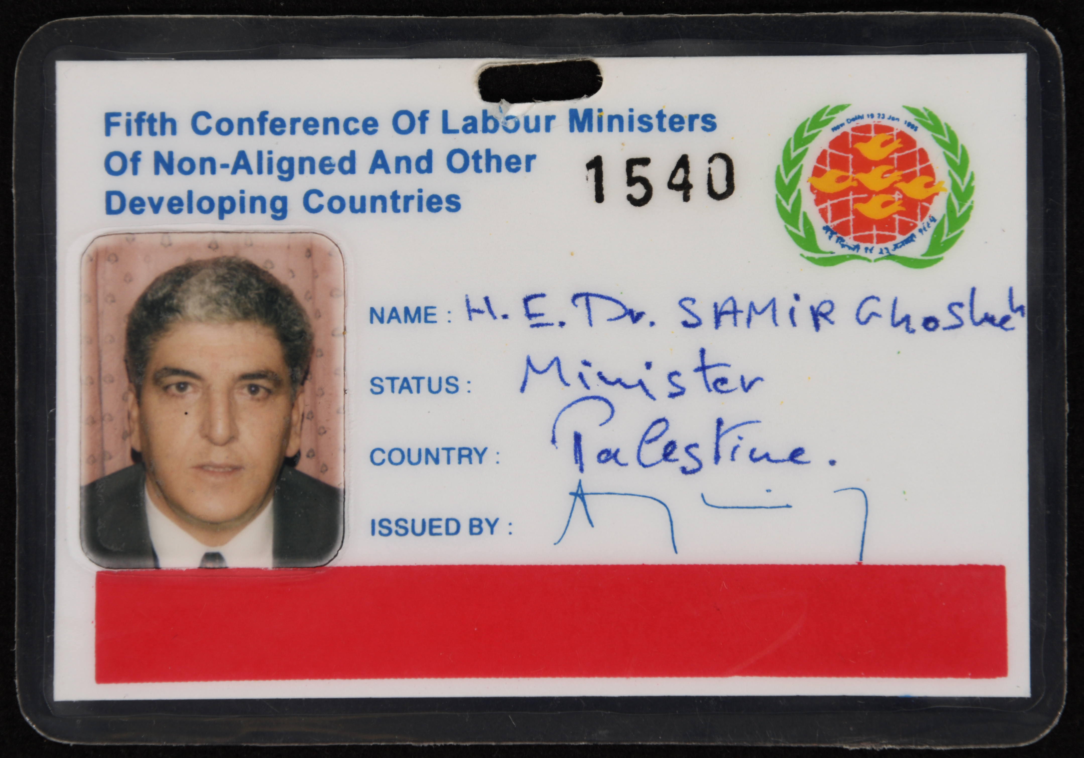 بطاقة عضوية للدكتور سمير غوشة في المؤتمر الخامس لوزراء العمل من دول عدم الانحياز والدول النامية الاخرى