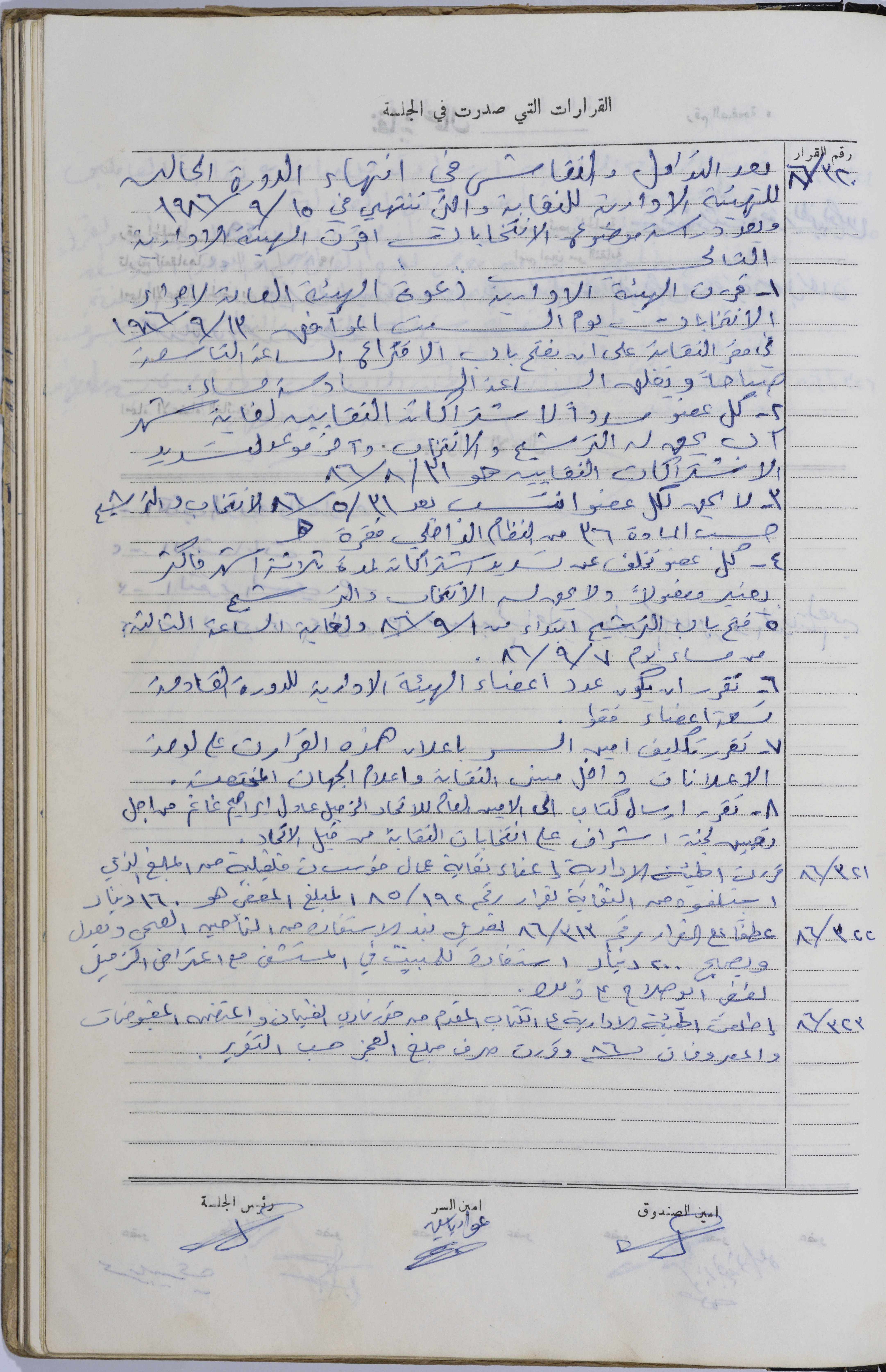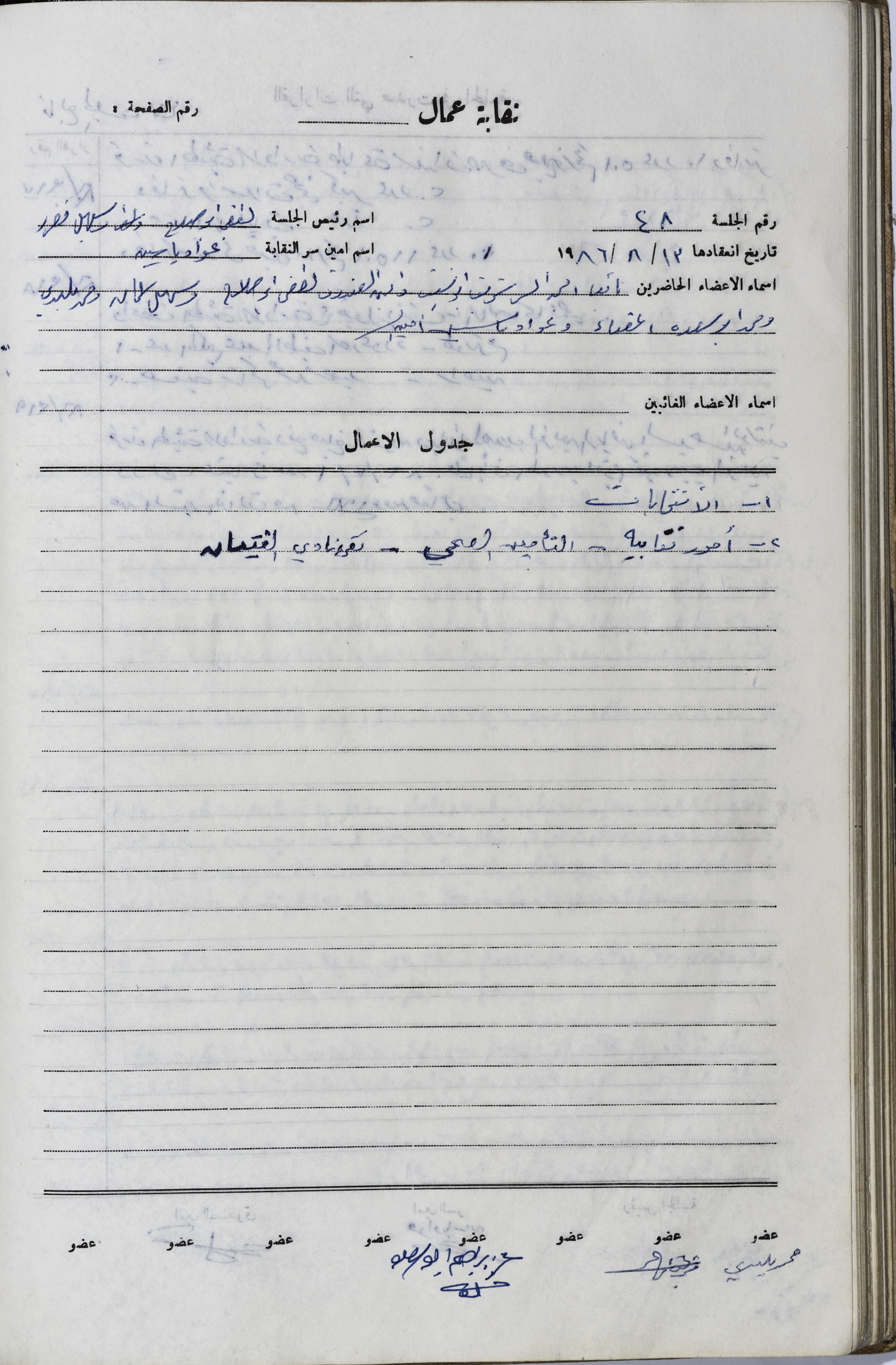 Held on 13 August 1986, this document shows minutes of meeting no. 48 of the administrative body of the Union of Workers and Employees of Municipalities, Institutions, Shops and Private Businesses in Tulkarm. The meeting primarily focused on matters related to the upcoming elections, including the expansion of the administrative body by adding new members. Additionally, there were discussions about establishing communication with the General Federation of Trade Unions to oversee and coordinate the elections.