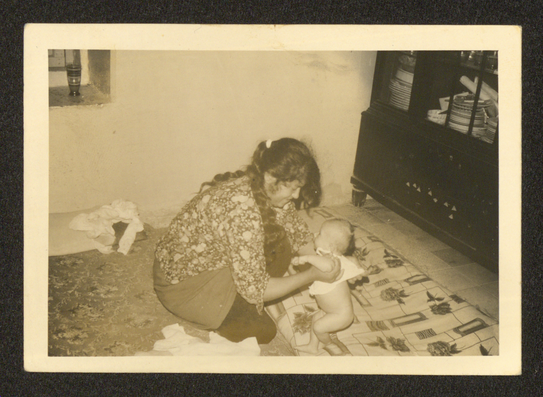 Taken in 1970, this photograph shows Insherah Masarwa in their house in Baqa al-Gharbiyye, changing her brother Rafea's clothes.