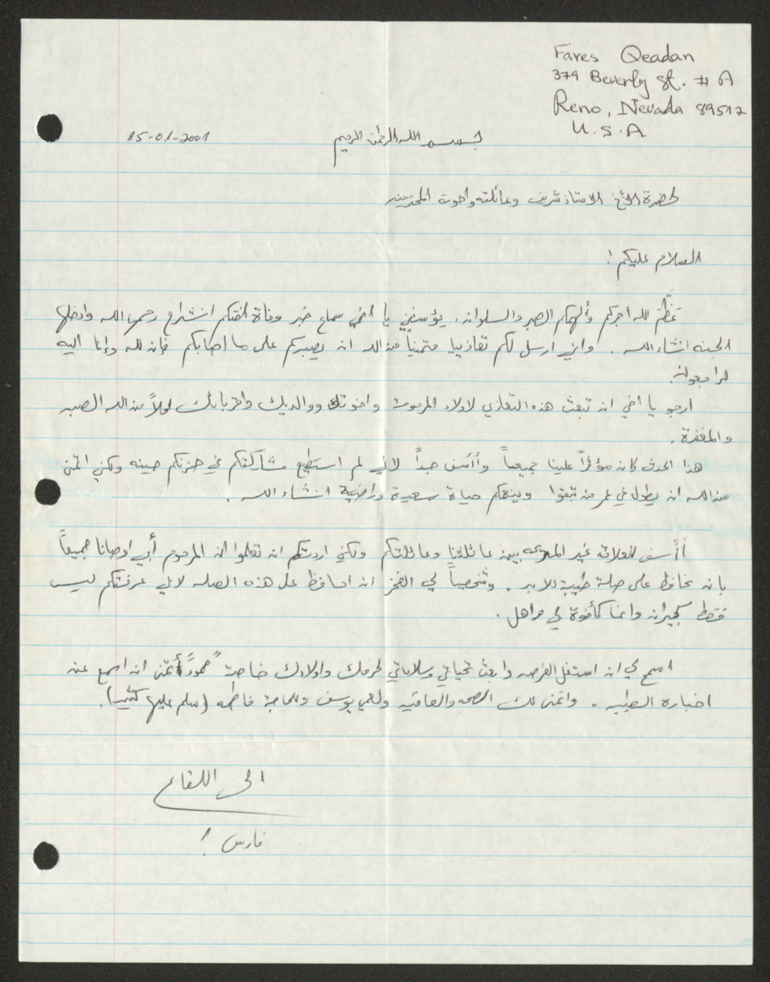 This archival item documents a condolences letter to Sharif Masarweh, his family and brothers from Faris Qidan sent on 15 January 2001 in order to comfort them following the death of their sister Inshirah and requests to deliver his condolences to the children of the deceased, his brothers and his parents.
