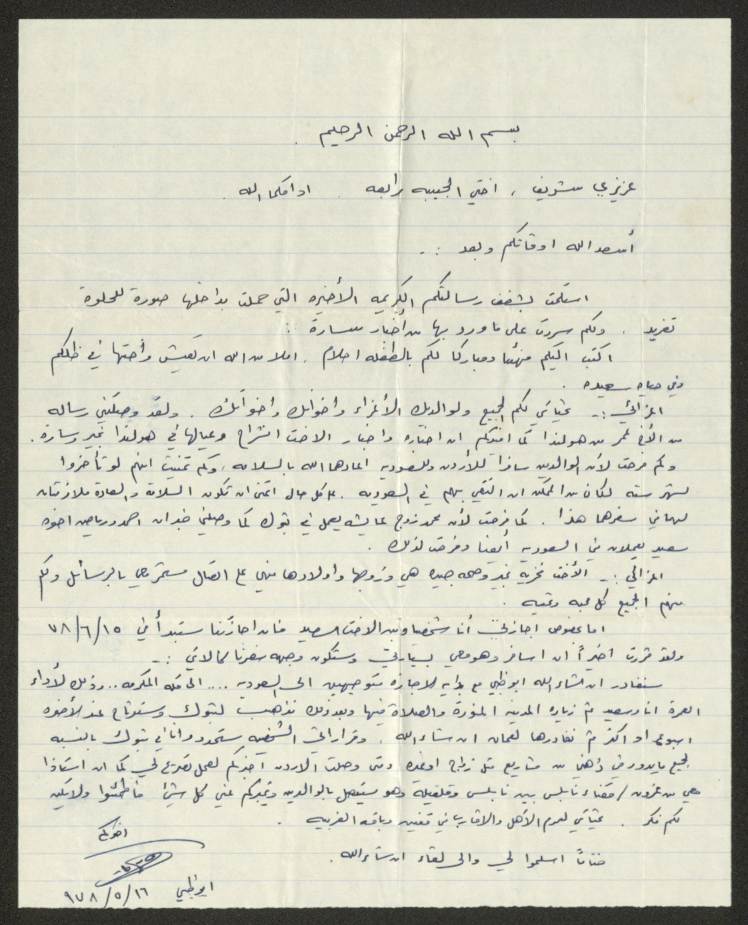 This archival item documents a handwritten letter to Sharif Masarweh and his wife Rabea from a relative of theirs in Abu Dhabi sent on 16 May 1978, confirming the receipt of their recent letter which included a photograph of their daughter Taghreed and that that they felt happy while reading the news, they then congratulated them on the arrival of their new baby daughter "Ahlam", and then send their greetings to everyone and confirm that they received the letter from Omar in Holland and the news of Inshirah Masarweh and her children and informs them that they were amused seeing their parents travelling to Jordan and Saudi Arabia and wished if they had the chance to meet them and then they conclude the letter by talking about themselves; as their vacation starts on 15 June 1978 and that they shall leave Abu Dhabi once the vacation starts to Mecca in Saudi Arabia to perform Umrah along with Saed and then to visit the Medina, pray and leave for Amman.