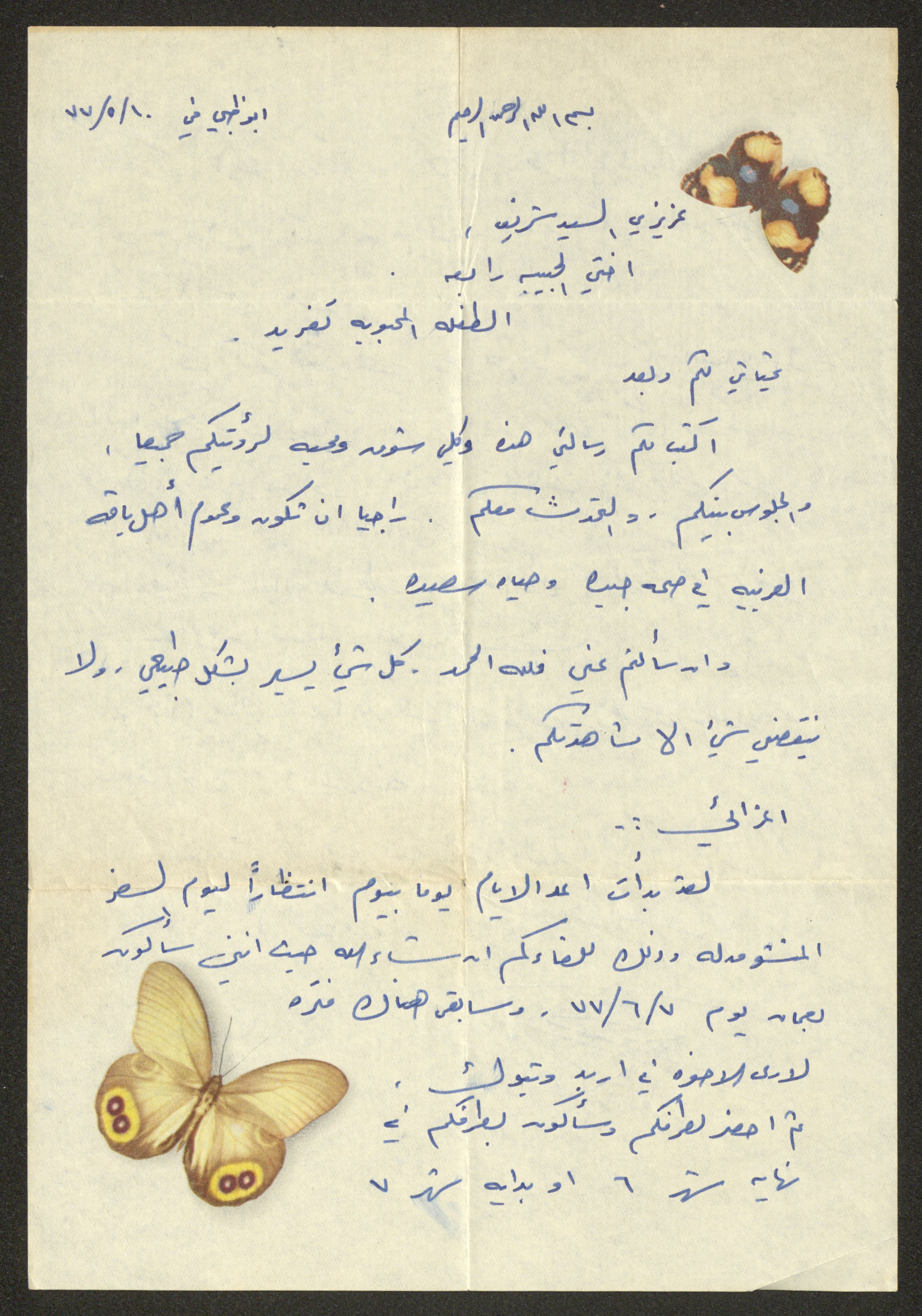 A Letter to Sharif Masarweh and his Wife Rabea from Abed al-Karim al-Bittar, 10 May 1977