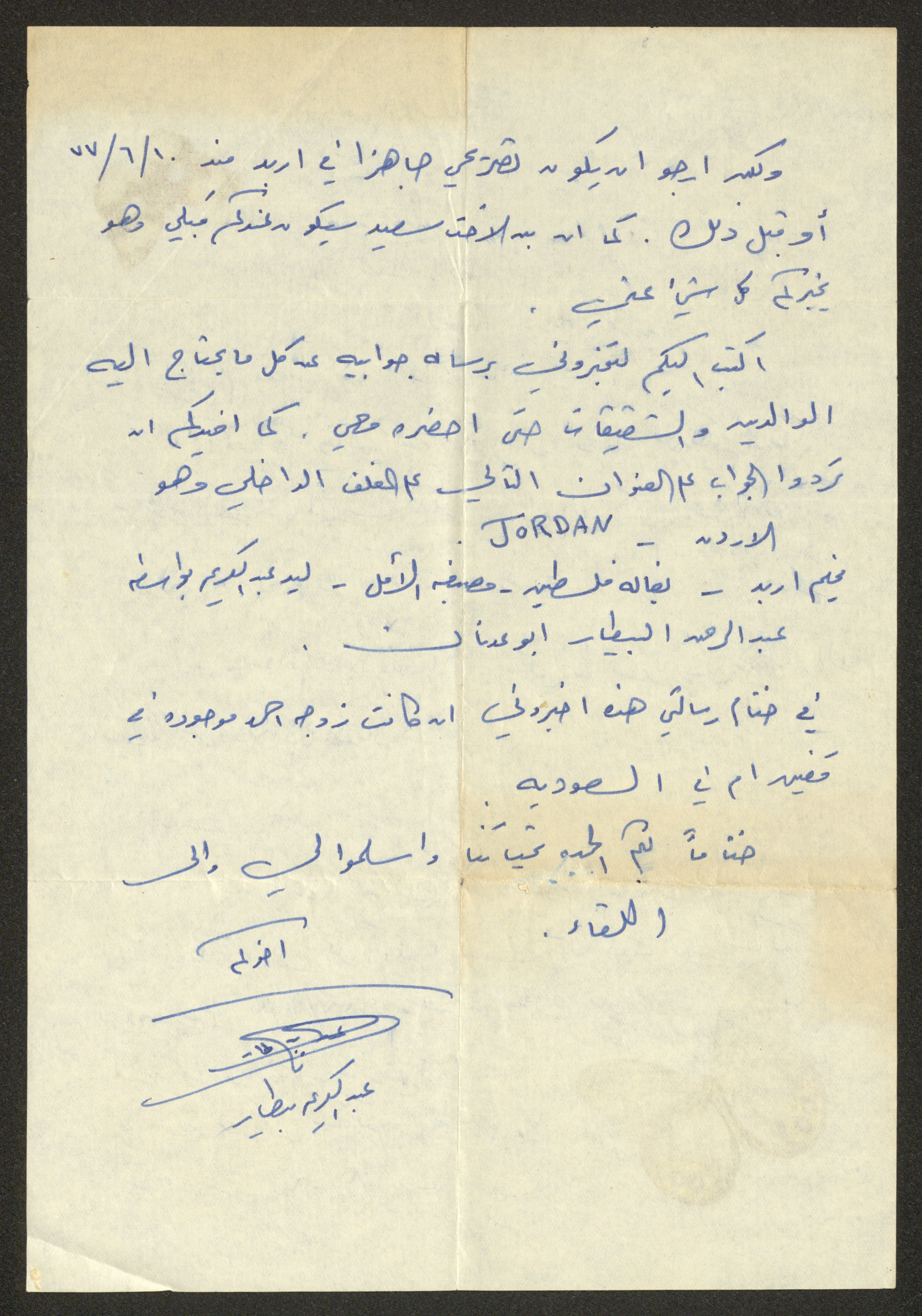 This archival item documents a handwritten letter to Sharif Masarweh and his wife Rabea from Abed al-Karim al-Bittar in Abu Dhabi sent on 10 May 1977, in the beginning of this letter he expresses how much he wants to see everyone and sit with them, then comforts them that he is doing well and wants nothing but to see them, that he is counting the days to travel; as expected to arrive in Amman on 7 June 1977 and will stay there to see the brothers in Irbid and Tabuk, he then says that he will come to Baqa al-Gharbiyye by the end of June or early July and asks them if they want anything so that he brings it with him.