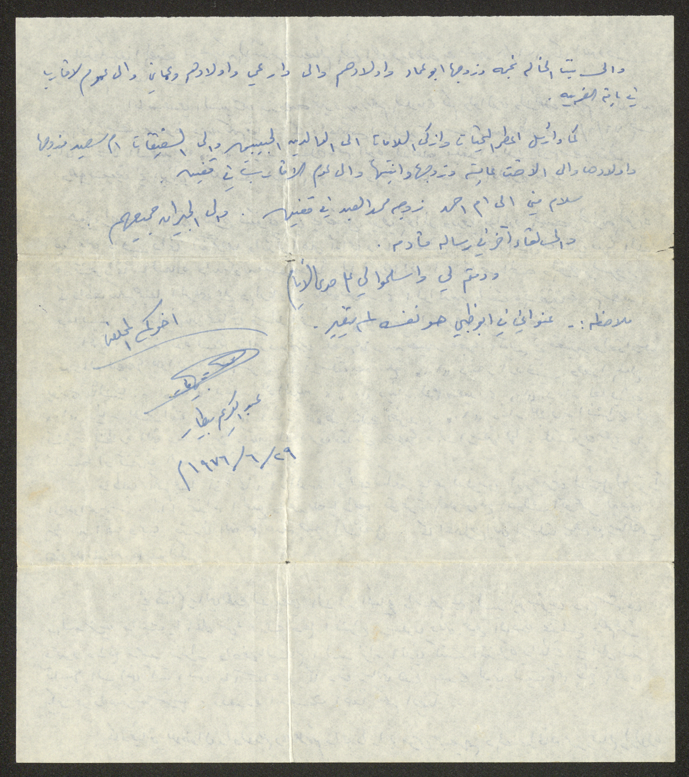 A Letter to Sharif Masarweh and his Wife Rabea from Abed al-Karim Bittar, 29 June 1976