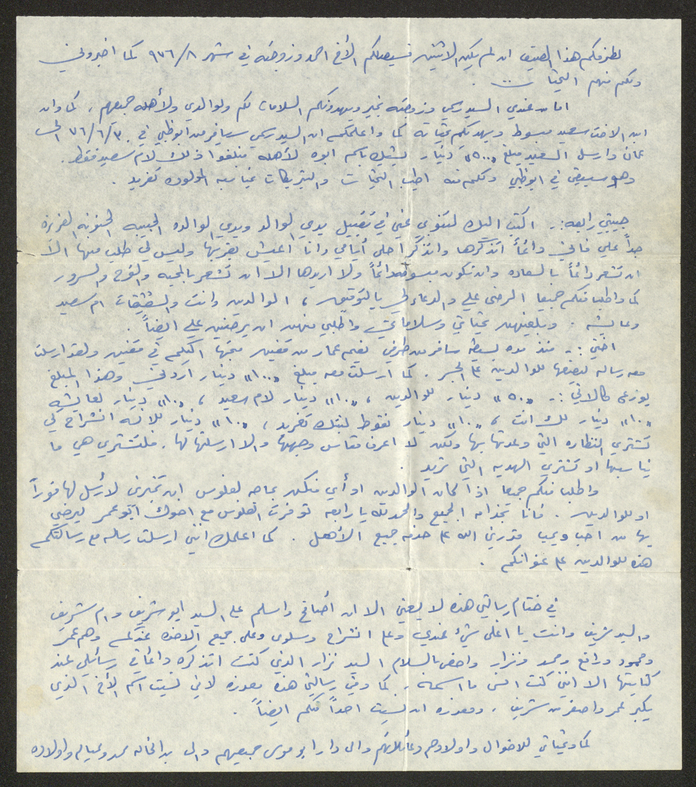 This archival item documents a handwritten letter to Sharif Masarweh and his wife Rabea from her brother Abed al-Karim Bittar in Abu Dhabi sent on 29 June 1976, in the beginning of the letter he informs them that Ahmad and his wife are to arrive in August 1976, Rasmi and his wife also send their regards and he will be travelling from Abu Dhabi on 30 June 1976 to Amman, therefore, he sent a cheque of 150 JD's in the name of his father to his family, he also sends his congrats on the birth of new baby daughter Taghreed, and requests from his sisters to kiss the hands of his parents on his behalf and he always remembers them and wants nothing but to see them happy, he also informs his sister that he sent a letter to his parents along with Naeem Ammar from Qaffin and place it at the bridge, attached to the letter is 100 JD's; 50 of which are for his parents, 10 for Umm Saeed, 10 for Inshirah so that she can buy the pair of glasses he promised her, 10 for Aisha, 10 fro Rabea, and 10 for the new baby daughter "Tgahreed" and concludes by sending his greetings to the family.