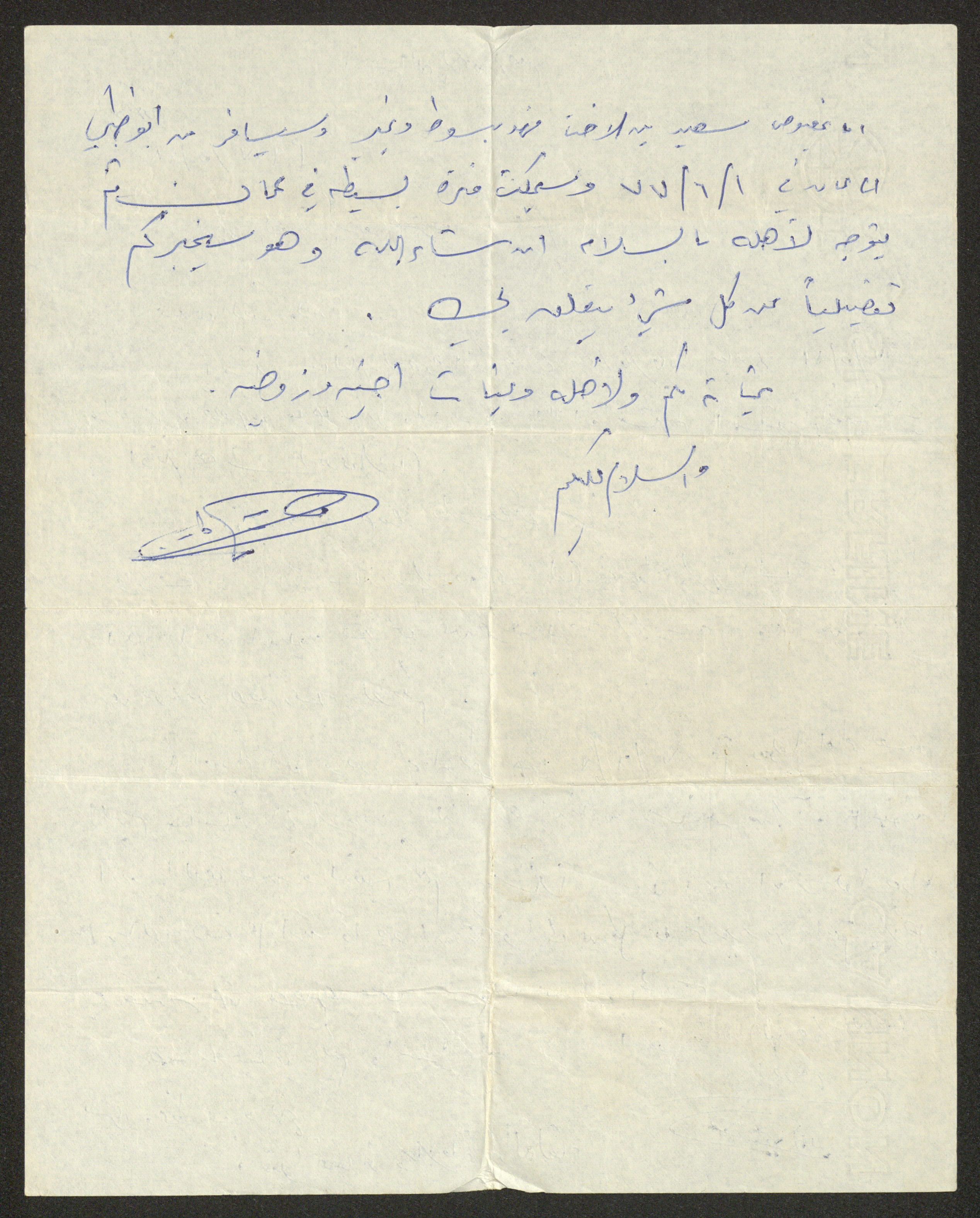 This archival item documents a handwritten letter to Sharif Masarweh from one of his relatives in Abu Dhabi sent on 18 May 1977, where he sends his greetings and confirms the receipt of their recent letter on 4 May 1977, and then he comforts them about himself; as he is doing well, needs nothing and informs them that he is currently in Abu Dhabi until 7 June 1977 and then he is to travel to Jordan and wants to be sent all the needs of family in the town of Qaffin.