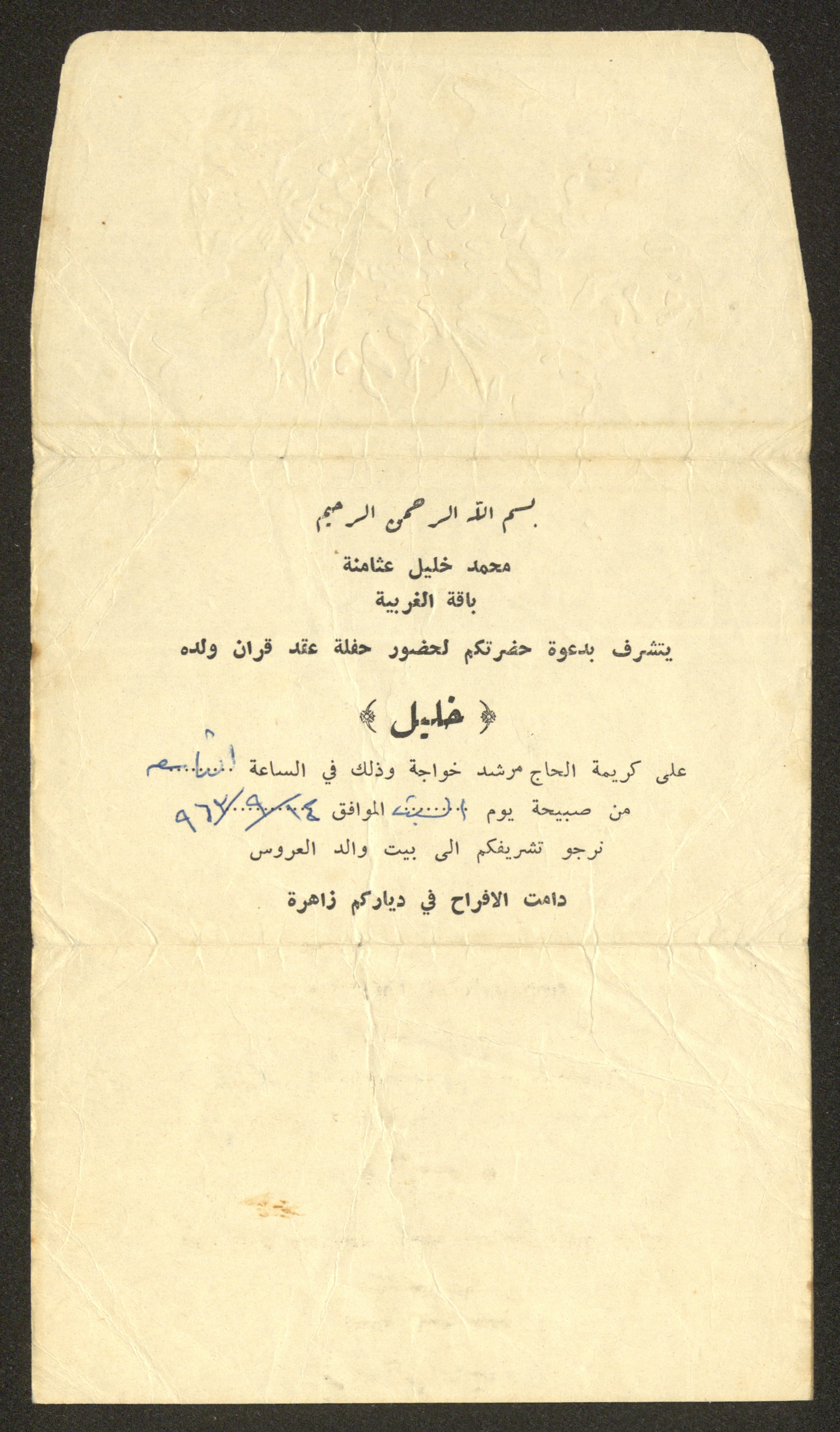 This archival item documents a wedding invitation card from Muhammad Khalil Athamneh, a citizen of Baqqa al-Gharbiyee to Faris Hamdan al-Hajj Ahmad to attend the wedding of his son Khalil and Karima al-Hajj Murshed Khawajeh and it is to be held on Saturday, 14 September 1963.