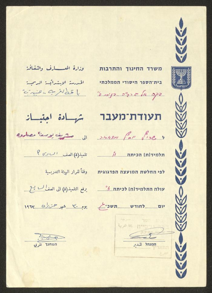 This archival item documents Sharif Masarweh's certificate of completion issued by the Official Secondary School of Baqqa al-Gharbiyee "B" on 30 June 1963, therefore, Masarweh is to be elevated from the 6th-grade to the 7th-grade and it is signed by the homeroom teacher and the headmaster.