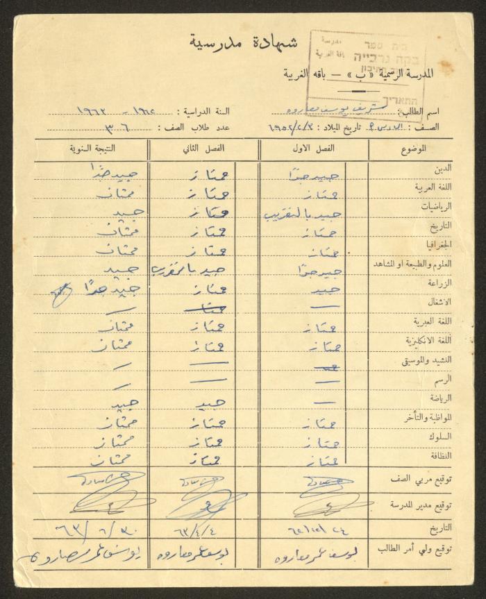 "Sharif Masarweh's Sixth Grade Certificate" Issued by the Official School "B" in Baqqa al-Gharbiyye, 3 February 1952