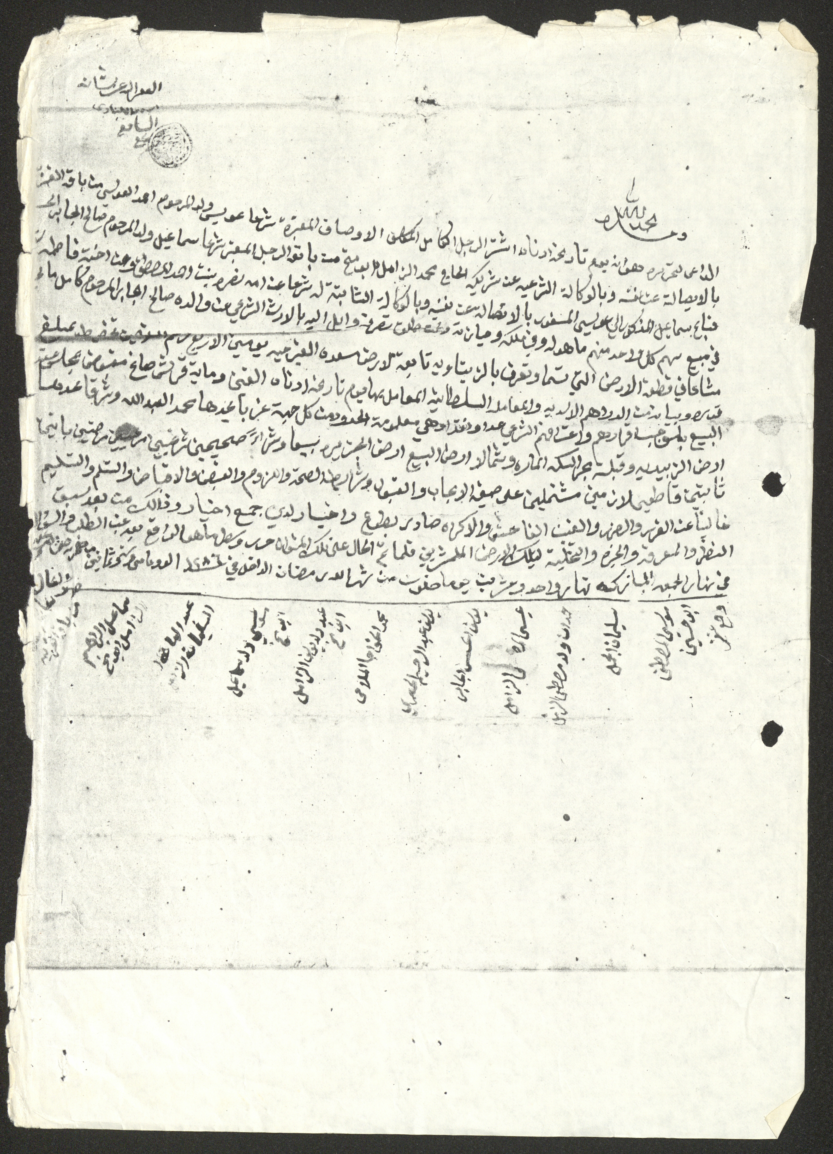This archival item documents a land sale agreement between the first party represented by Ismael Saleh al-Jaber and the second by Owais Ahmad al-Owaisi and they are both from Baqqa al-Gharbiyee; whereas the first part vowed to sell and empty a piece of land that is part of Masad's land for 2100 pennies and this was witnessed by Ismael Azzamal, Mousa Ismael, Yousif Abederrahmim and others.