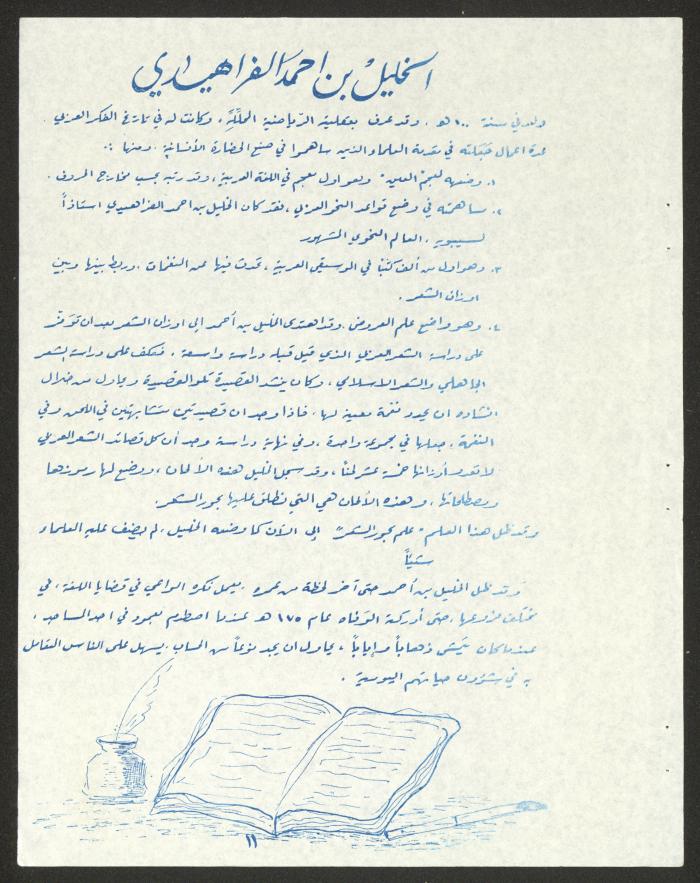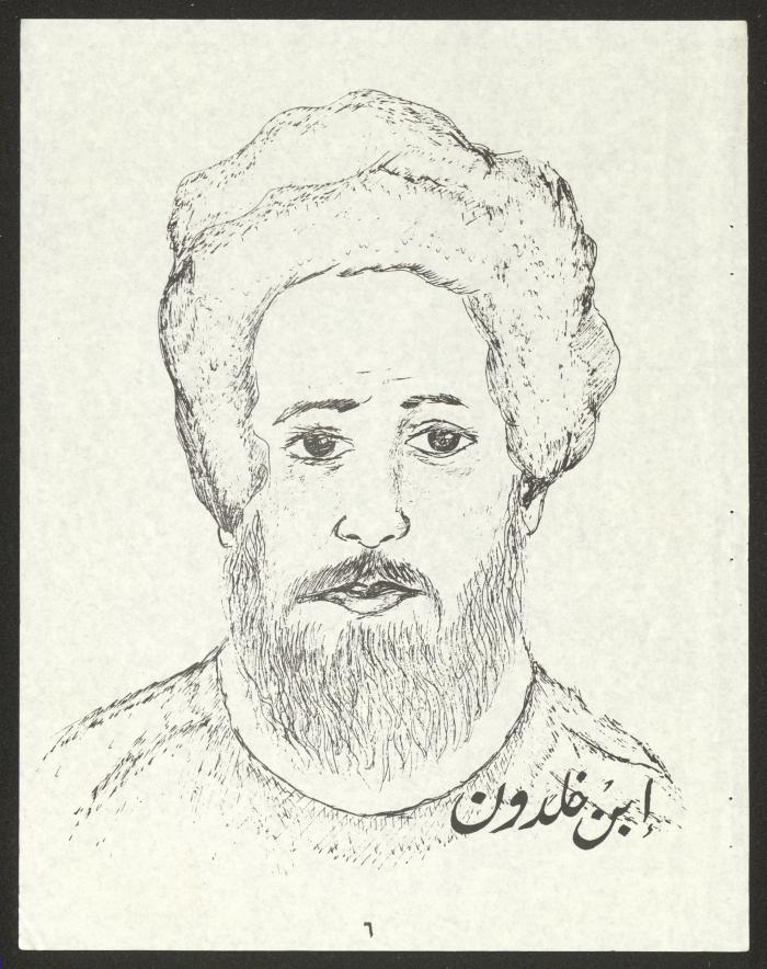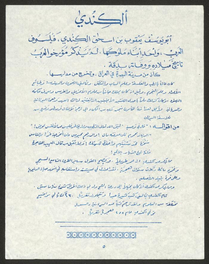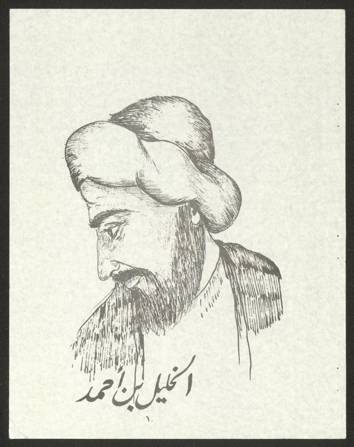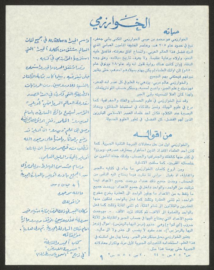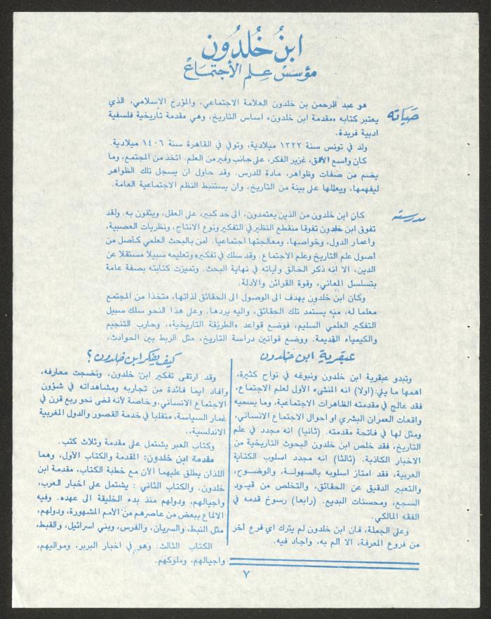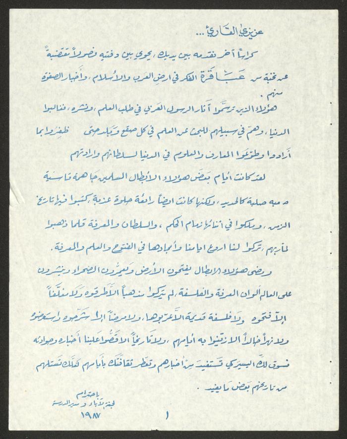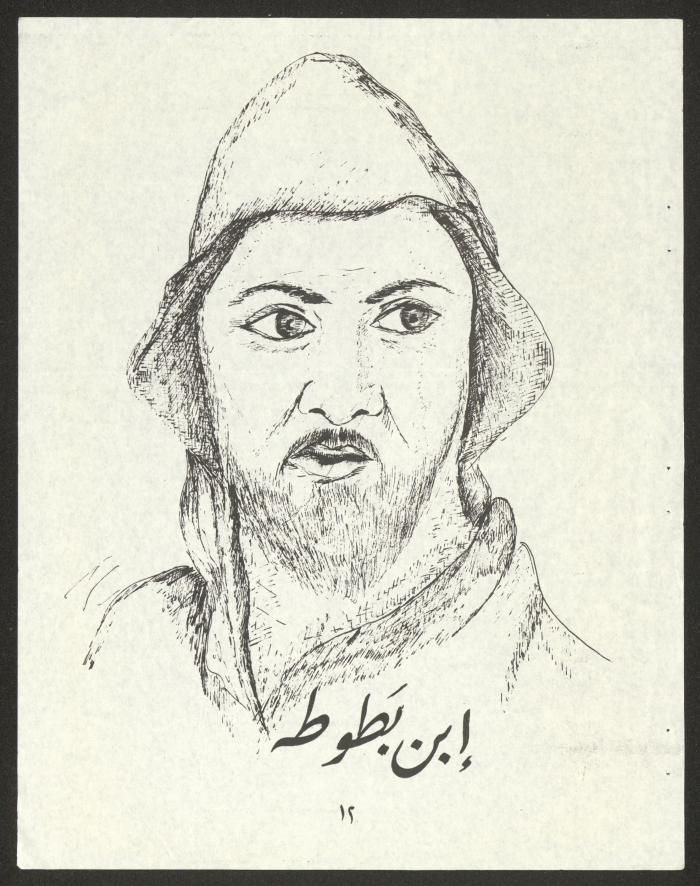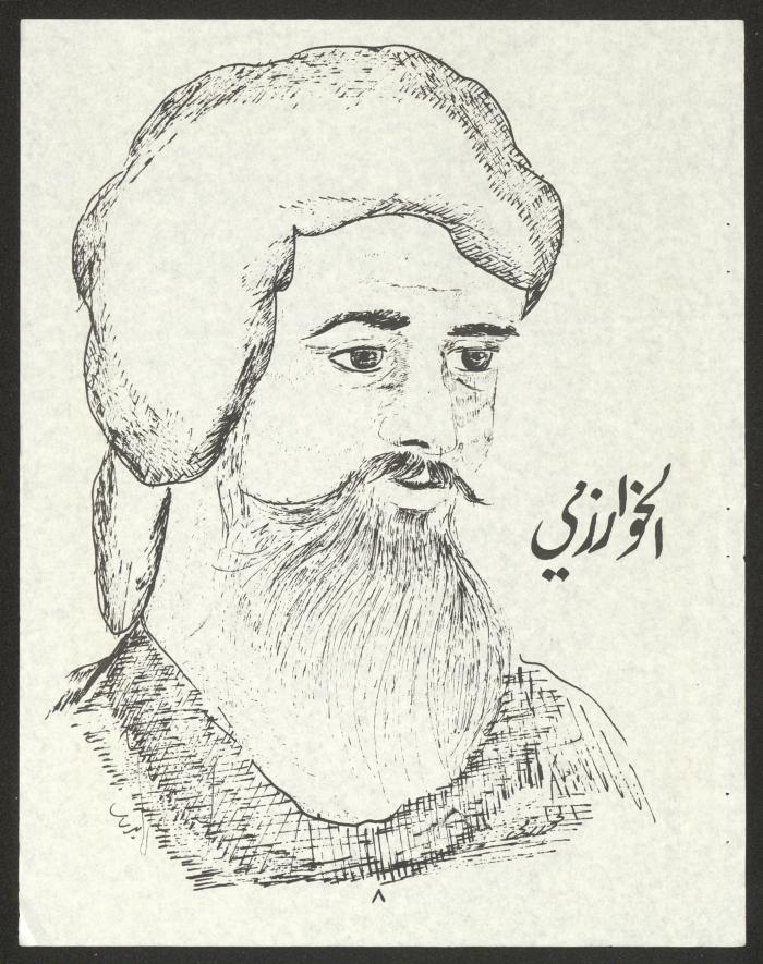 Issued in 1987, this document shows a booklet titled "Muslim Figures" published by al-Ghazali Elementary School in Baqa al-Gharbiyye. The booklet features drawn portraits and brief information about Arab and Muslim intellectual geniuses, including Salah ed-Din al-Ayyubi, Abu Yusuf Yaqoub bin Ishaq al-Kindi, Abdul Rahman bin Khaldun; an Islamic historian and author of the book "The Introduction of Ibn Khaldun" which is considered the basis of history and is seen as a unique historical, philosophical, and literary introduction, Muhammad ibn Musa al-Khwarizmi, nicknamed Abu Jaafar; lived during the rule of the Abbasid Caliph al-Ma'mun, al-Khwarizmi; an Arab scientist who invented logarithms and algebra and laid its foundations, al-Khalil bin Ahmad al-Farahidi; known for his analytical mathematical mentality and had several works on Arabs history, making him at the forefront of scholars who contributed to the creation of human civilization, and Ibn Battuta.
