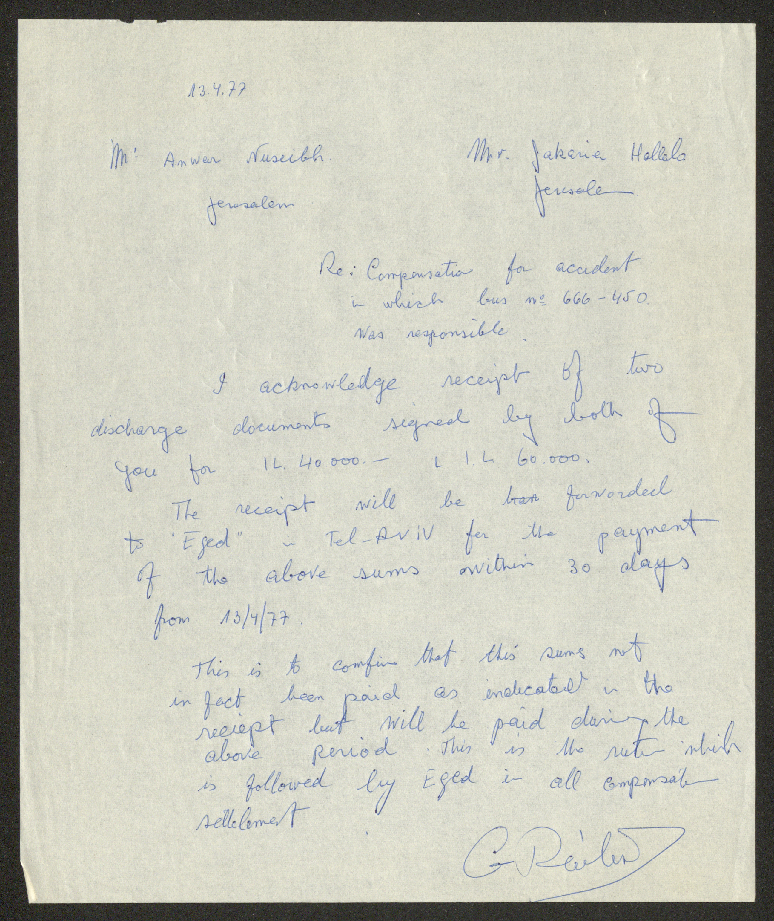 رسالة مؤرخة في 13 نيسان 1977، موجهة إلى أنور نسيبة في القدس.