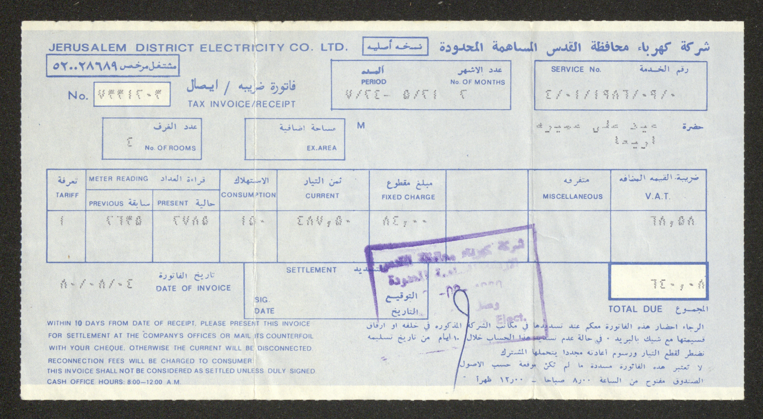 فاتورة ضريبة من شركة كهرباء محافظة القدس إلى عيد علي عميرة بتاريخ 4 آب 1980، عن مدة بلغت شهرين، لما مجموعه 4 غرف، وقد بلغ الاستهلاك فيها 150 وحدة، كما أرفق فيها مبلغ بدل ضريبة القيمة المضافة.