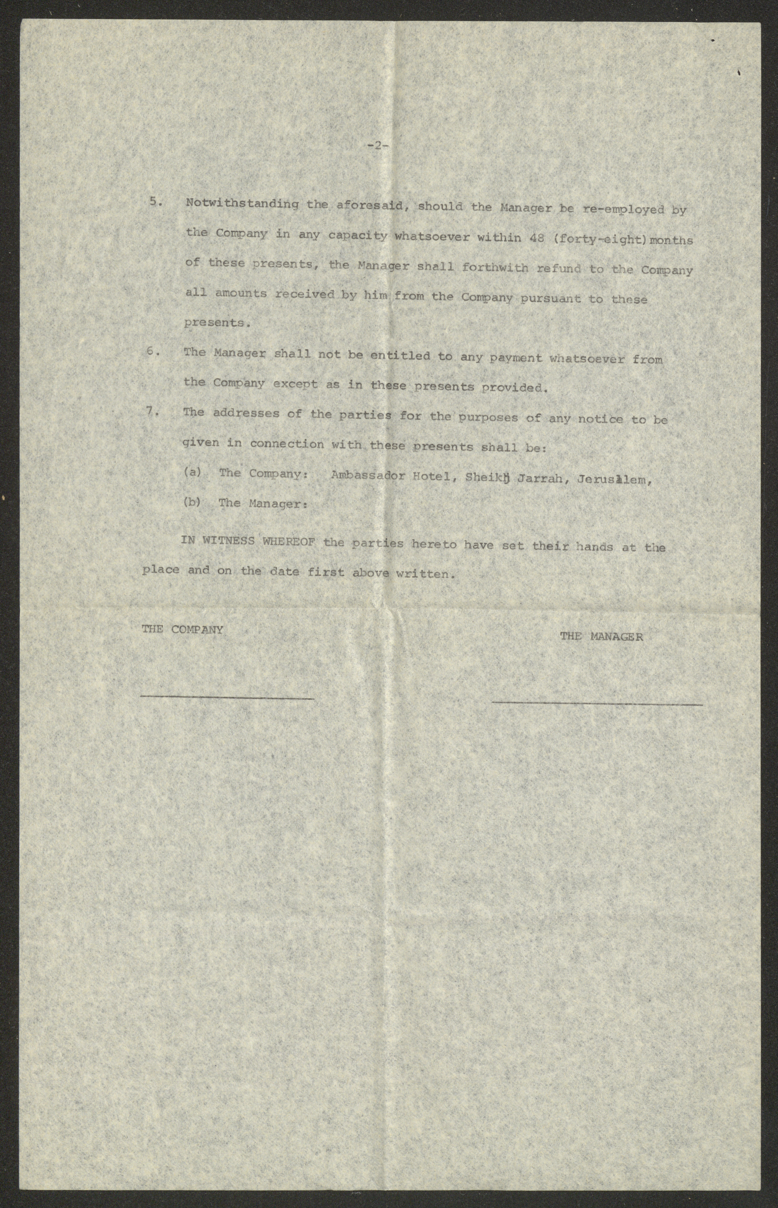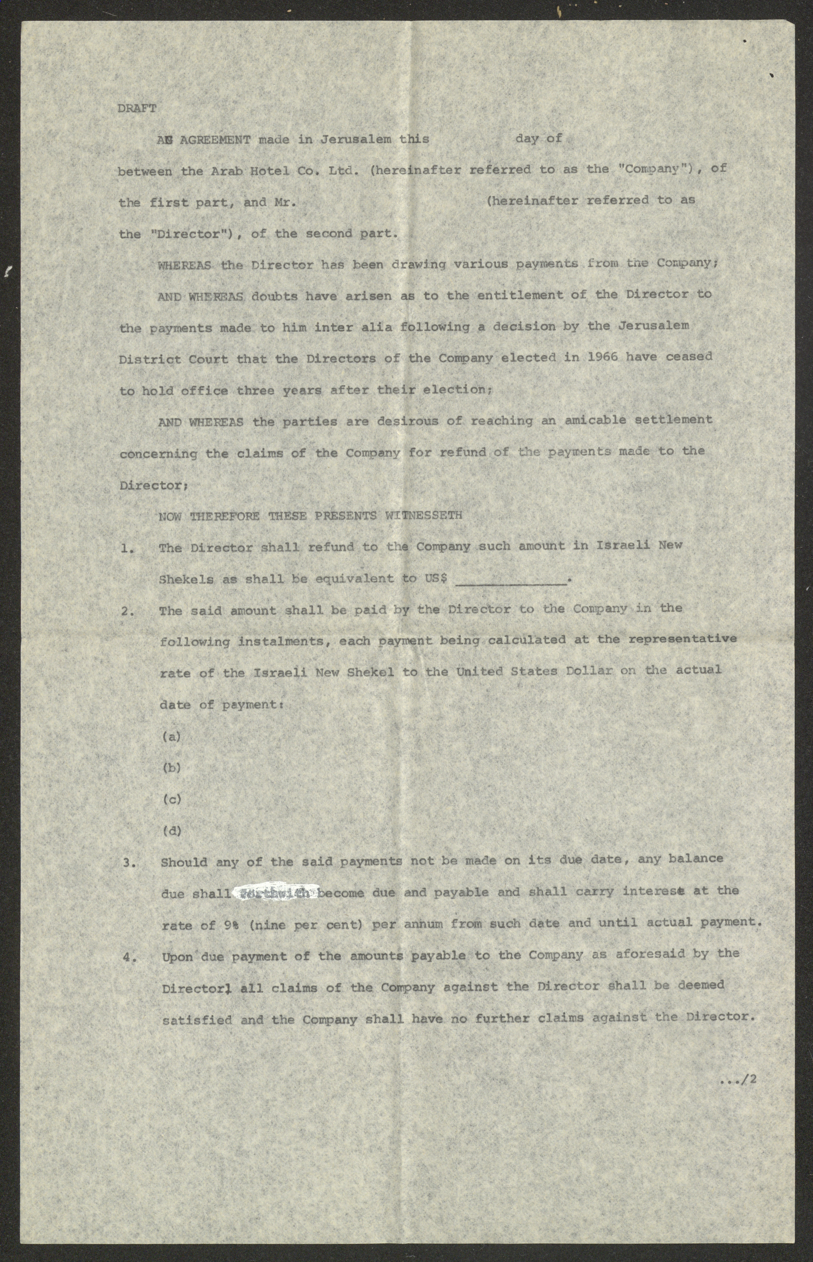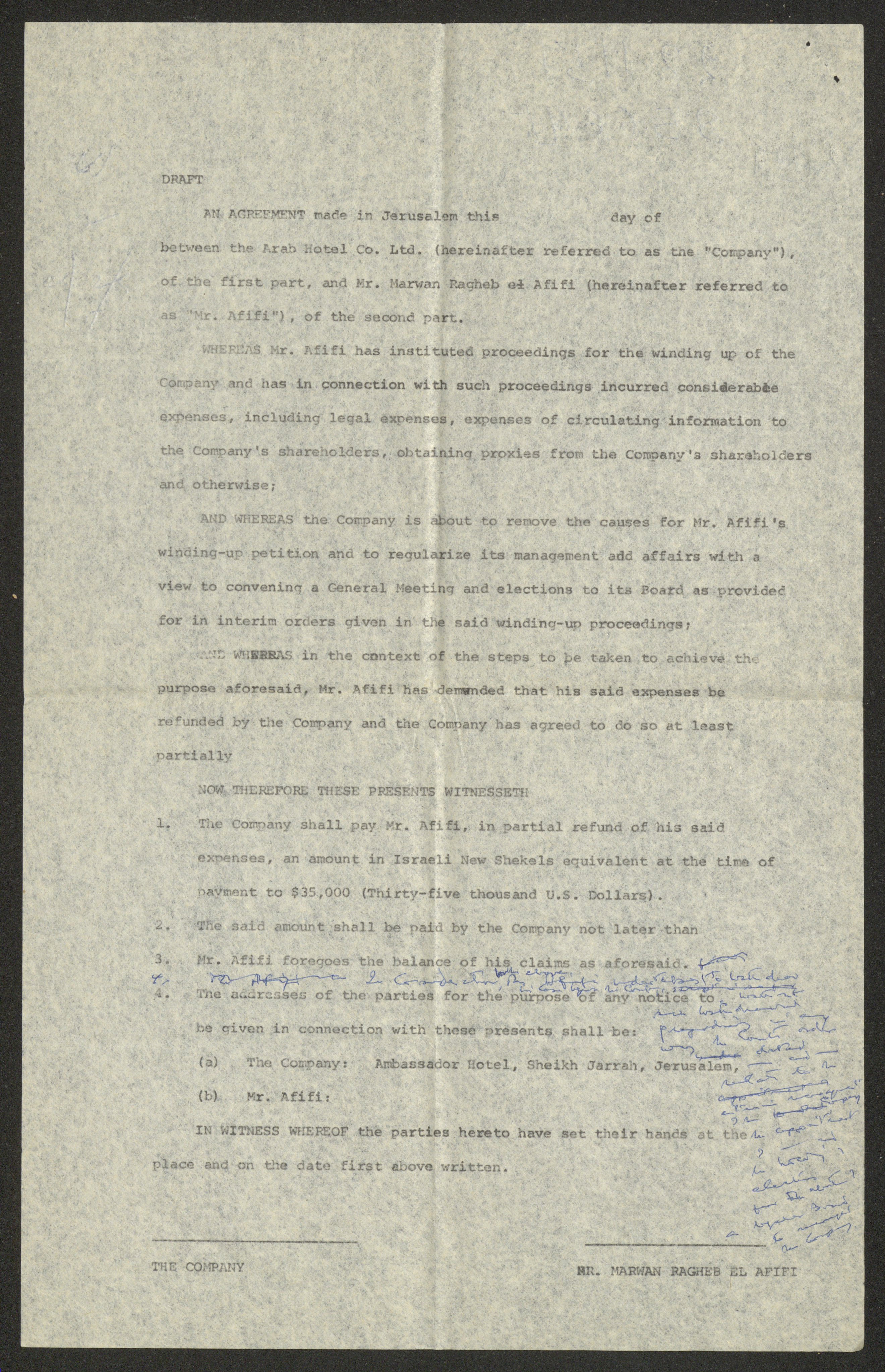 مجموعة غير مؤرخة من مُسَوَّدات لاتفاقياتٍ قانونية بين شركة الفنادق العربية المحدودة وأطراف آخرين ممثلين بأشخاص مختلفين في كل مُسَوَّدة.