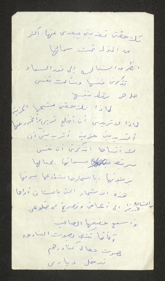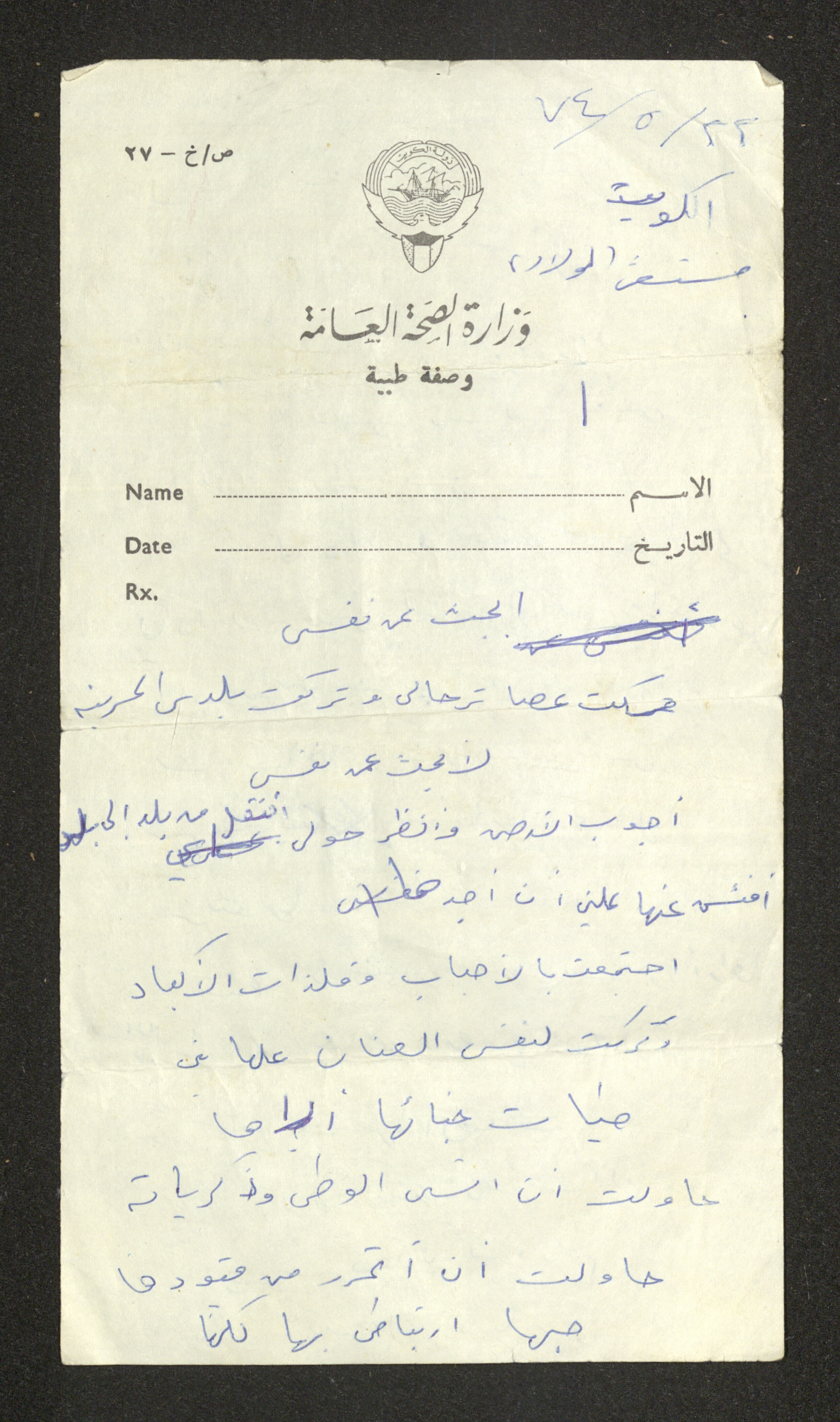 Found in the Sari Nusseibeh Collection and written on 22 May 1974, this document shows flash prose written in the maternity hospital in Kuwait on a Ministry of Public Health prescription form titled "Looking for Myself," where the prose states that the writer left his bereaved country to look for himself, and talks about the olives and the streets of their country.