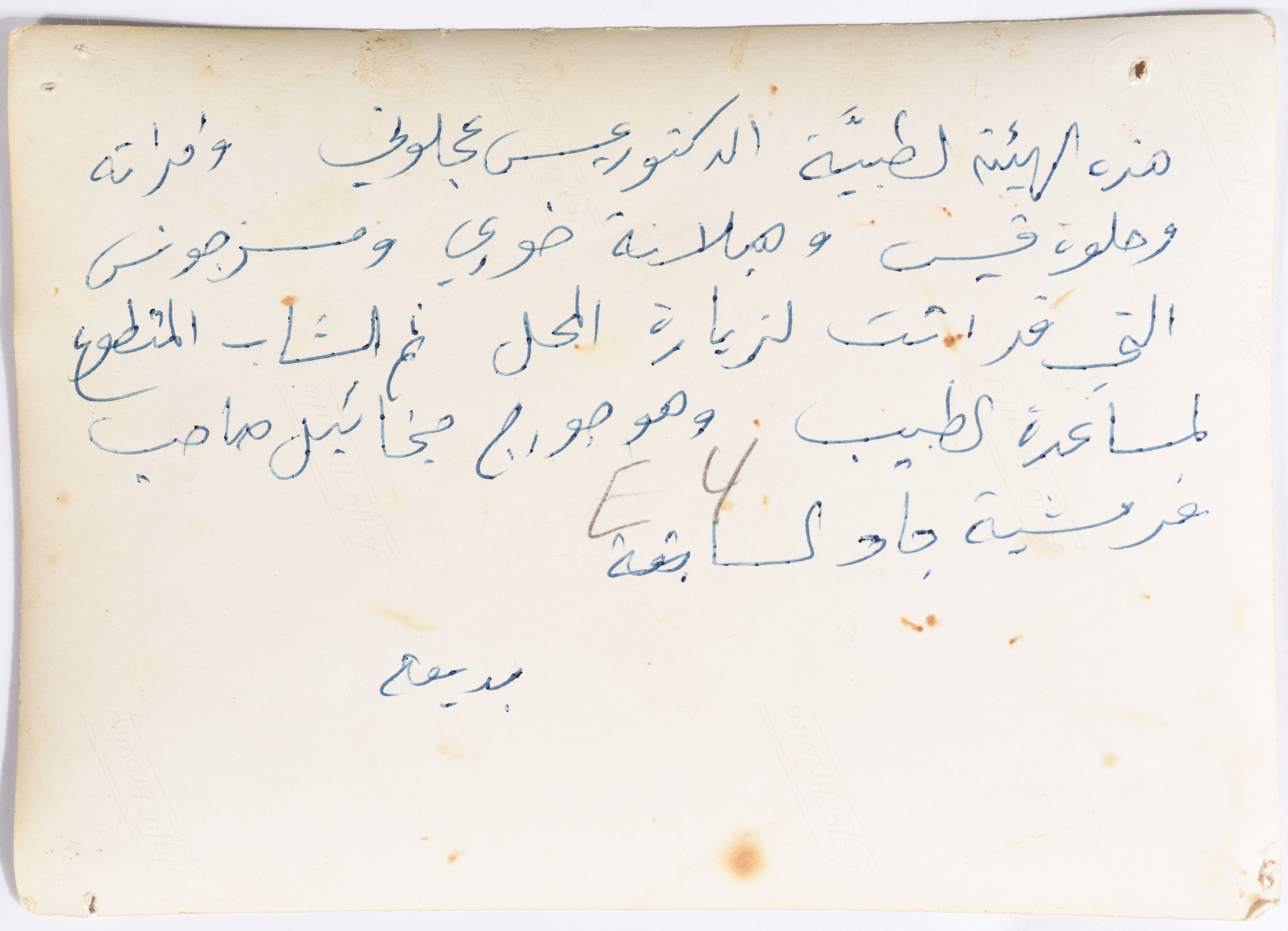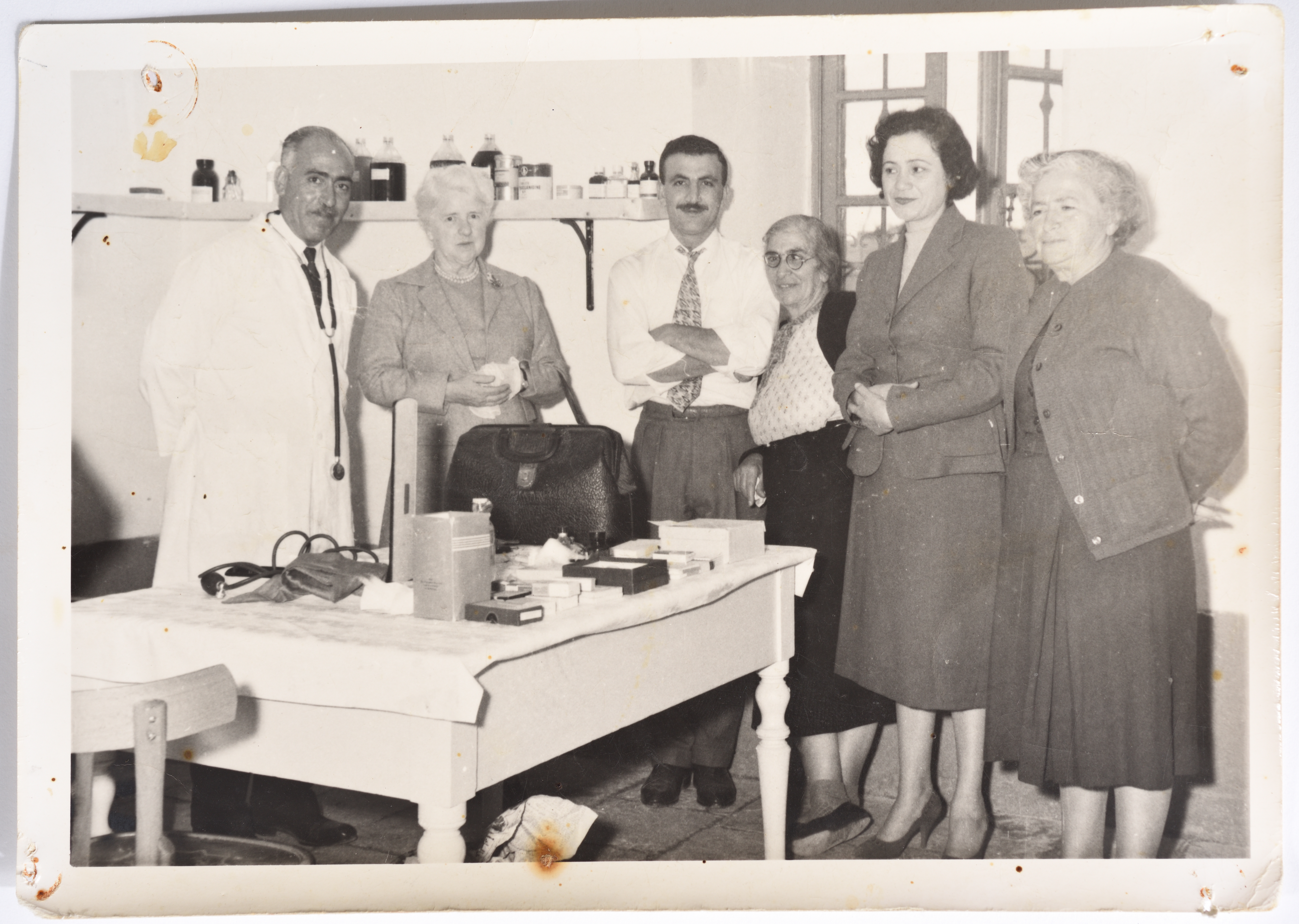 صورة للعيادة الطبية التابعة لجمعية النهضة النسائية في رام الله، في أواخر ستينيات القرن العشرين. يظهر في الصورة الطبيب عيسى عجلوني وحلوة قسيس وهيلانة خوري وجورج ميخائيل.