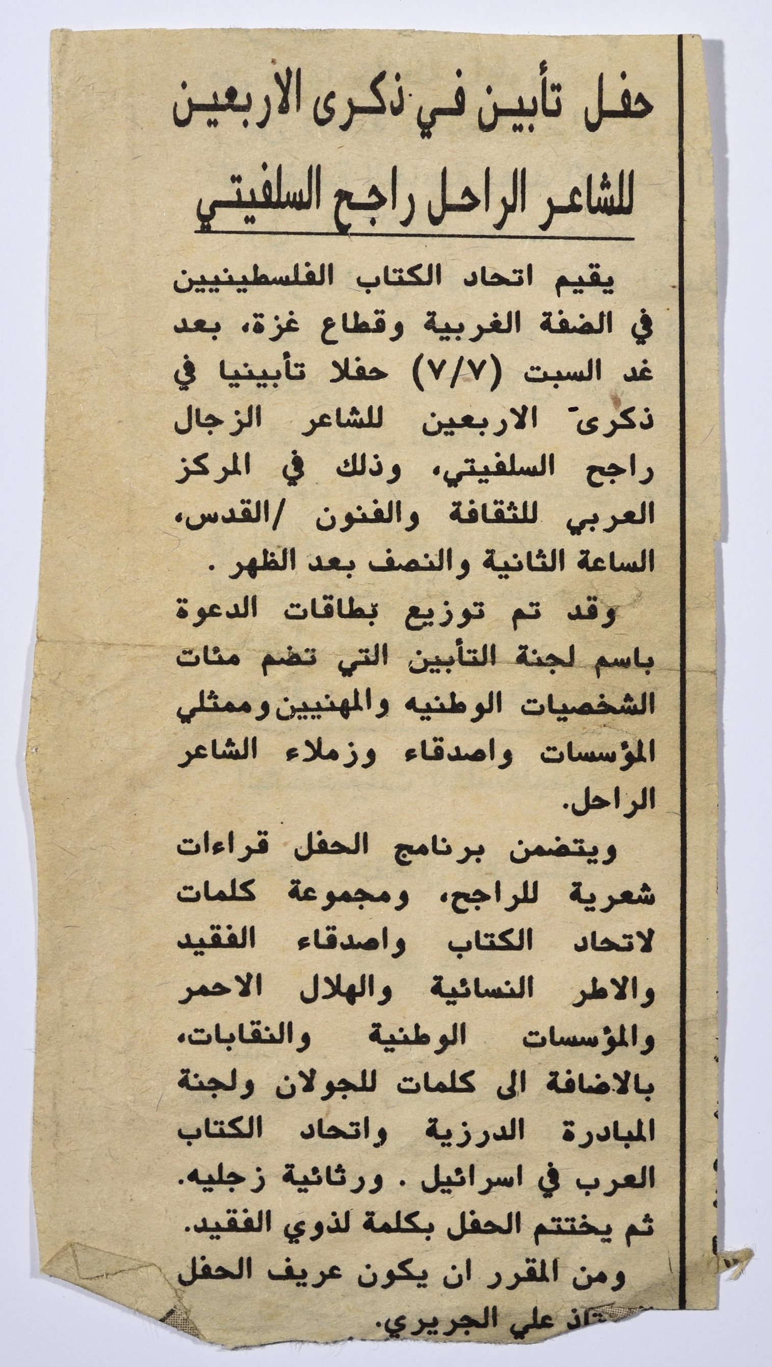 وثيقة مكونة من صفحة واحدة، تتضمن قصاصة من جريدة تحتوي على نص الاعلان الذي نشر في جريدة الطيلعة، حيث أقام اتحاد الكتاب الفلسطينيين حفل تأبين في ذكرى مرور اربعين يوم على رحيل راجح السلفيتي بتاريخ 7/7/1990 في المركز العربي للثقافة والفنون في القدس، وتمت دعوة العديد من الجهات الرسمية في الضفة والقطاع وفي أراضي فلسطين المحتلة عام 1948