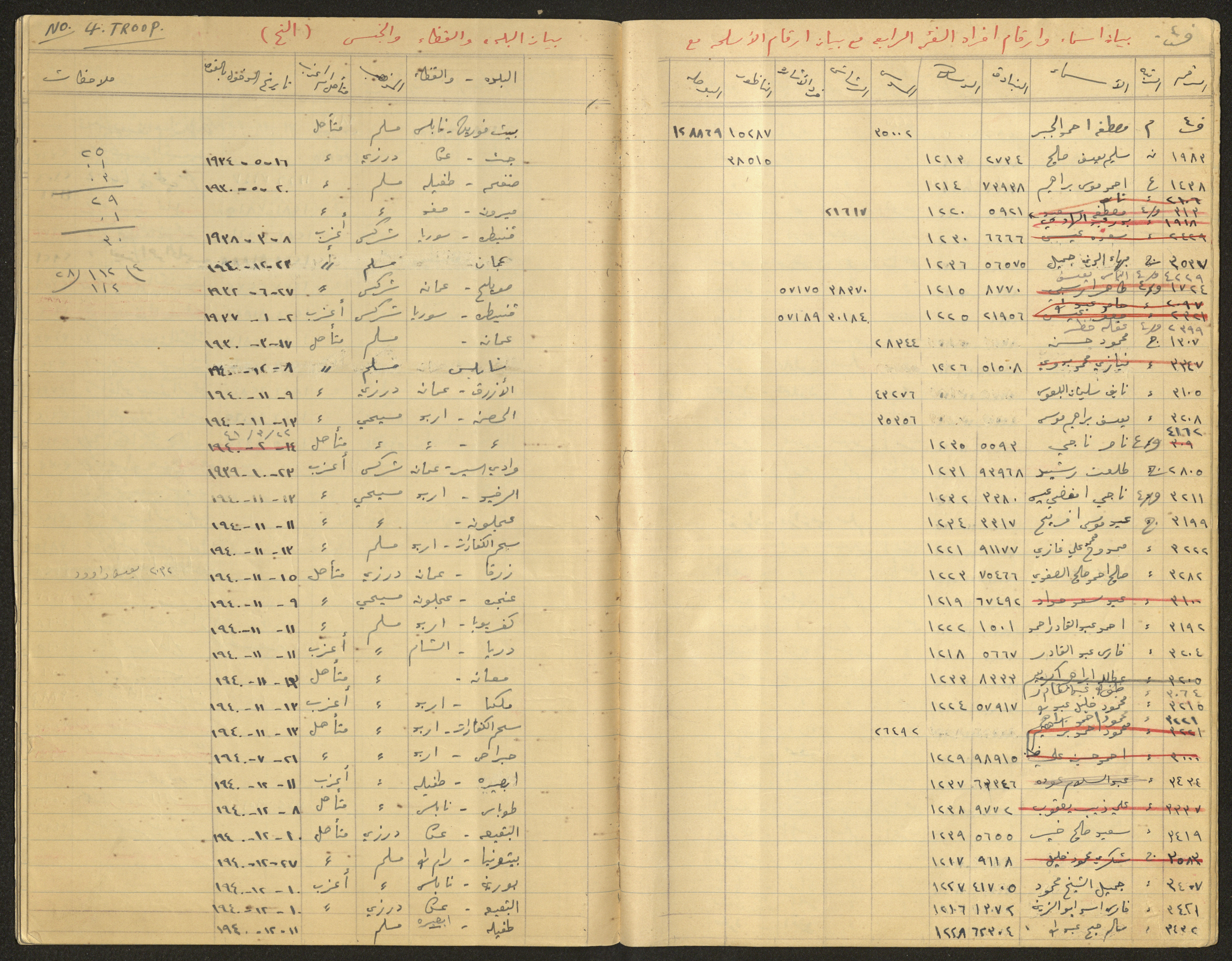This document shows a book of data and information related to the "battalion" that was formed in the Transjordan Frontier Force on 6 January 1941 and was arranged in Irbid on 14 January 1941. The book contained several lists, including a list of the names of the leadership class in the battalion, the numbers of their weapons, and the name of the country, village, city or district for each officer of this category, his religion, and the date of his joining.