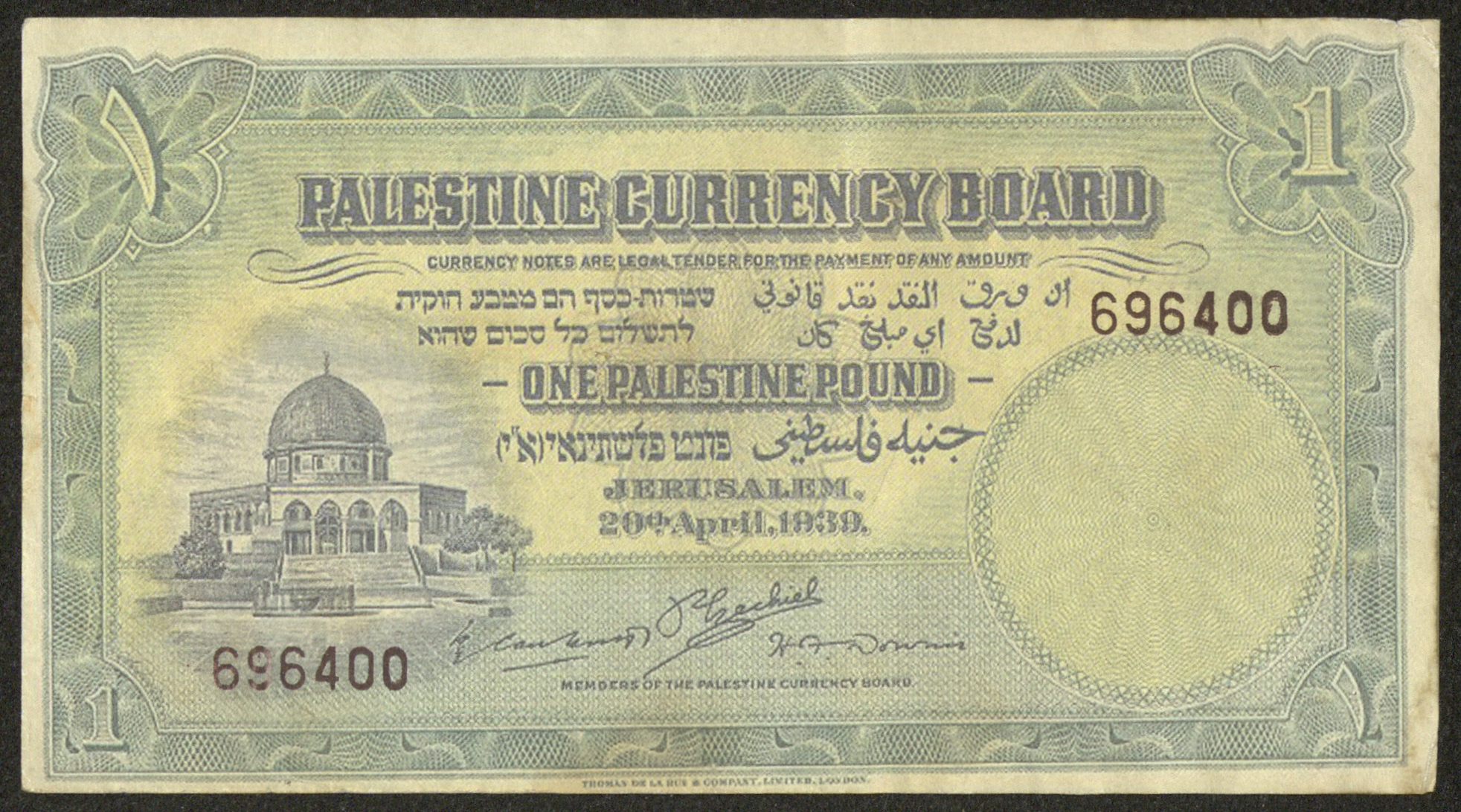 Issued in Jerusalem and circulated during the British Mandate of Palestine until the 1948 Nakba, this document shows a Palestinian Pound with the following note "currency notes are legal tender for the payment of any amount", written in the three official languages of the British Mandate; English, Arabic and Hebrew. A photograph of the Dome of the Rock also appears on the Pound.