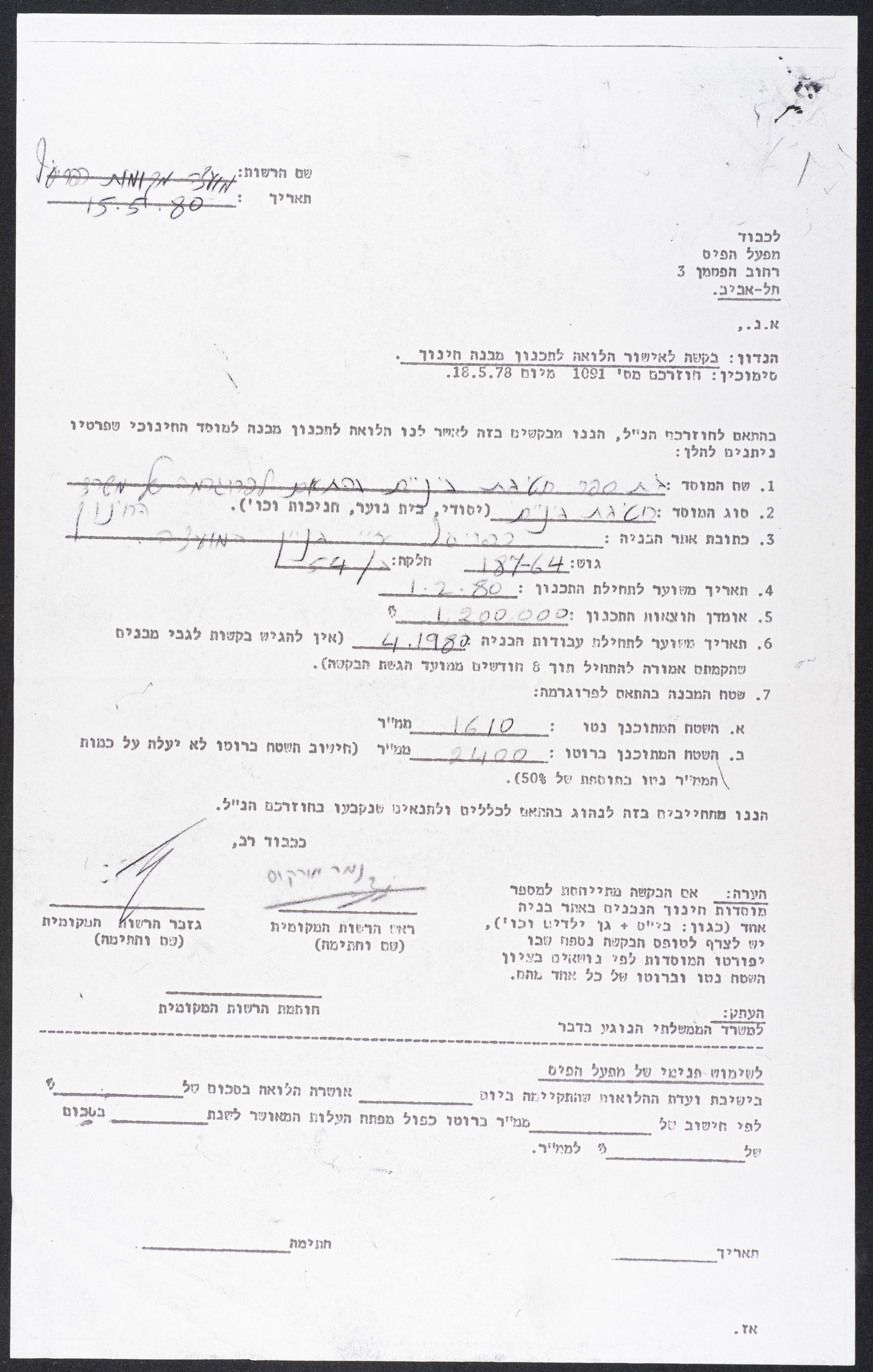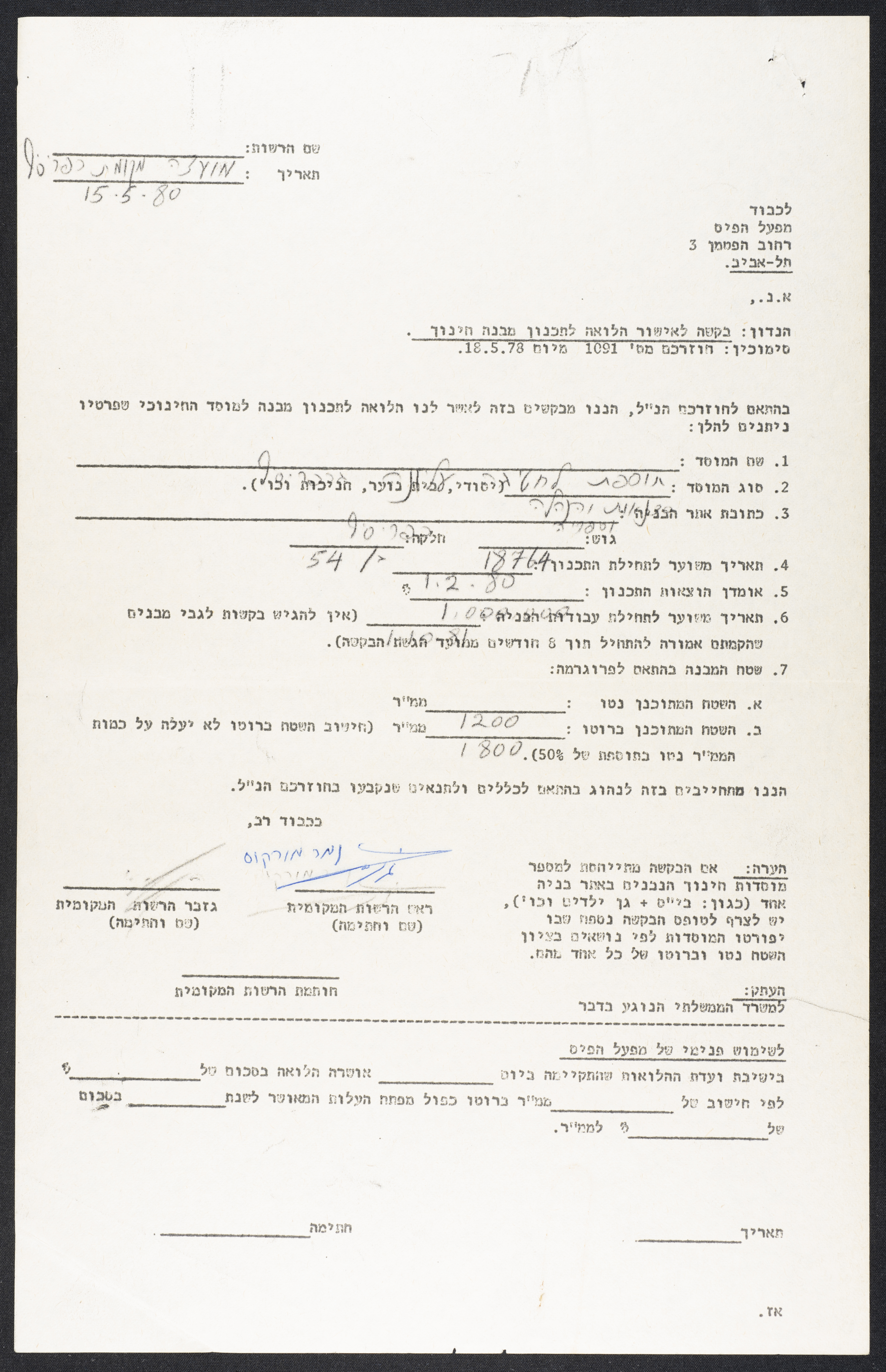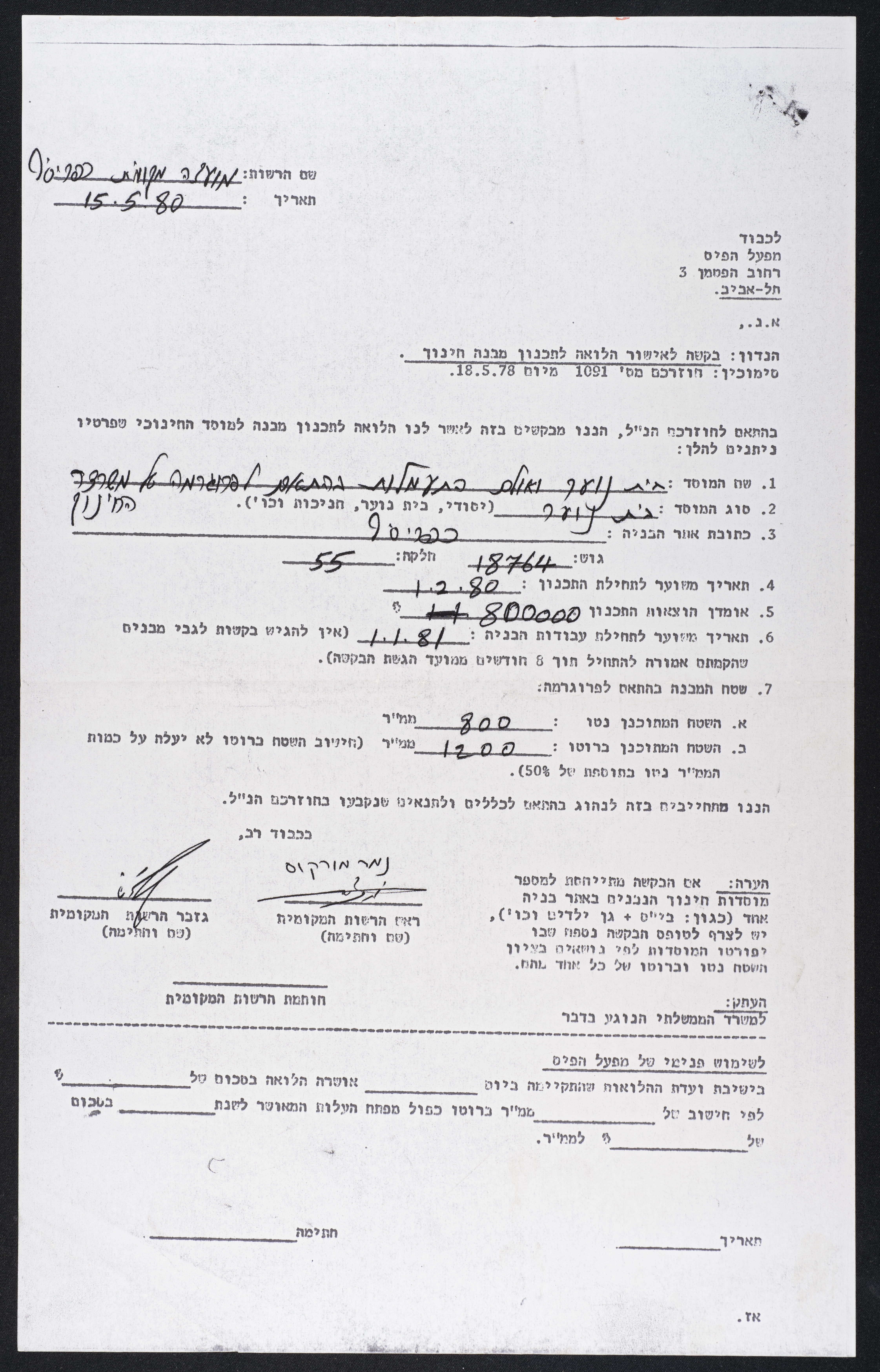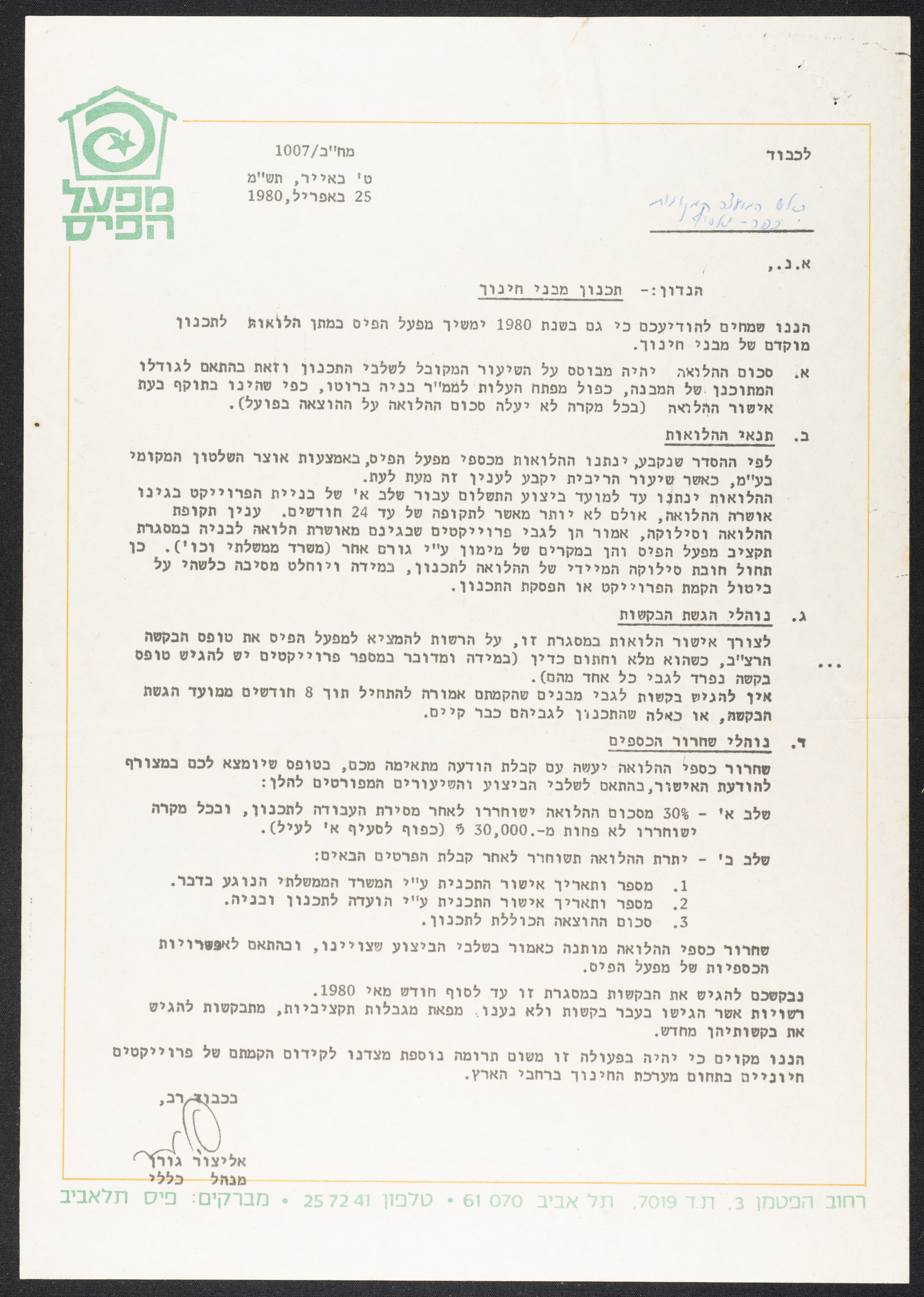 An official application for a financial loan submitted by the Kfar Yasif Local Council on 15 May 1980 to "Mifal HaPais", a lottery company that sometimes provides financial loans within the Community Services Department.