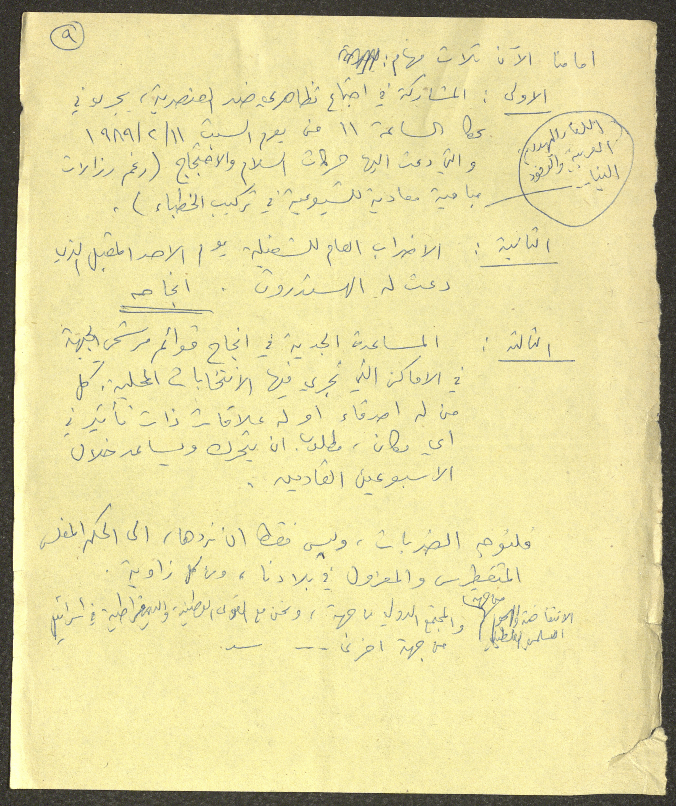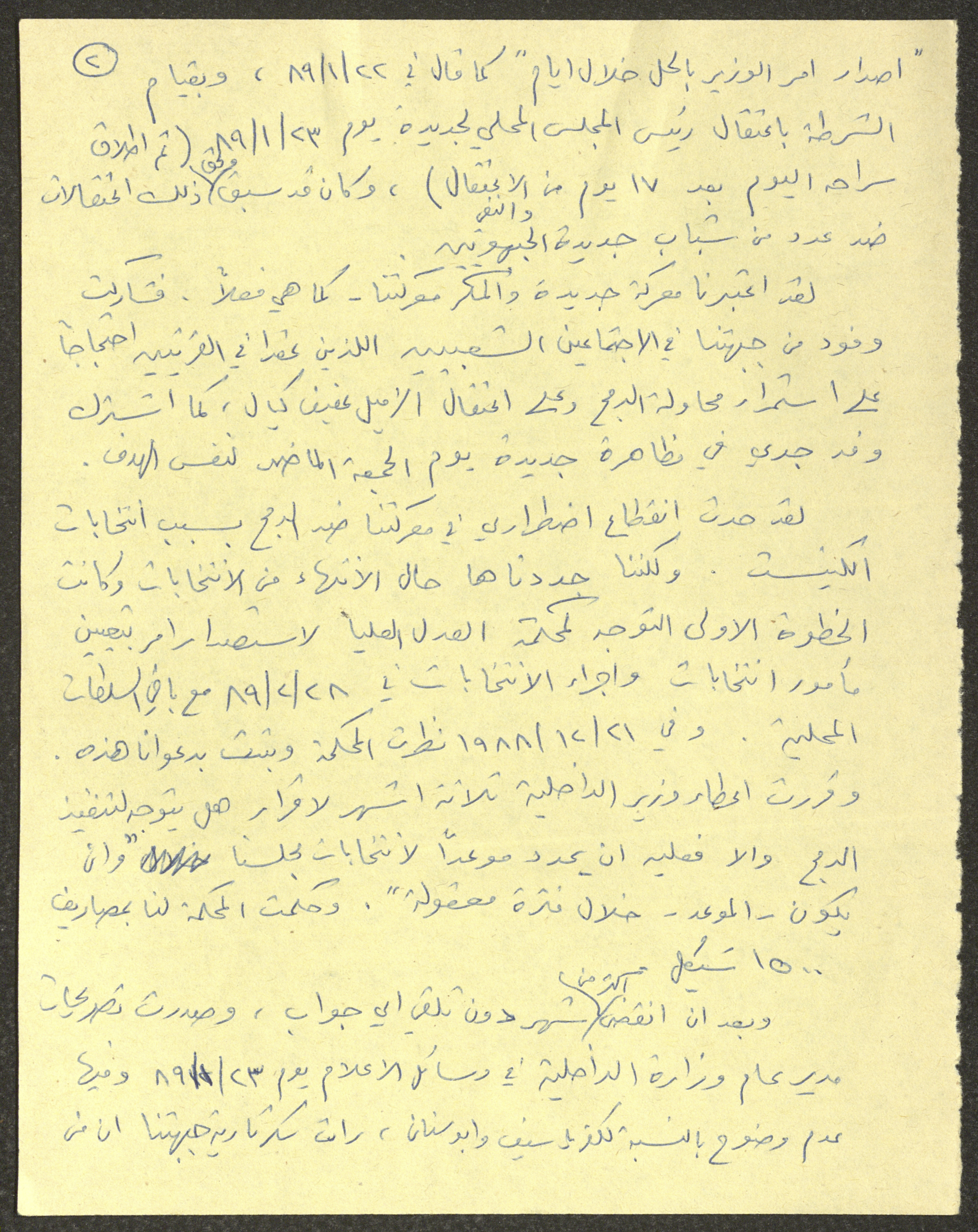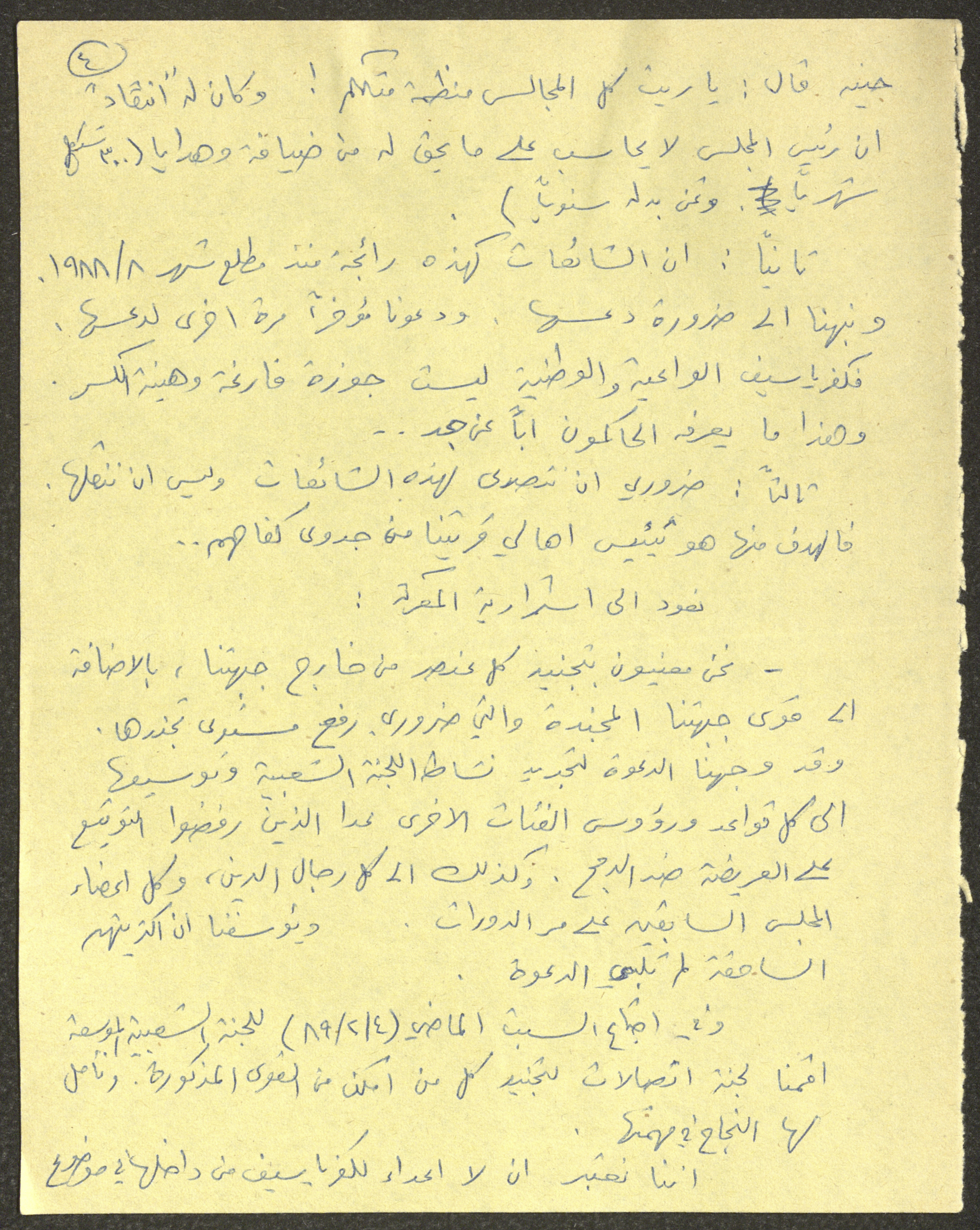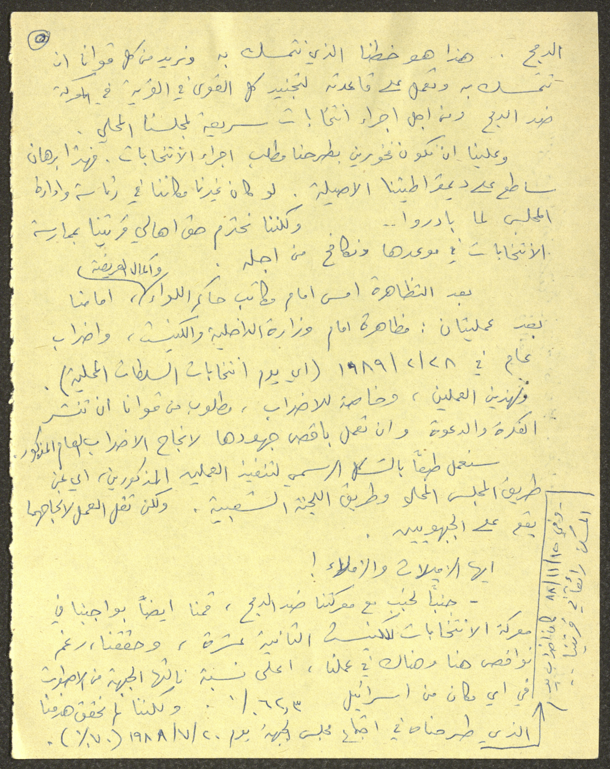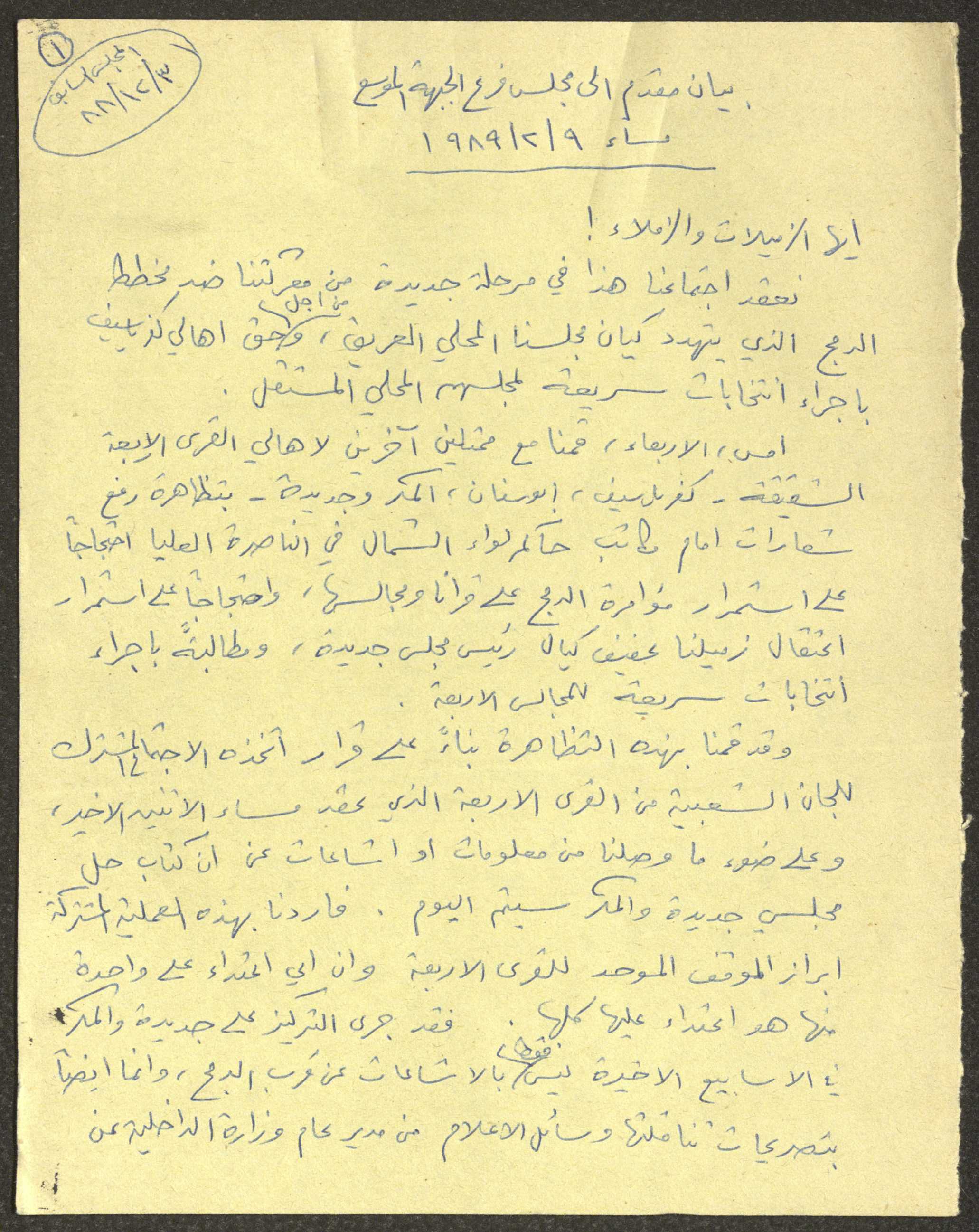 Found in the Nimr Murqus Collection, this document shows a statement submitted to the Council of the Popular Front branch in Kafr Yasif on 9 February 1989.