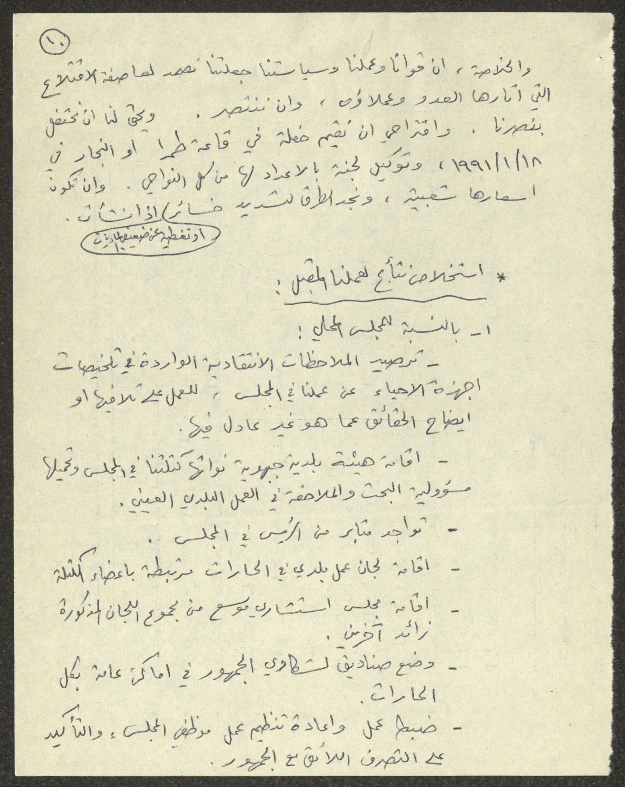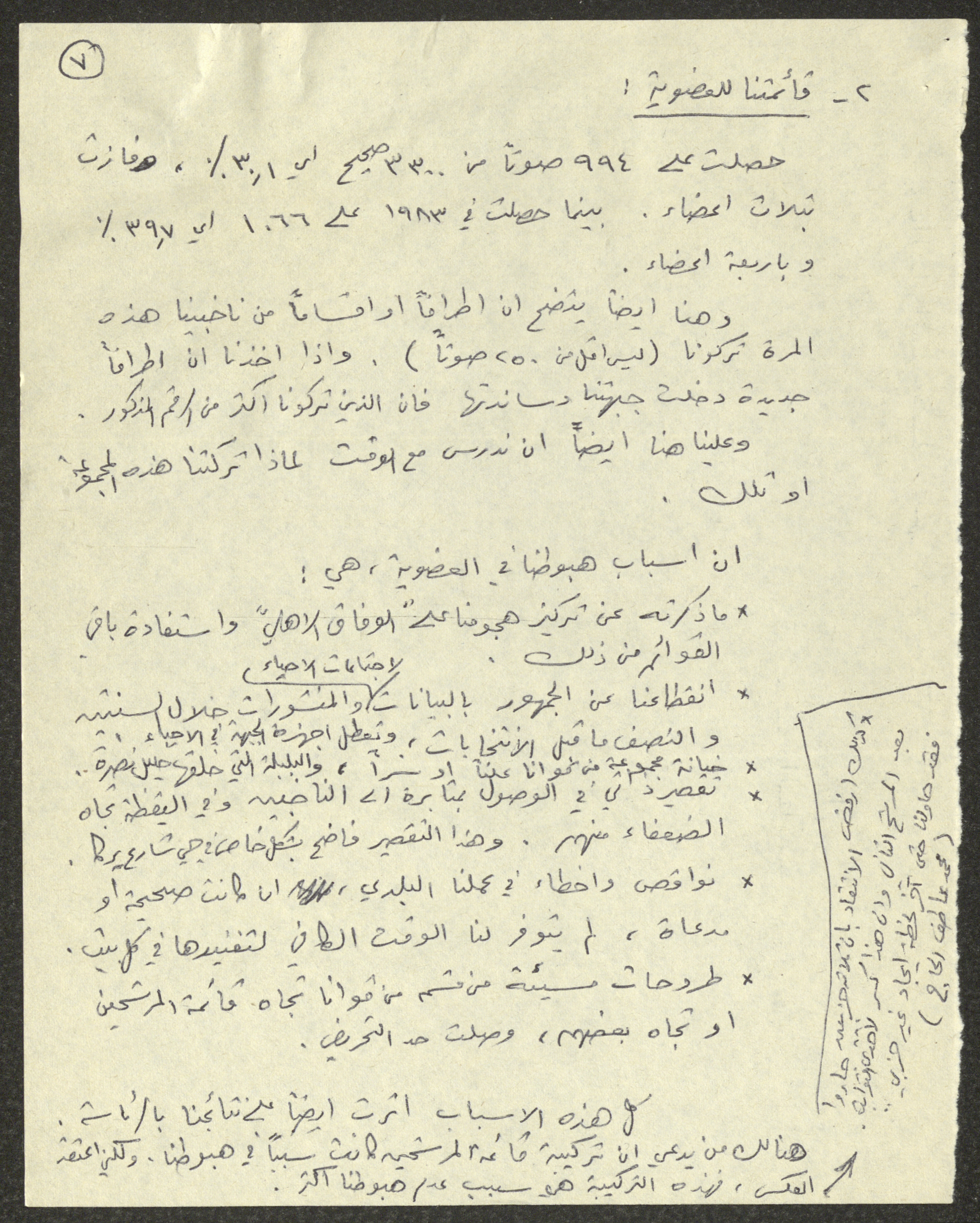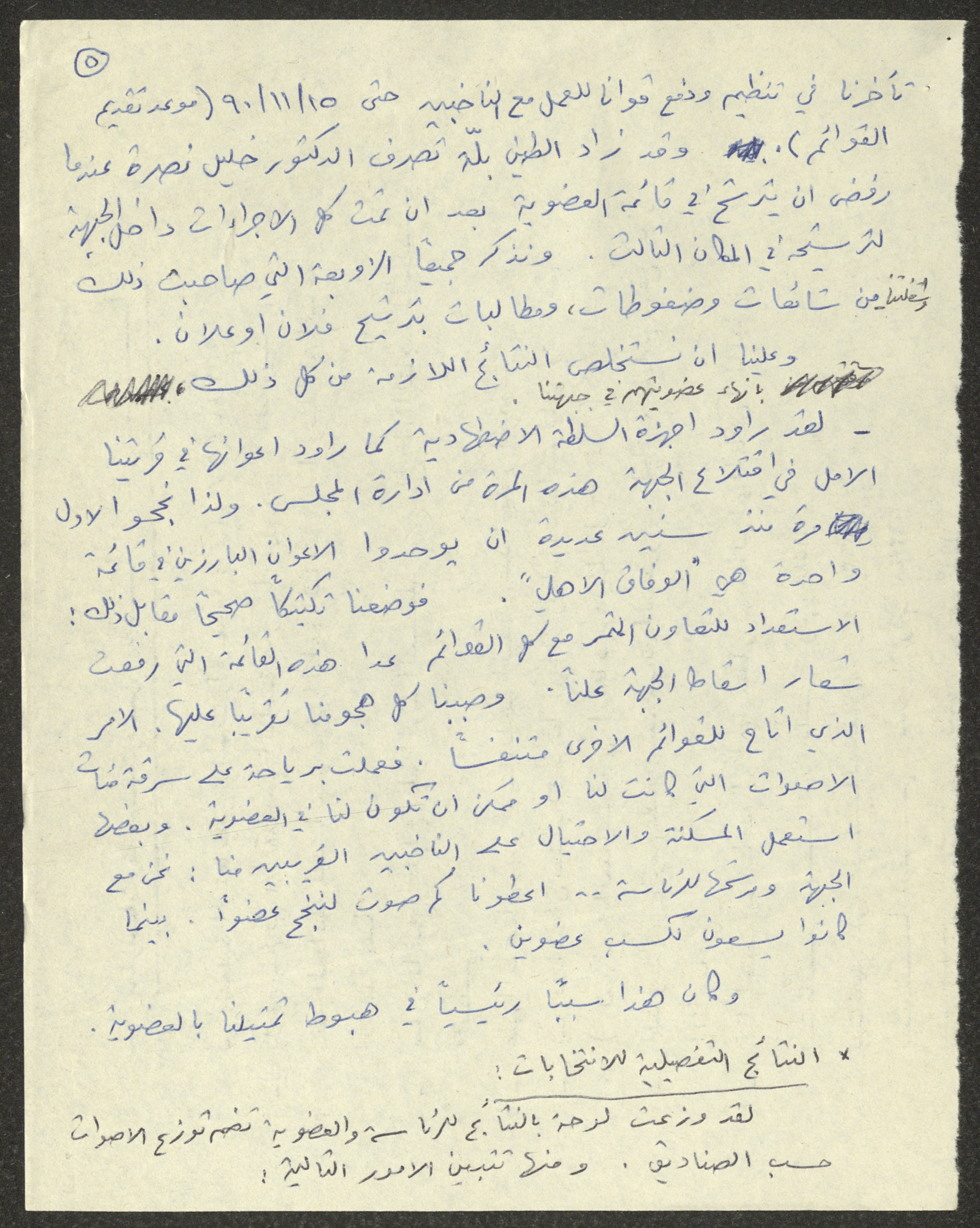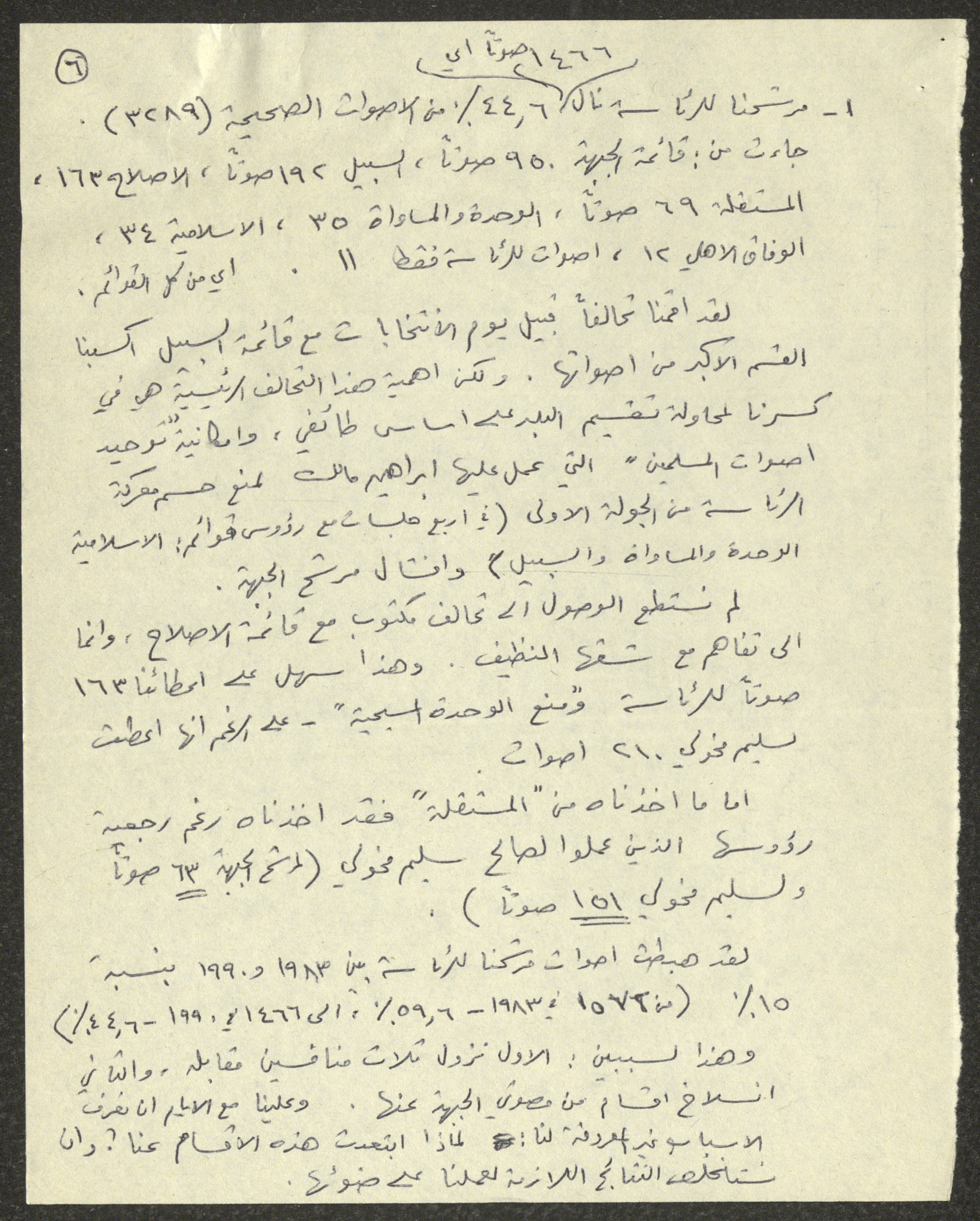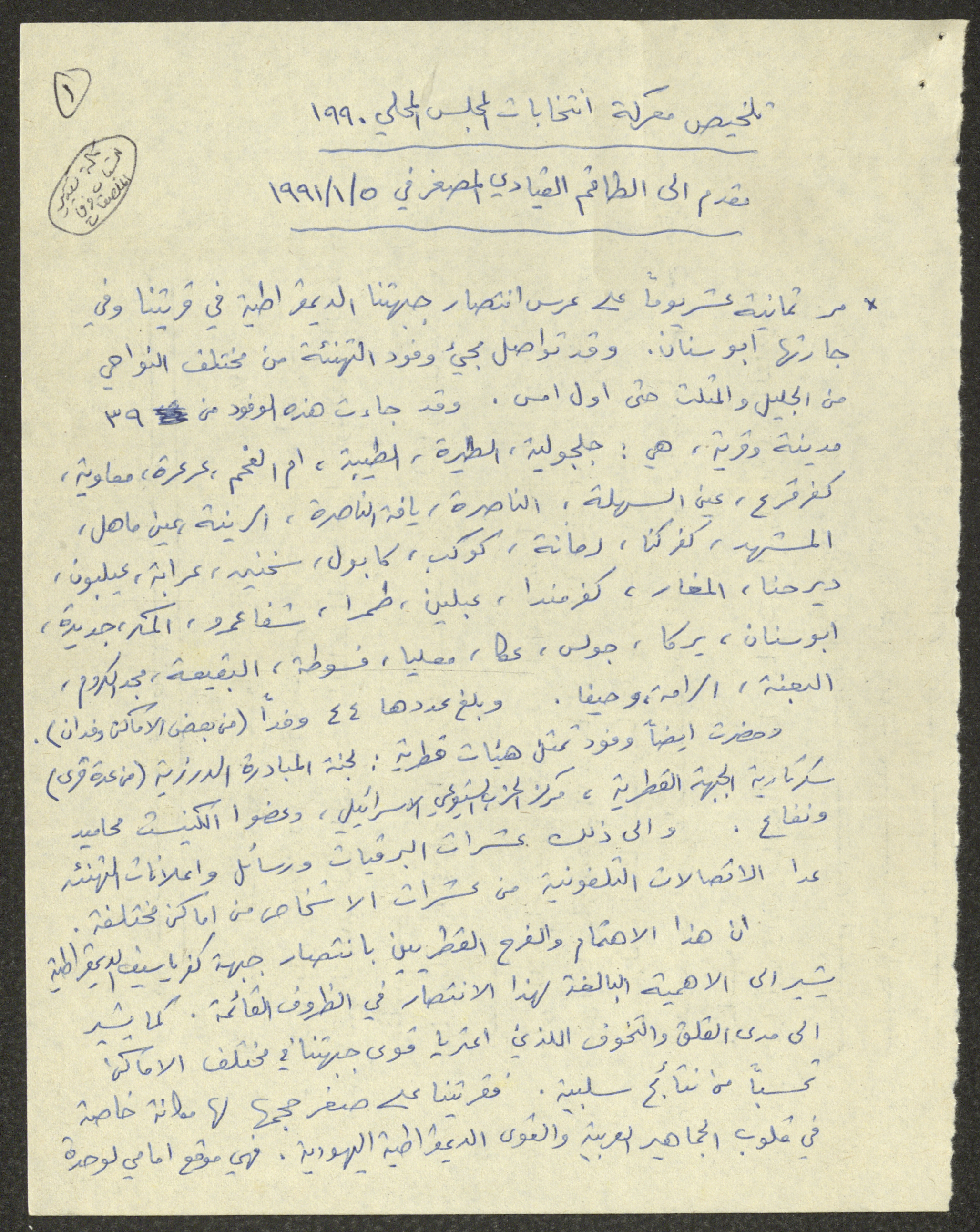 Found in the Nimr Murqus Collection, this document shows a summary of the 1990 local council elections in the village of Abu Snan in Galilee, which was written on 5 January 1991.