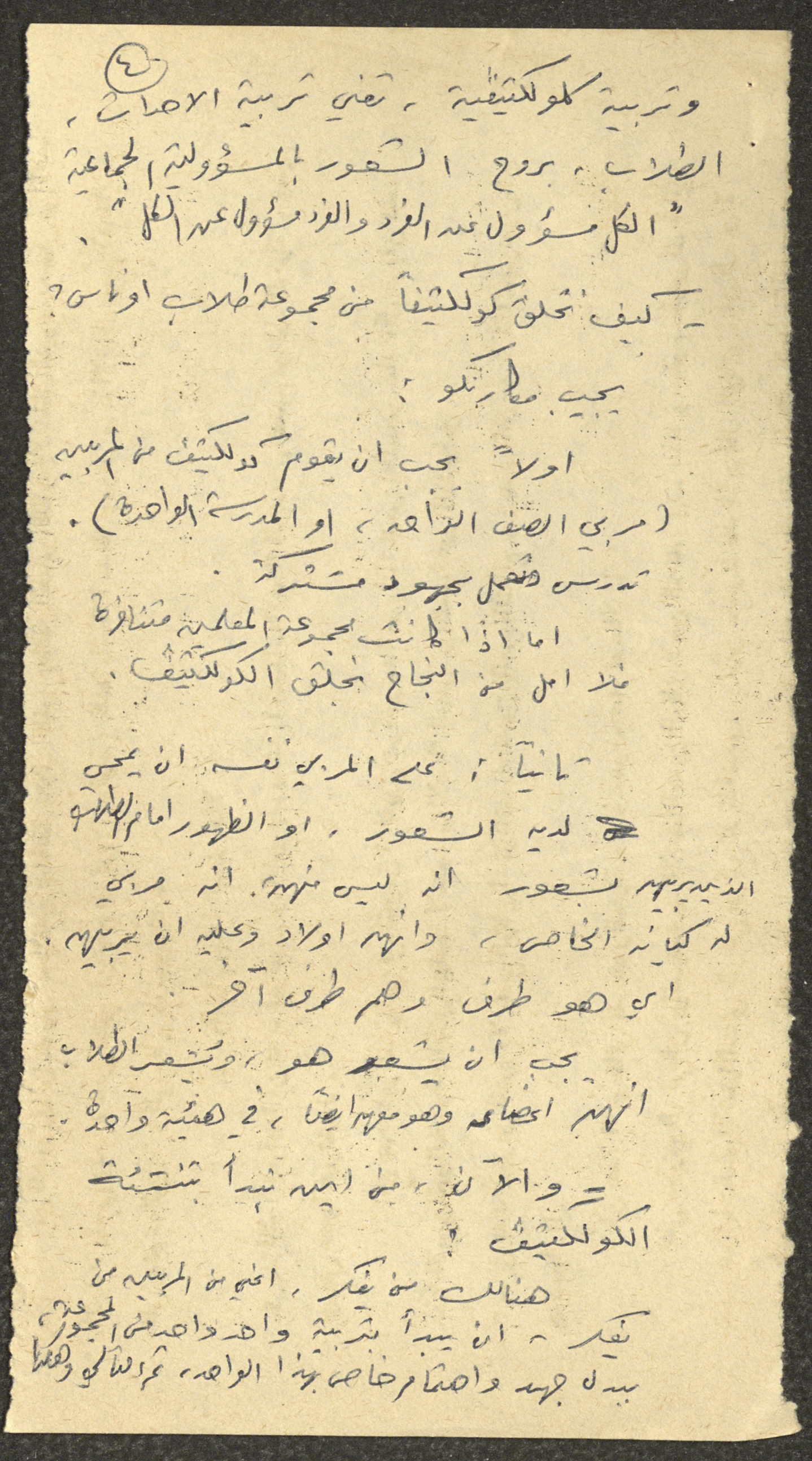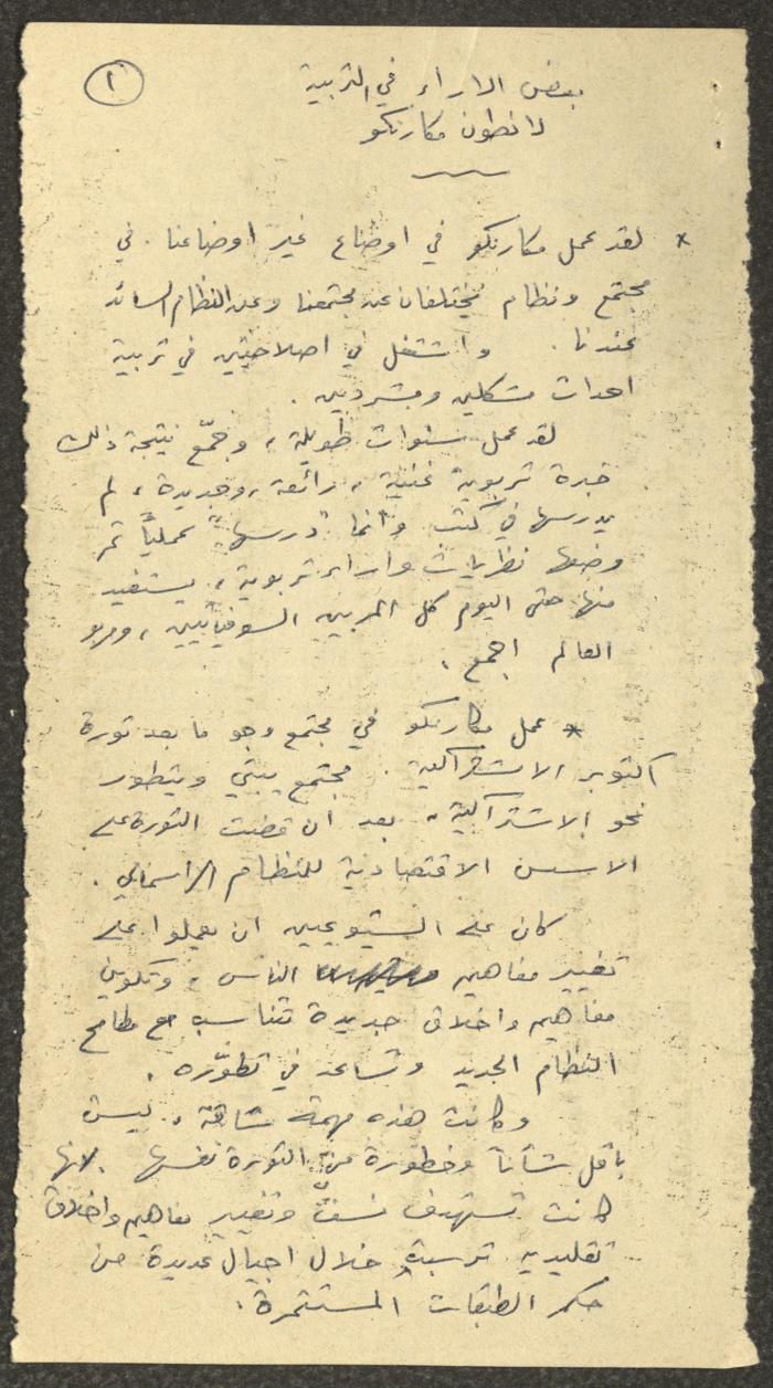 نص محاضرة لنمر مرقس بعنوان "بعض الآراء في التربية لأنطون مكارنكو".;This document shows a lecture text by Nimr Murqus titled "Some Opinions on Education by Anton Makarenko".