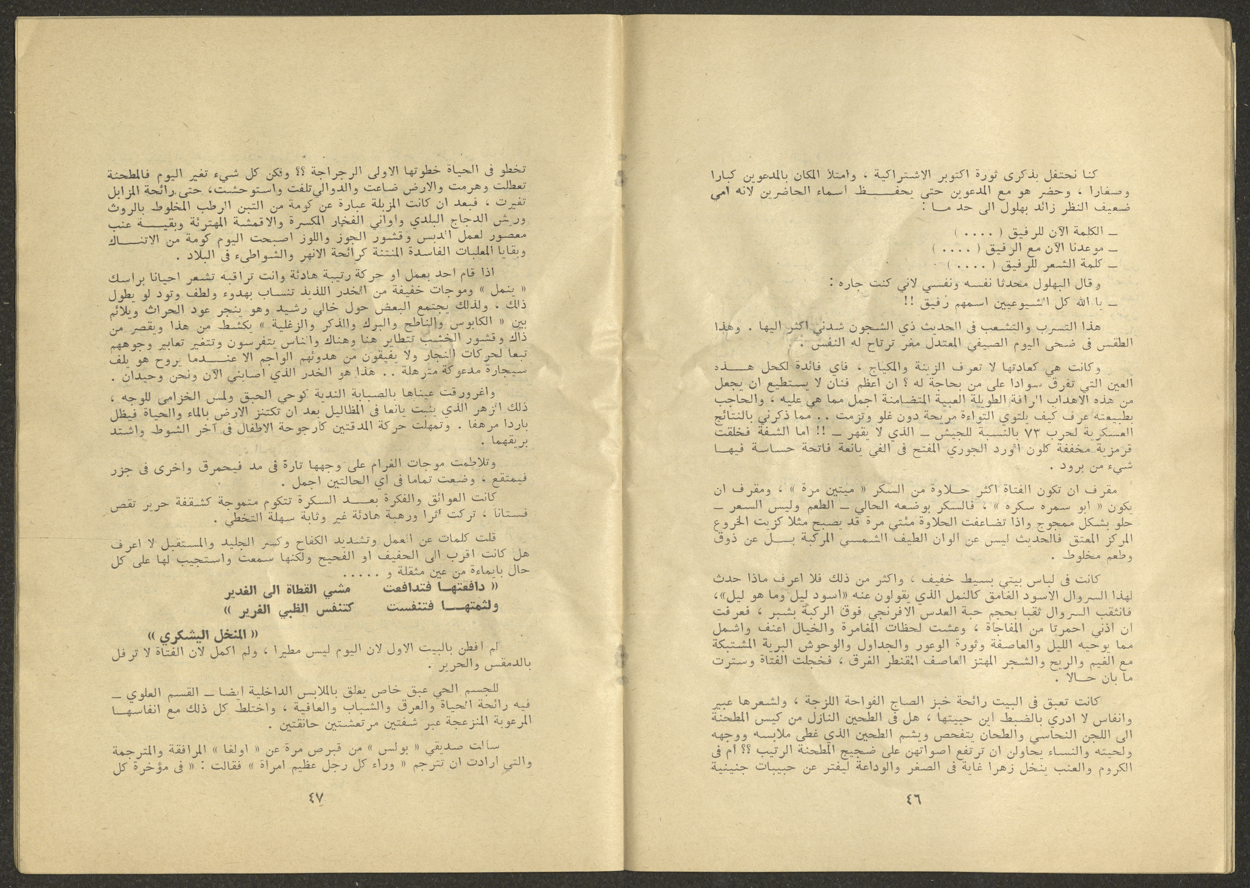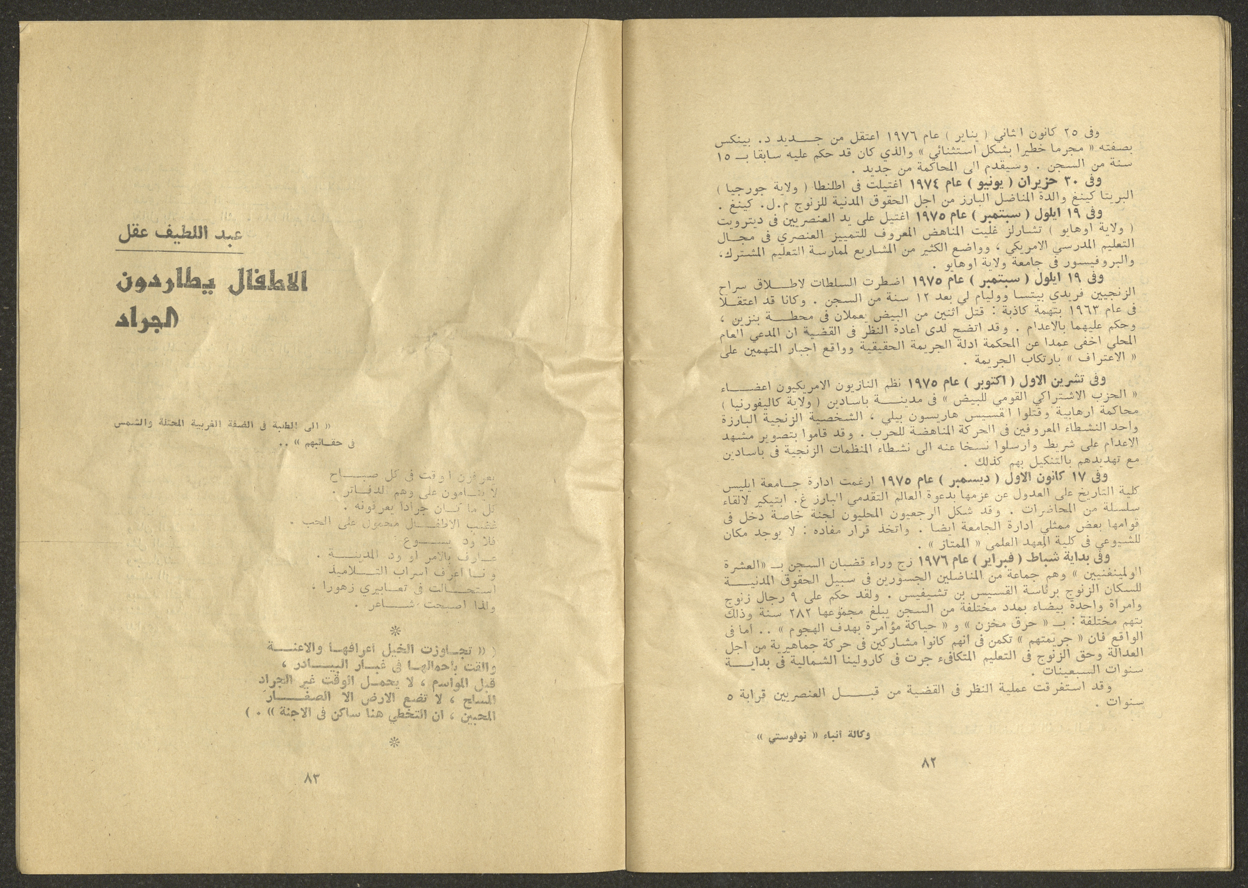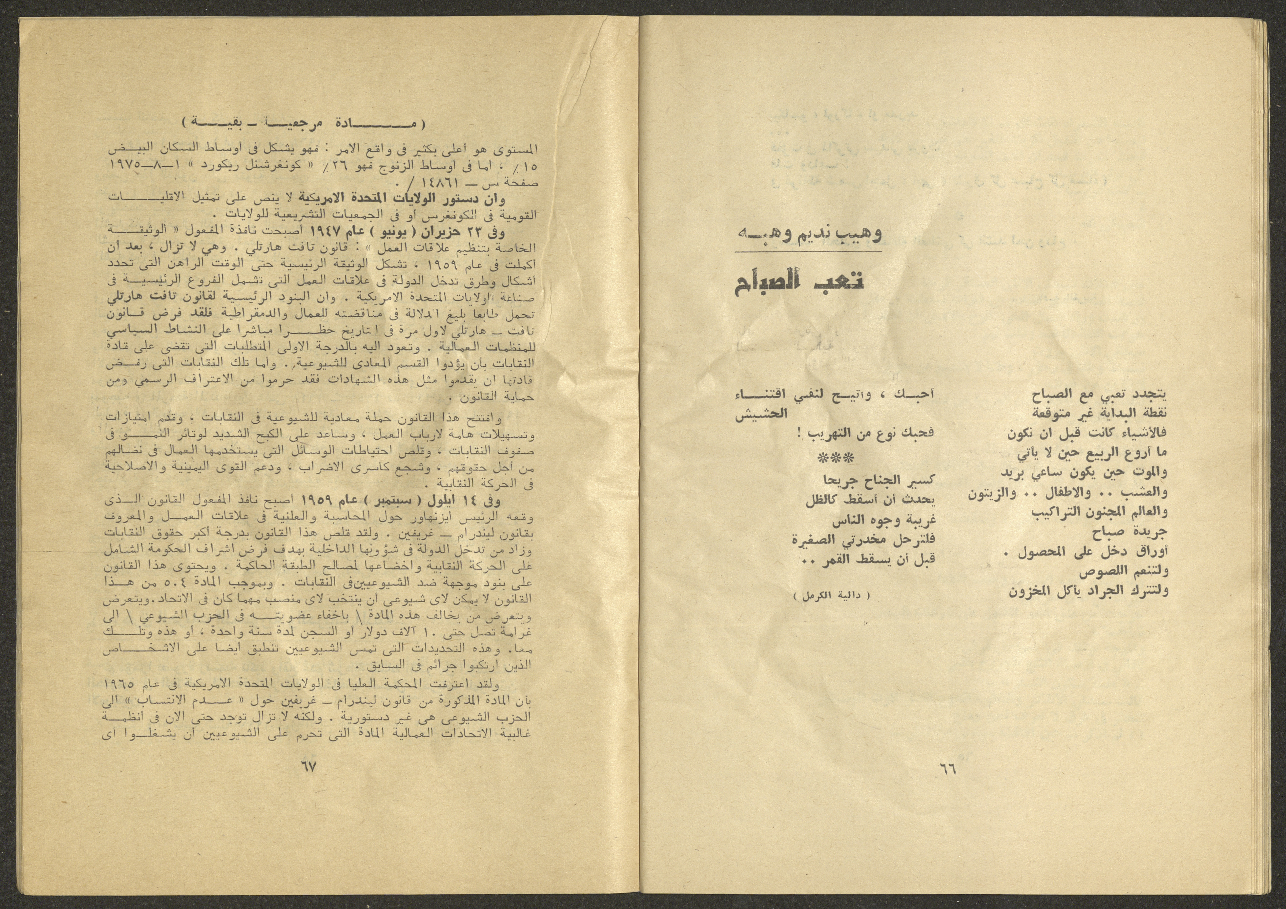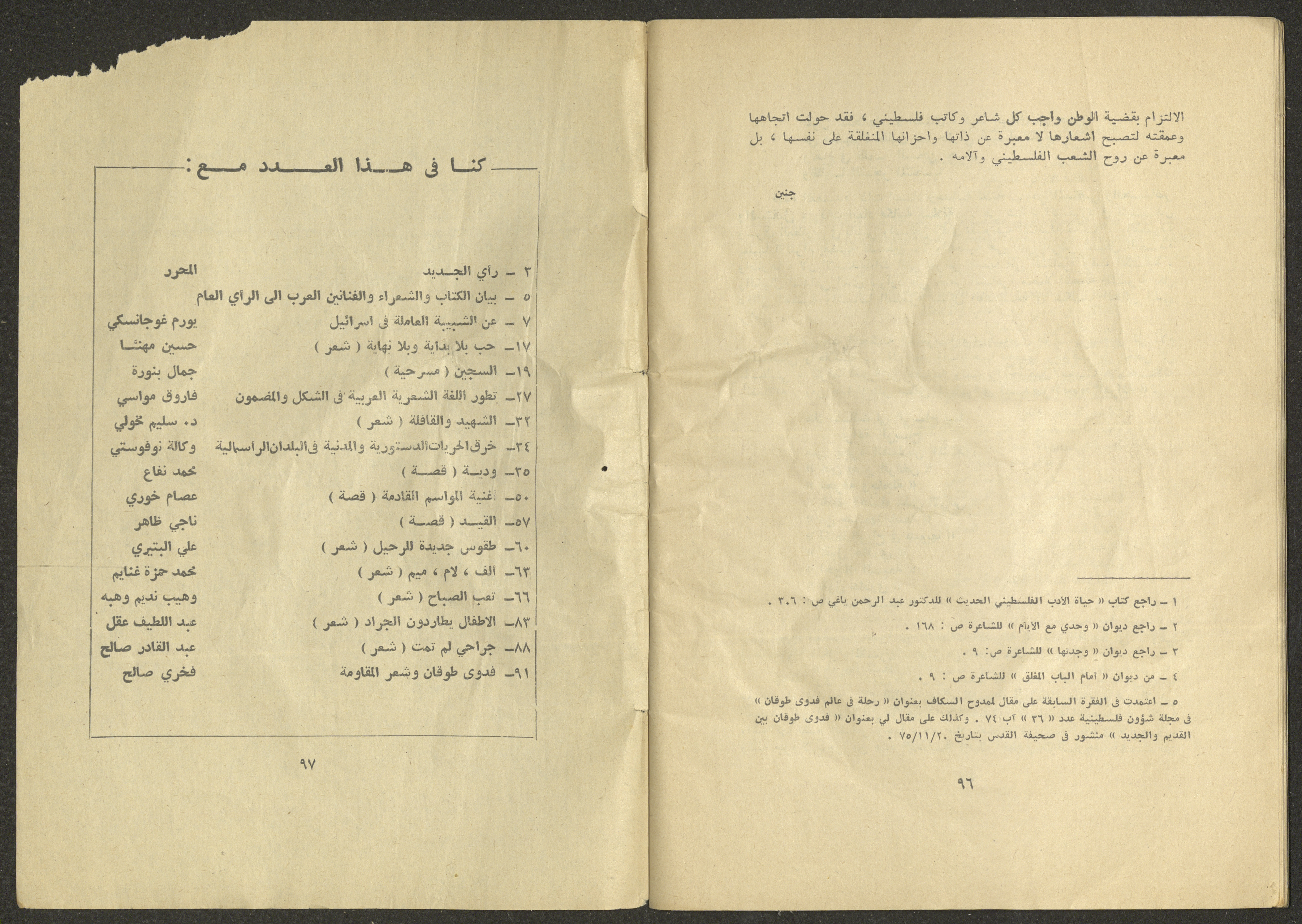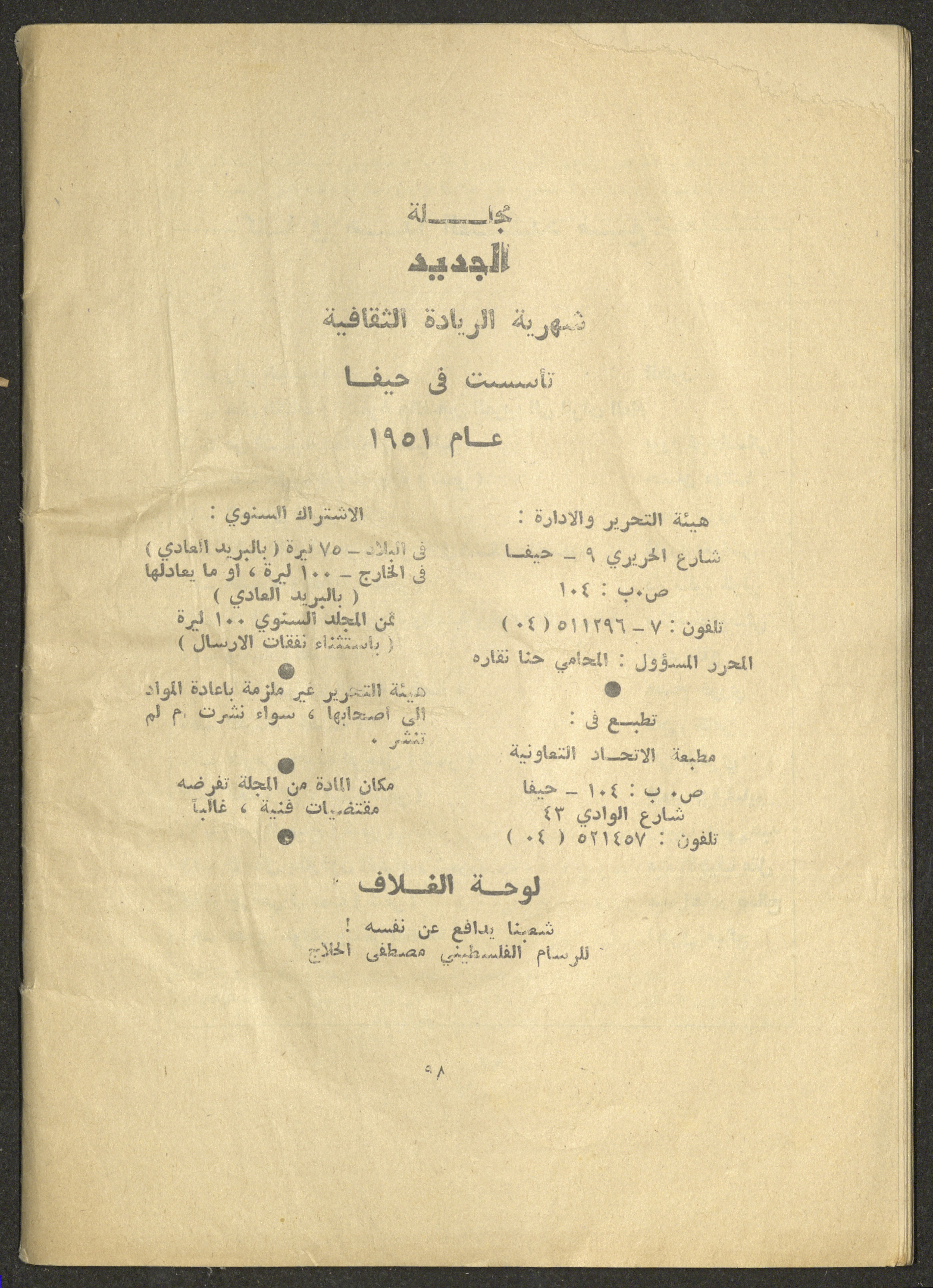 Printed at al-Ittihad Cooperative Press in Haifa, this issue is of al-Jadeed Magazine, which is a monthly magazine of progressive national thought and culture, established in 1851 and its first editor was Hanna Naqqara, while its editor-in-chief was Antoine Shalhat. The issue included the following: 1. The opinion of al-Jadeed by the editor. 2. Statement of Arab writers, poets and artists to public opinion. 3. “On the Youth Working in Israel,” by Yoram Gujansky. 4. “Hub Bela Bedaya Wa Bela Nehaya (Love Without Beginning Nor End)” a poem by Hussein Muhanna. 5. The play "The Prisoner" by Jamal Bannoura. 6. "The Evolution of the Arabic Poetic Language in Form and Content" by Farouk Mwasi. 7. A poem titled "Qabl Kharab al-Basra (Before the Destruction of Basra)" by Nayef Salim. 8. The issue's symposium titled "The Story (of My Village) by Abdel-Hakim Qasem" by Farouk Mwasi. 9. "Ash-Shaheed Wal Qafela (The Shaheed and the Convoy)" a poem by Salim Mwasi. 10. Violation of constitutional and civil liberties in capitalist countries, by Novosti Agency. 11. A "Friendly" story by Muhammad Nafaa. 12. The story "Song of the Next Seasons" by Issam Khoury. 13. The story of "The Chains" by Naji Thahir. 14. “A New Ritual of Departure” poem by Ali al-Battiri. 15. "Alef, Lam, Meem" is a poem by Muhammad Hamzeh Ghanyem. 16. "Taab as-Sabah (The Fatigue of the Morning" poem by Wahib Nadim Wahba. 17. "Al-Atfal Yotaredoon al-Jarad (Children Chasing Locusts)" a poem by Abdel Latif Akl. 18. "Jerahi Lam Tamot (My Wounds Are not Dead)" poem by Abdel-Qadir Saleh. 19. Fadwa Toukan and the poetry of resistance by Fakhri Saleh.