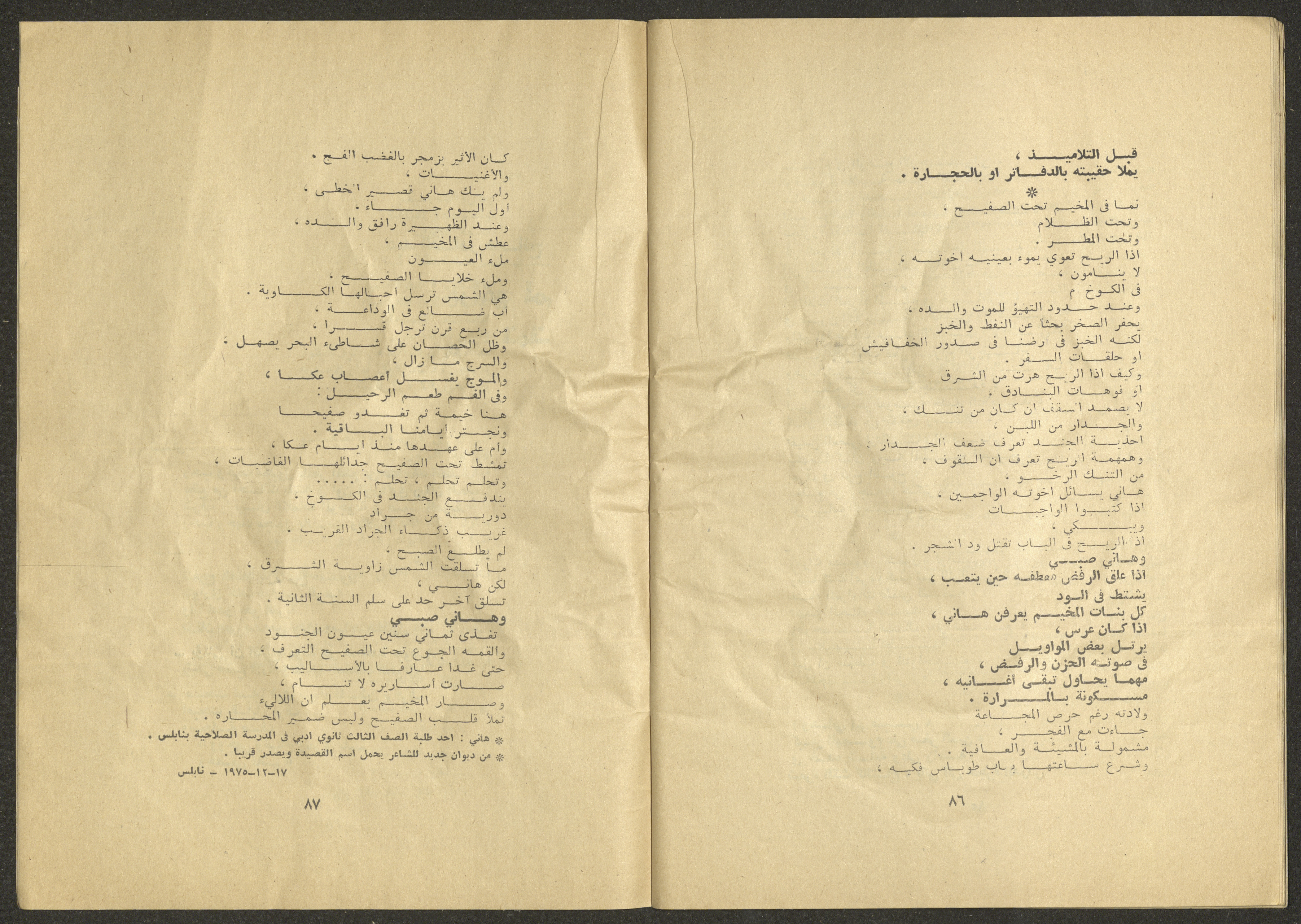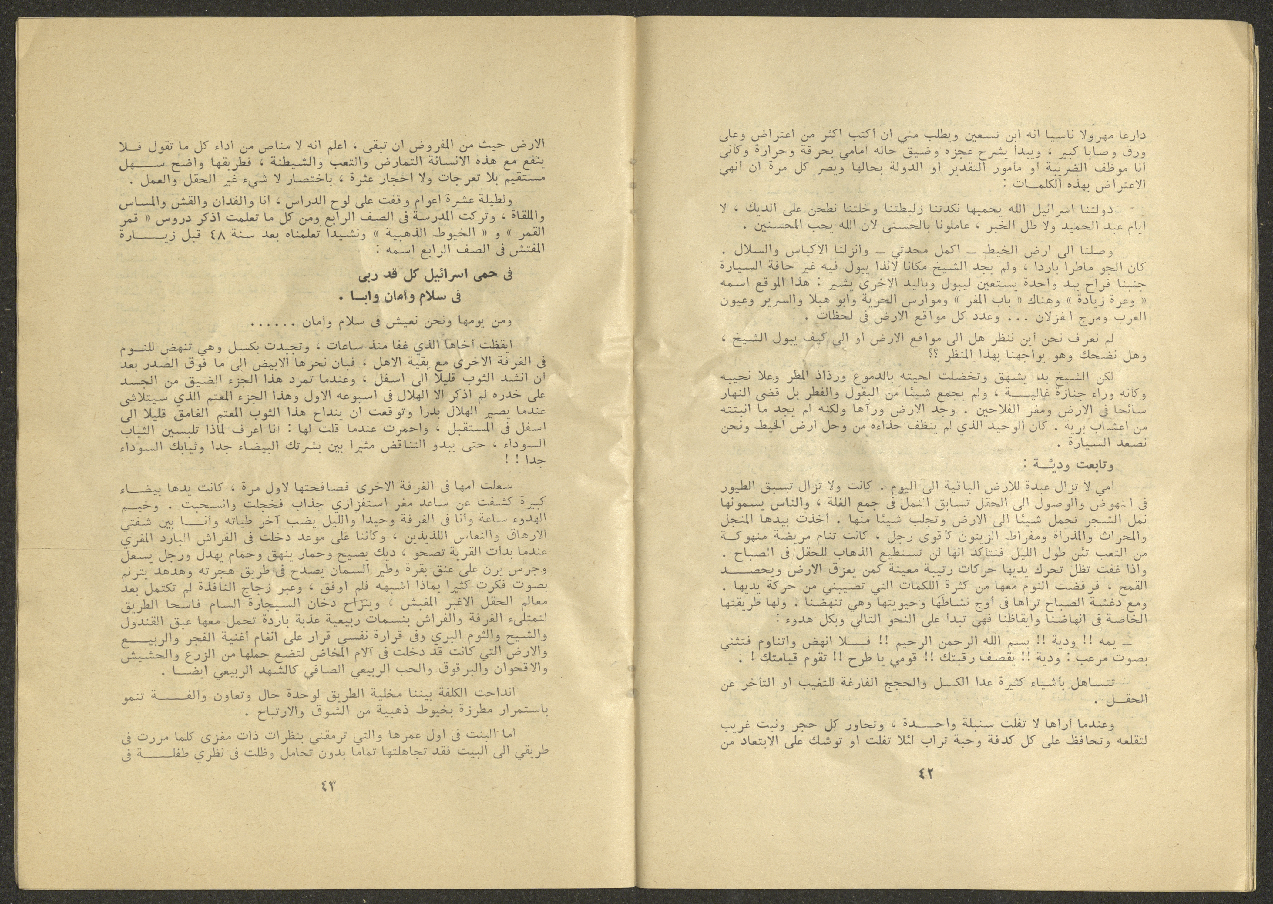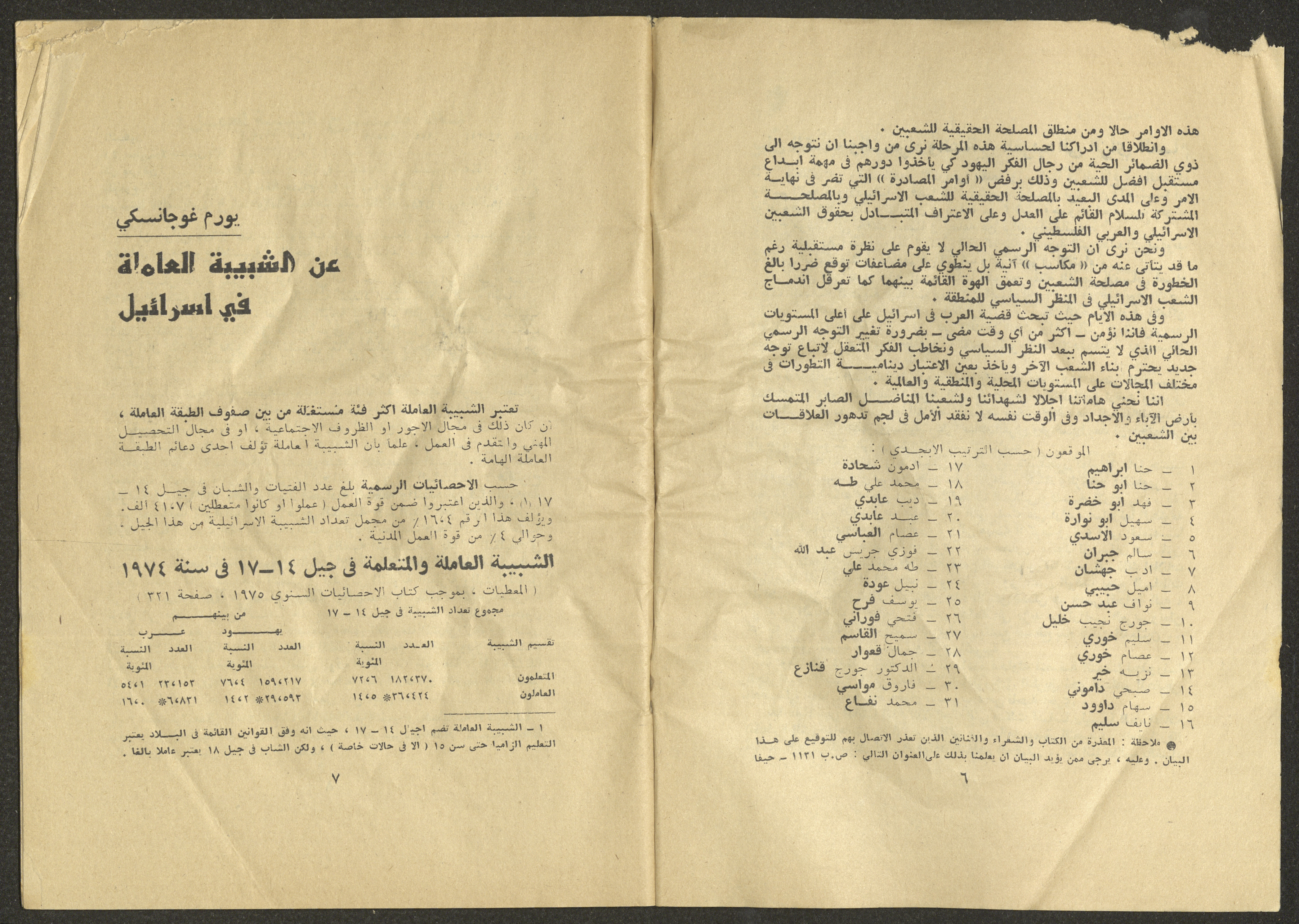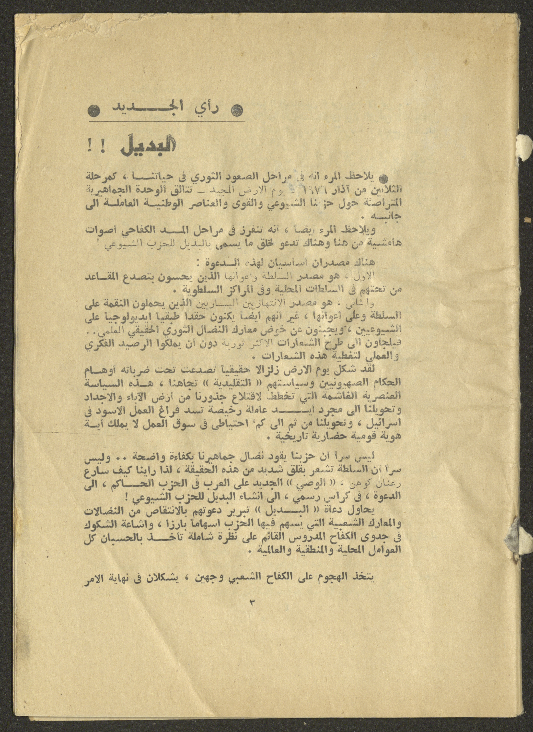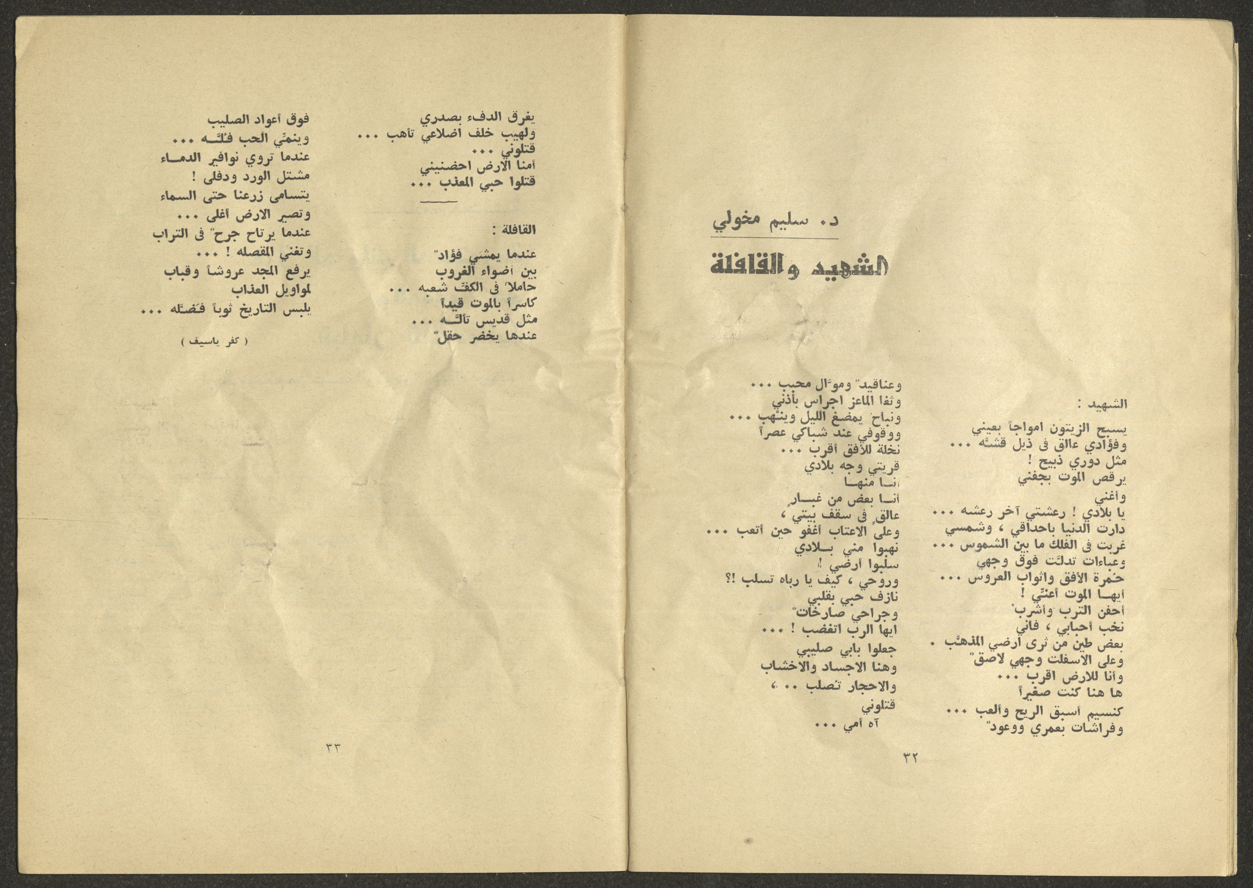 Printed at al-Ittihad Cooperative Press in Haifa, this issue is of al-Jadeed Magazine, which is a monthly magazine of progressive national thought and culture, established in 1851 and its first editor was Hanna Naqqara, while its editor-in-chief was Antoine Shalhat. The issue included the following: 1. The opinion of al-Jadeed by the editor. 2. Statement of Arab writers, poets and artists to public opinion. 3. “On the Youth Working in Israel,” by Yoram Gujansky. 4. “Hub Bela Bedaya Wa Bela Nehaya (Love Without Beginning Nor End)” a poem by Hussein Muhanna. 5. The play "The Prisoner" by Jamal Bannoura. 6. "The Evolution of the Arabic Poetic Language in Form and Content" by Farouk Mwasi. 7. A poem titled "Qabl Kharab al-Basra (Before the Destruction of Basra)" by Nayef Salim. 8. The issue's symposium titled "The Story (of My Village) by Abdel-Hakim Qasem" by Farouk Mwasi. 9. "Ash-Shaheed Wal Qafela (The Shaheed and the Convoy)" a poem by Salim Mwasi. 10. Violation of constitutional and civil liberties in capitalist countries, by Novosti Agency. 11. A "Friendly" story by Muhammad Nafaa. 12. The story "Song of the Next Seasons" by Issam Khoury. 13. The story of "The Chains" by Naji Thahir. 14. “A New Ritual of Departure” poem by Ali al-Battiri. 15. "Alef, Lam, Meem" is a poem by Muhammad Hamzeh Ghanyem. 16. "Taab as-Sabah (The Fatigue of the Morning" poem by Wahib Nadim Wahba. 17. "Al-Atfal Yotaredoon al-Jarad (Children Chasing Locusts)" a poem by Abdel Latif Akl. 18. "Jerahi Lam Tamot (My Wounds Are not Dead)" poem by Abdel-Qadir Saleh. 19. Fadwa Toukan and the poetry of resistance by Fakhri Saleh.