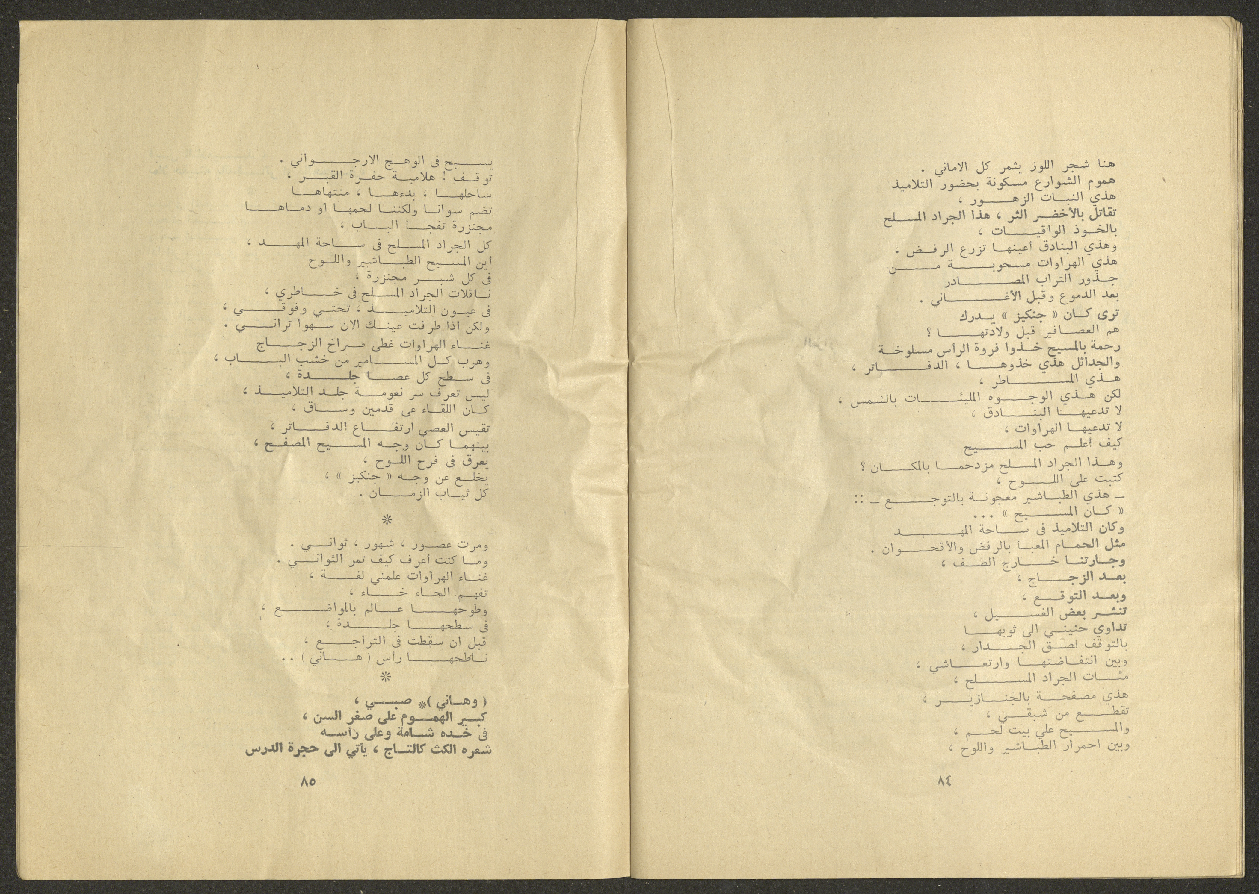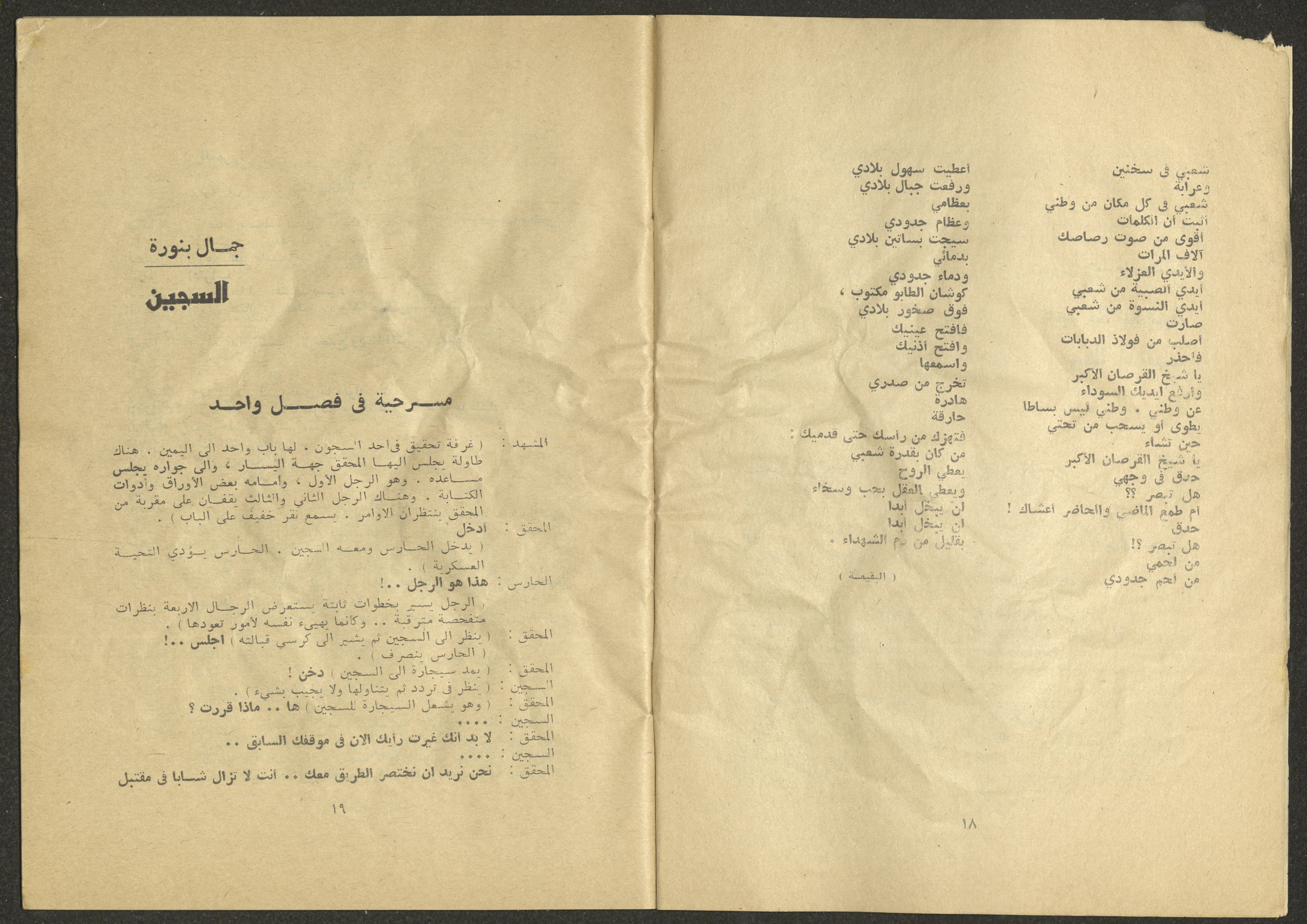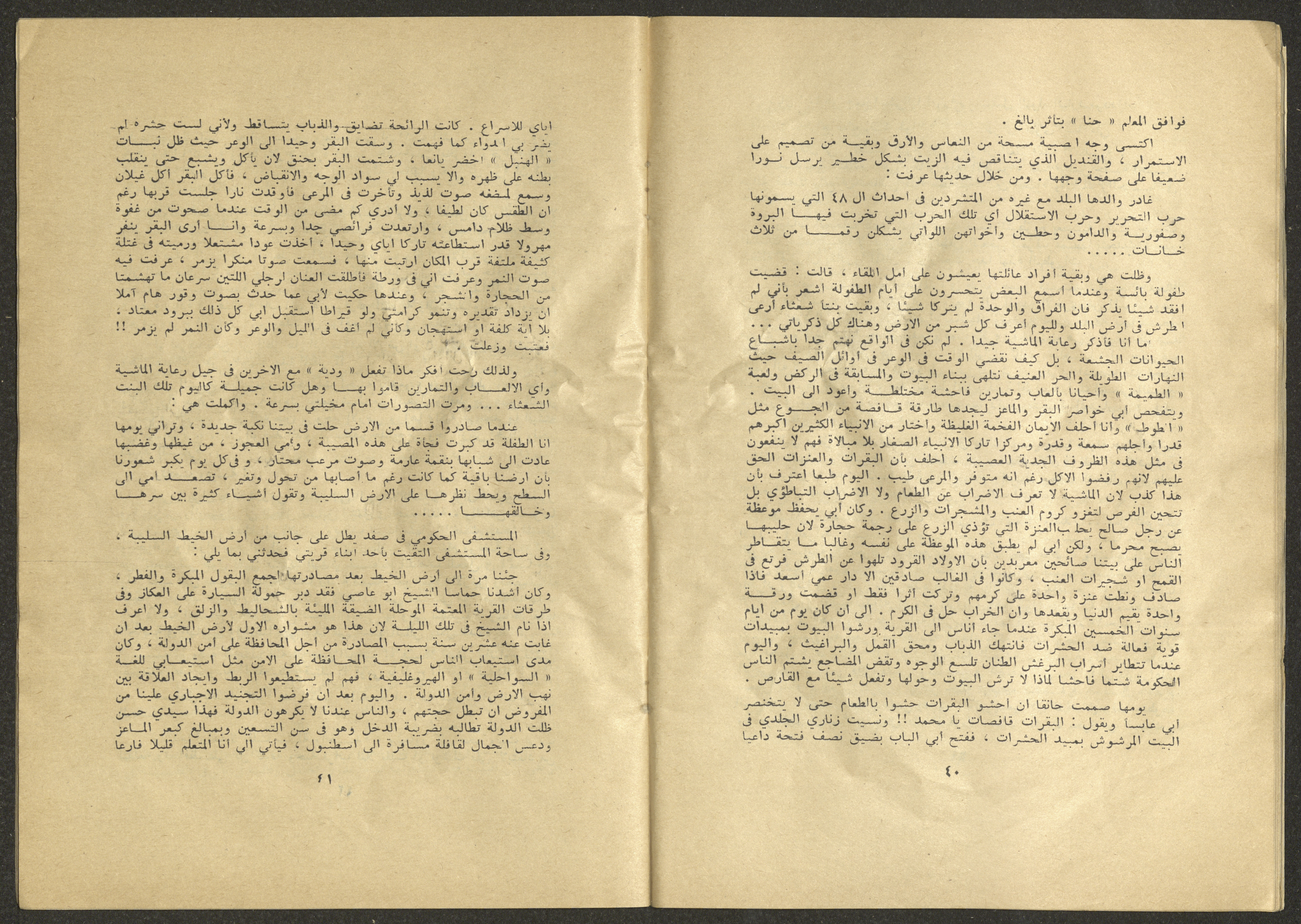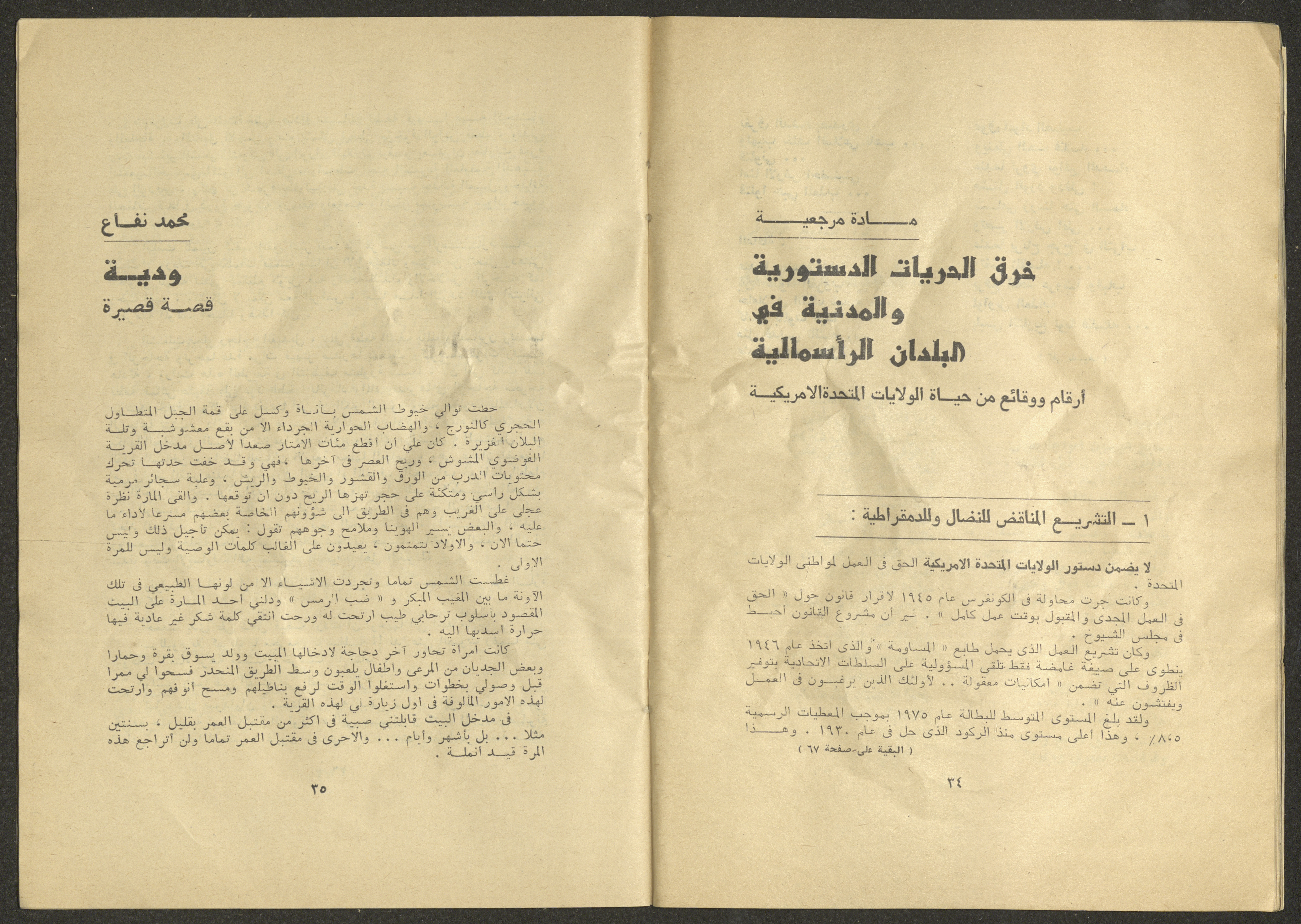Printed at al-Ittihad Cooperative Press in Haifa, this issue is of al-Jadeed Magazine, which is a monthly magazine of progressive national thought and culture, established in 1851 and its first editor was Hanna Naqqara, while its editor-in-chief was Antoine Shalhat. The issue included the following: 1. The opinion of al-Jadeed by the editor. 2. Statement of Arab writers, poets and artists to public opinion. 3. “On the Youth Working in Israel,” by Yoram Gujansky. 4. “Hub Bela Bedaya Wa Bela Nehaya (Love Without Beginning Nor End)” a poem by Hussein Muhanna. 5. The play "The Prisoner" by Jamal Bannoura. 6. "The Evolution of the Arabic Poetic Language in Form and Content" by Farouk Mwasi. 7. A poem titled "Qabl Kharab al-Basra (Before the Destruction of Basra)" by Nayef Salim. 8. The issue's symposium titled "The Story (of My Village) by Abdel-Hakim Qasem" by Farouk Mwasi. 9. "Ash-Shaheed Wal Qafela (The Shaheed and the Convoy)" a poem by Salim Mwasi. 10. Violation of constitutional and civil liberties in capitalist countries, by Novosti Agency. 11. A "Friendly" story by Muhammad Nafaa. 12. The story "Song of the Next Seasons" by Issam Khoury. 13. The story of "The Chains" by Naji Thahir. 14. “A New Ritual of Departure” poem by Ali al-Battiri. 15. "Alef, Lam, Meem" is a poem by Muhammad Hamzeh Ghanyem. 16. "Taab as-Sabah (The Fatigue of the Morning" poem by Wahib Nadim Wahba. 17. "Al-Atfal Yotaredoon al-Jarad (Children Chasing Locusts)" a poem by Abdel Latif Akl. 18. "Jerahi Lam Tamot (My Wounds Are not Dead)" poem by Abdel-Qadir Saleh. 19. Fadwa Toukan and the poetry of resistance by Fakhri Saleh.