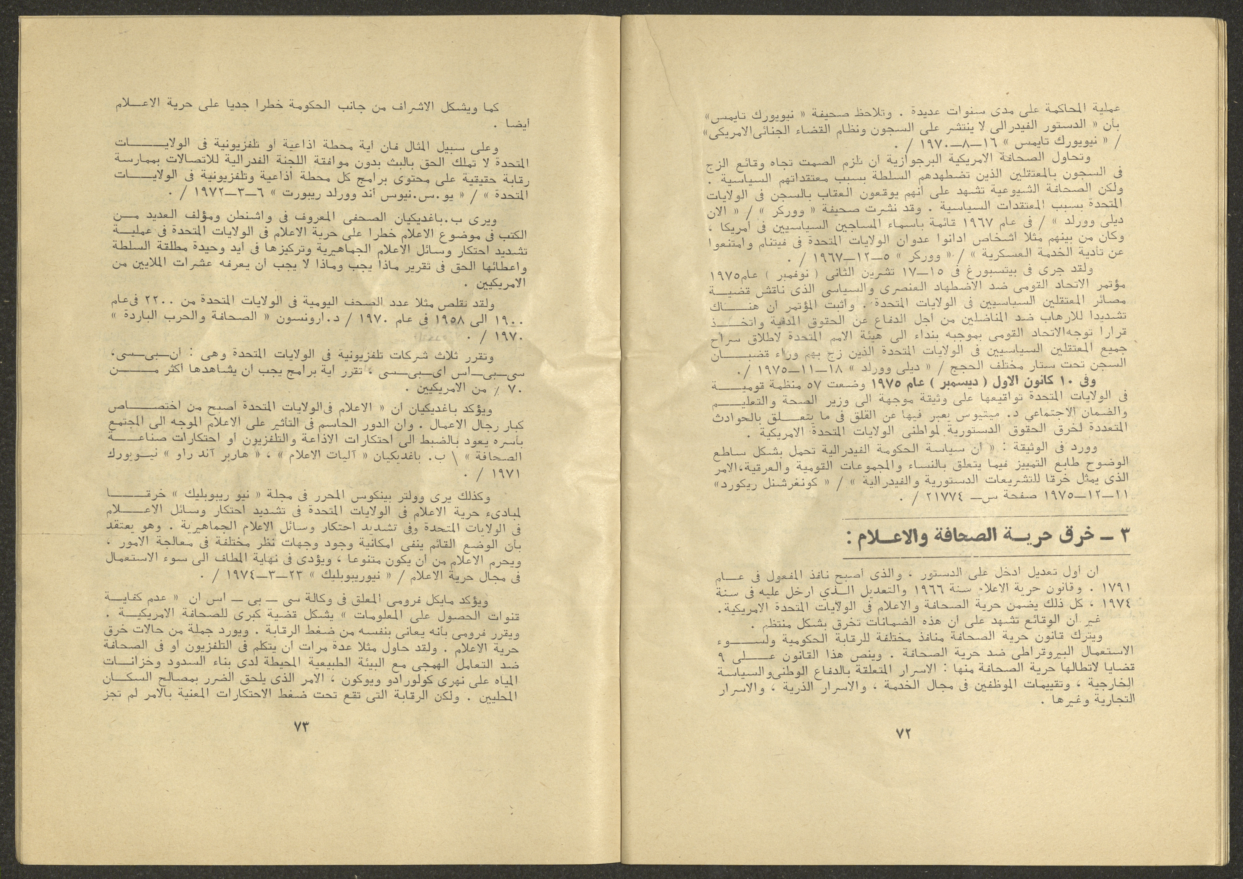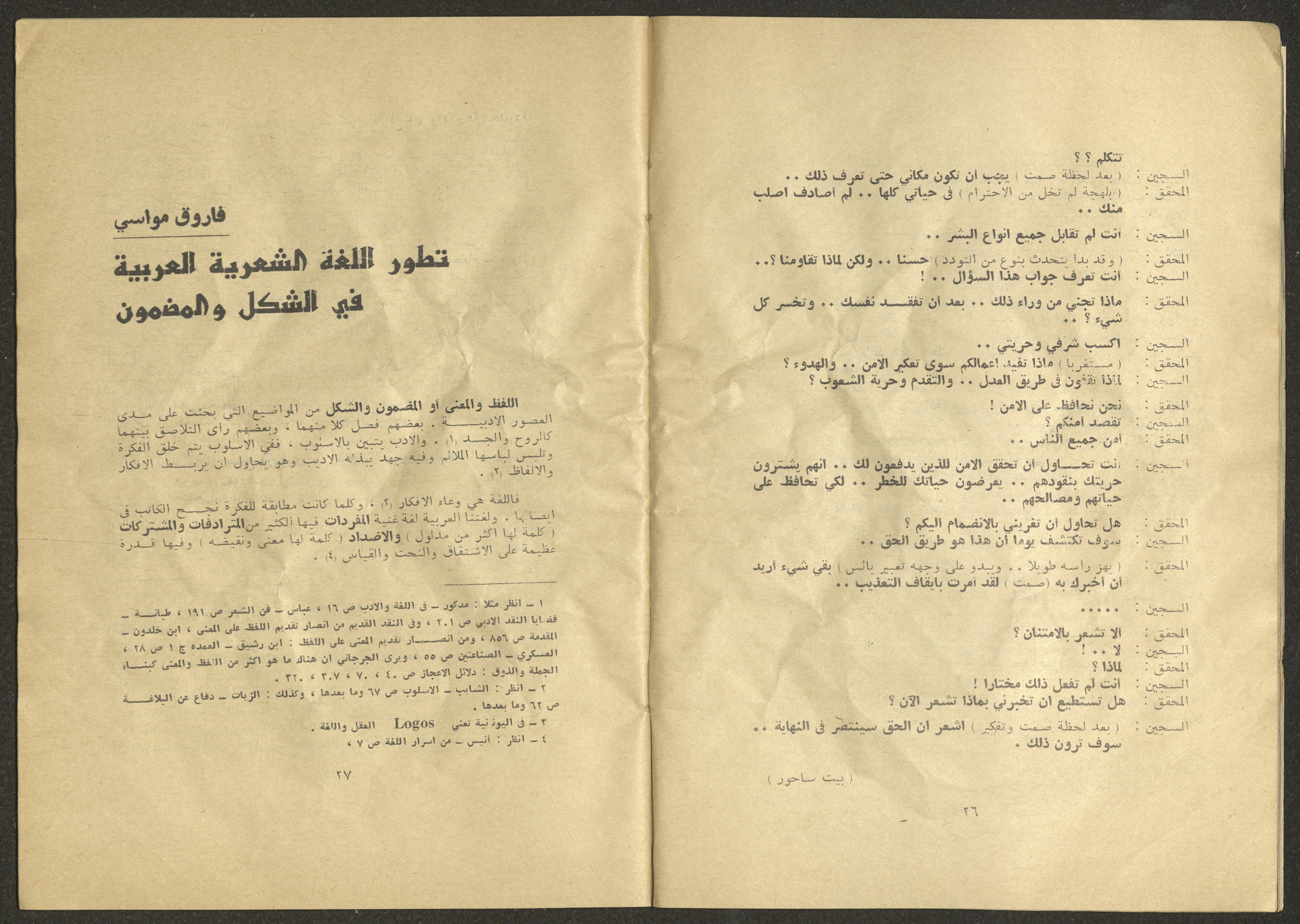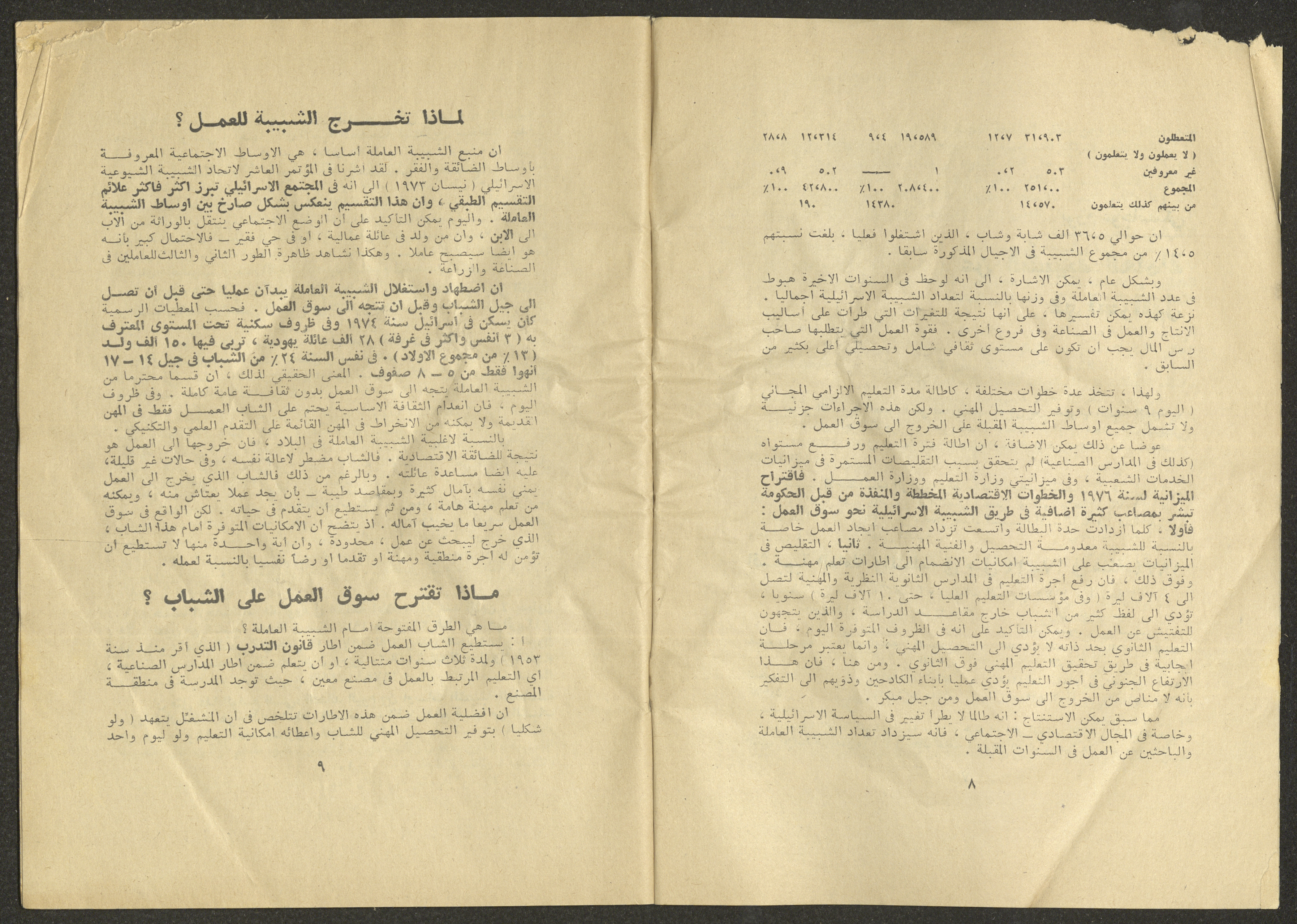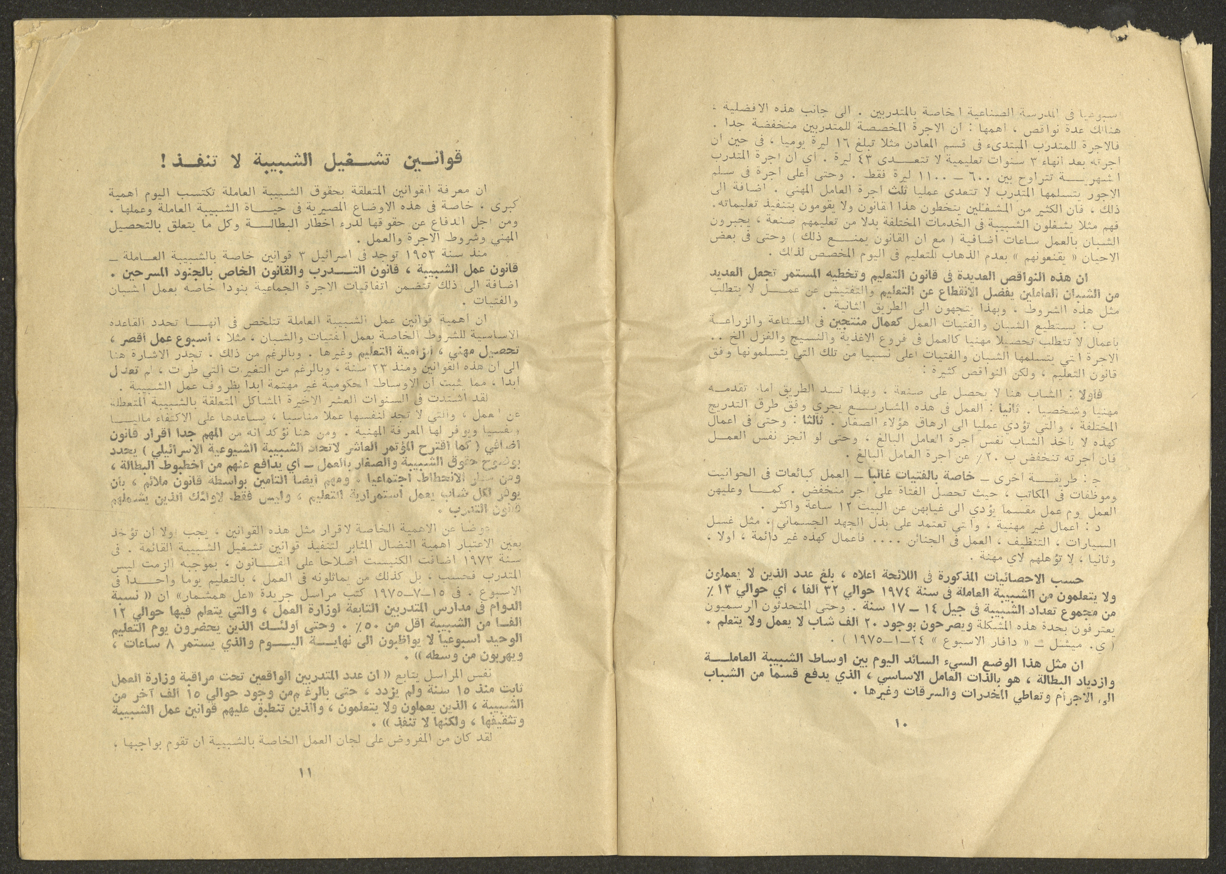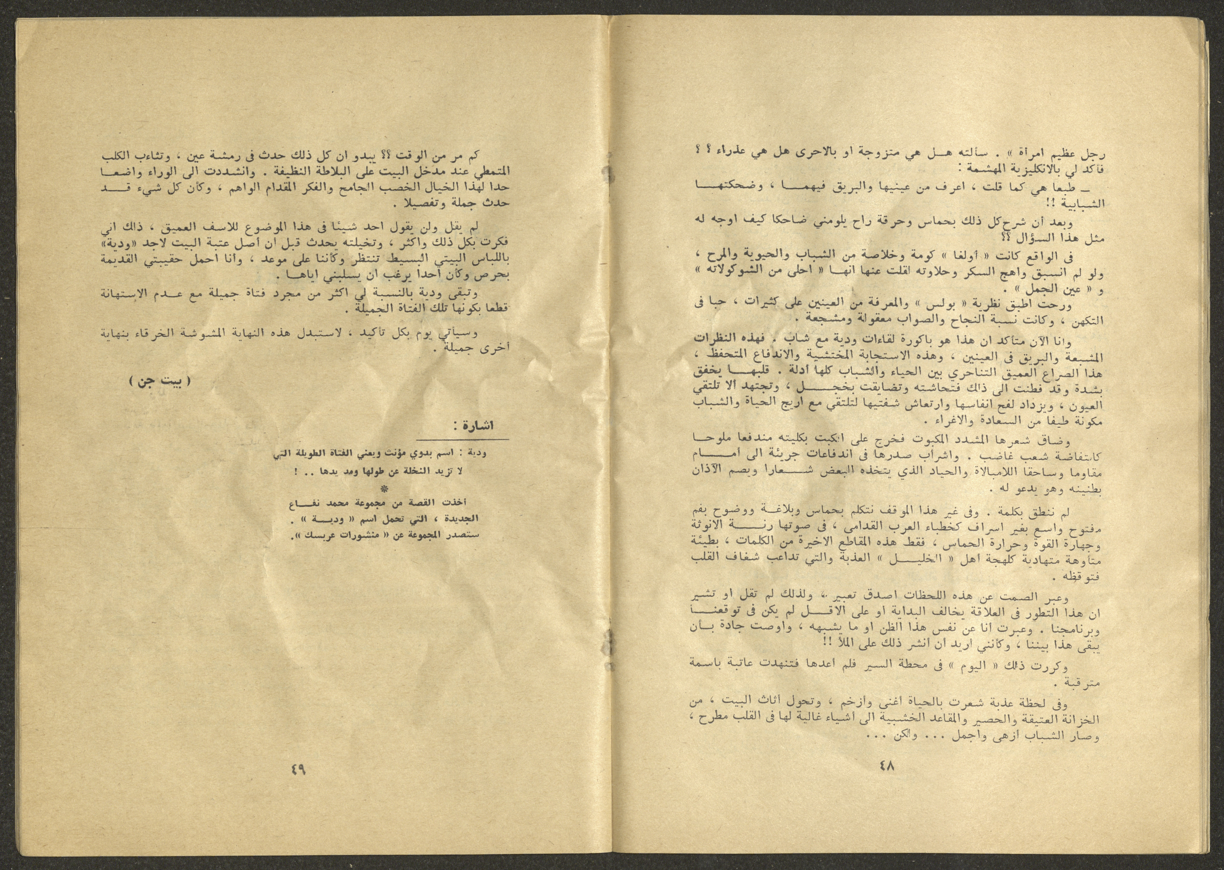 Printed at al-Ittihad Cooperative Press in Haifa, this issue is of al-Jadeed Magazine, which is a monthly magazine of progressive national thought and culture, established in 1851 and its first editor was Hanna Naqqara, while its editor-in-chief was Antoine Shalhat. The issue included the following: 1. The opinion of al-Jadeed by the editor. 2. Statement of Arab writers, poets and artists to public opinion. 3. “On the Youth Working in Israel,” by Yoram Gujansky. 4. “Hub Bela Bedaya Wa Bela Nehaya (Love Without Beginning Nor End)” a poem by Hussein Muhanna. 5. The play "The Prisoner" by Jamal Bannoura. 6. "The Evolution of the Arabic Poetic Language in Form and Content" by Farouk Mwasi. 7. A poem titled "Qabl Kharab al-Basra (Before the Destruction of Basra)" by Nayef Salim. 8. The issue's symposium titled "The Story (of My Village) by Abdel-Hakim Qasem" by Farouk Mwasi. 9. "Ash-Shaheed Wal Qafela (The Shaheed and the Convoy)" a poem by Salim Mwasi. 10. Violation of constitutional and civil liberties in capitalist countries, by Novosti Agency. 11. A "Friendly" story by Muhammad Nafaa. 12. The story "Song of the Next Seasons" by Issam Khoury. 13. The story of "The Chains" by Naji Thahir. 14. “A New Ritual of Departure” poem by Ali al-Battiri. 15. "Alef, Lam, Meem" is a poem by Muhammad Hamzeh Ghanyem. 16. "Taab as-Sabah (The Fatigue of the Morning" poem by Wahib Nadim Wahba. 17. "Al-Atfal Yotaredoon al-Jarad (Children Chasing Locusts)" a poem by Abdel Latif Akl. 18. "Jerahi Lam Tamot (My Wounds Are not Dead)" poem by Abdel-Qadir Saleh. 19. Fadwa Toukan and the poetry of resistance by Fakhri Saleh.